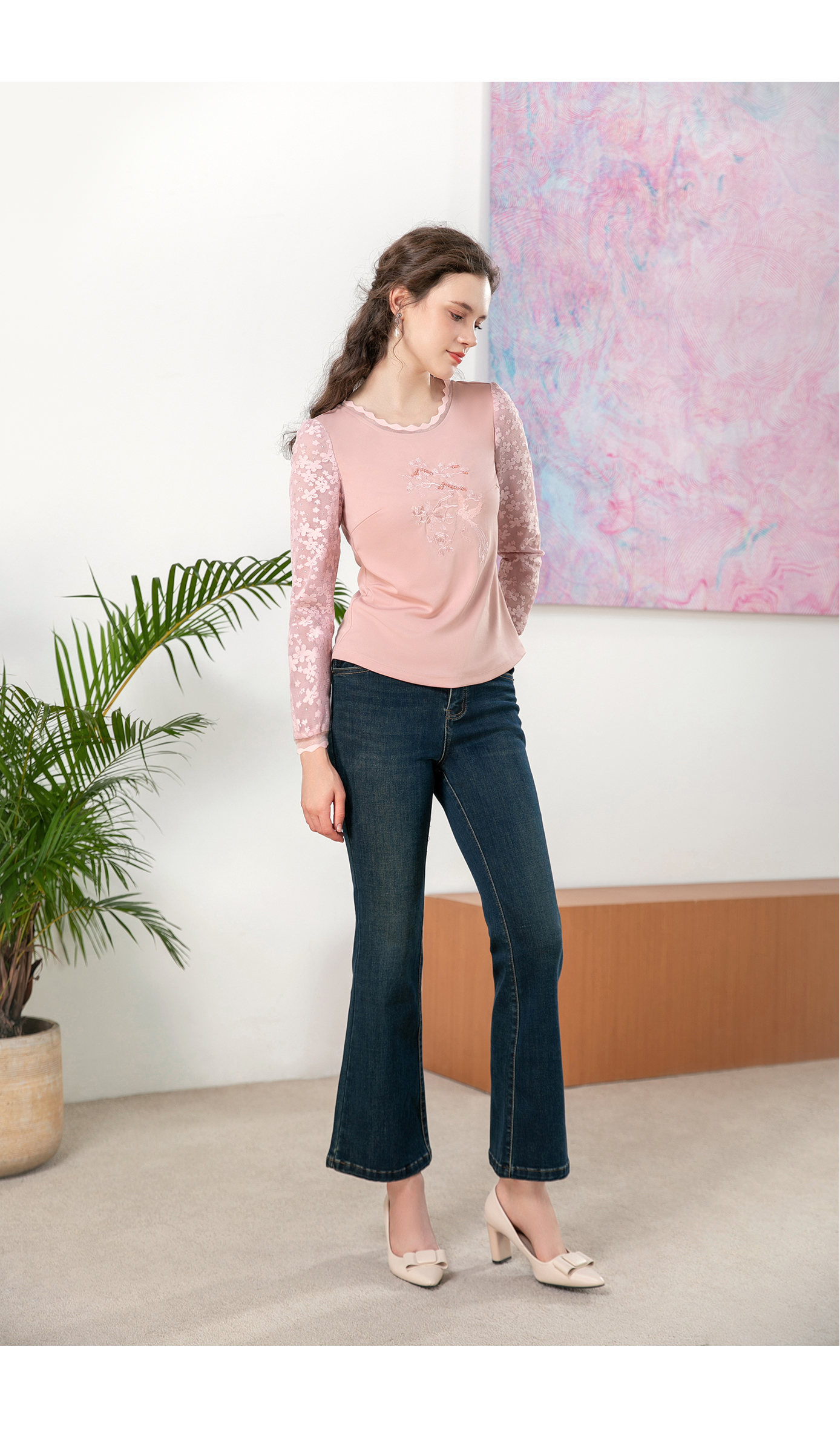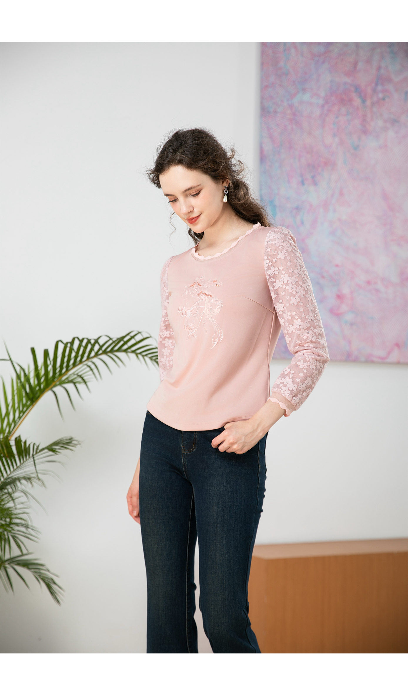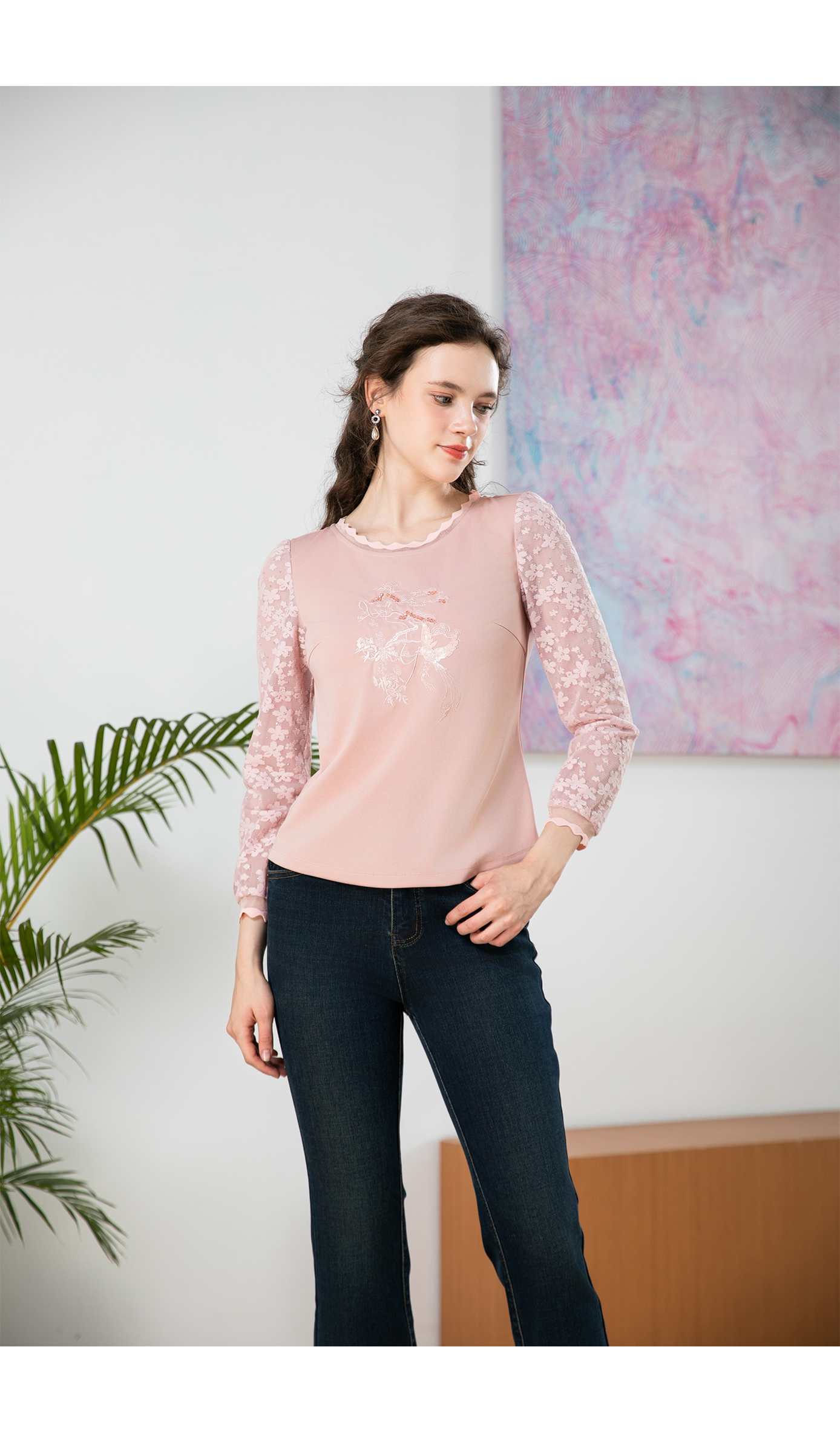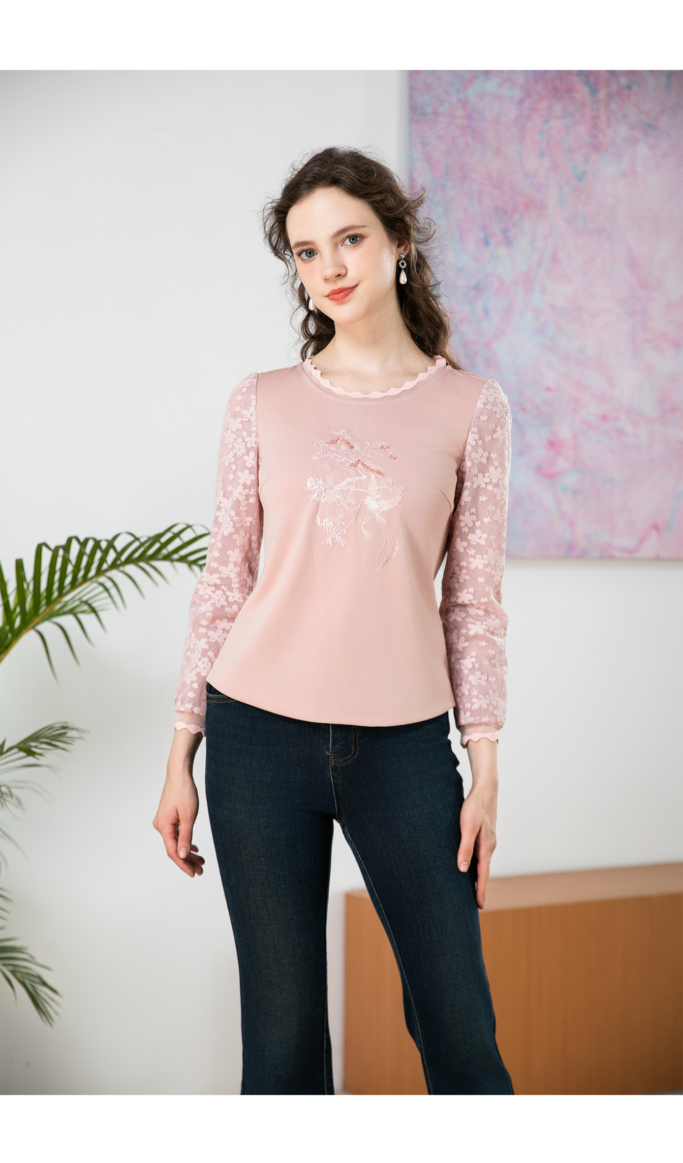 司歌绣花弹力长袖上衣T901281X