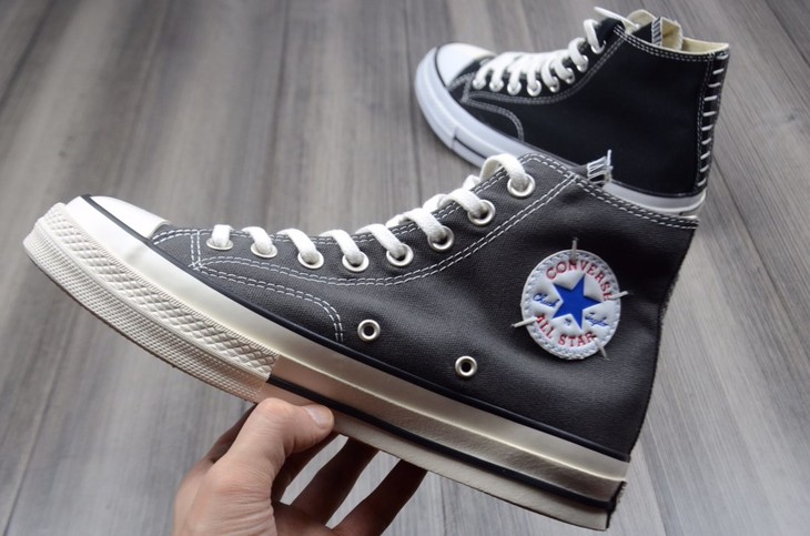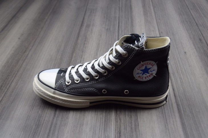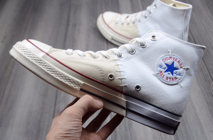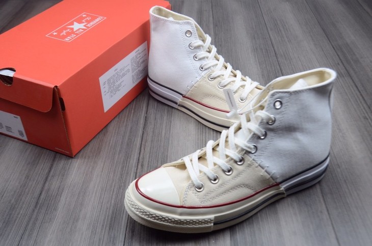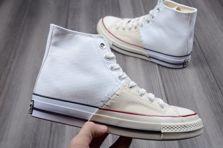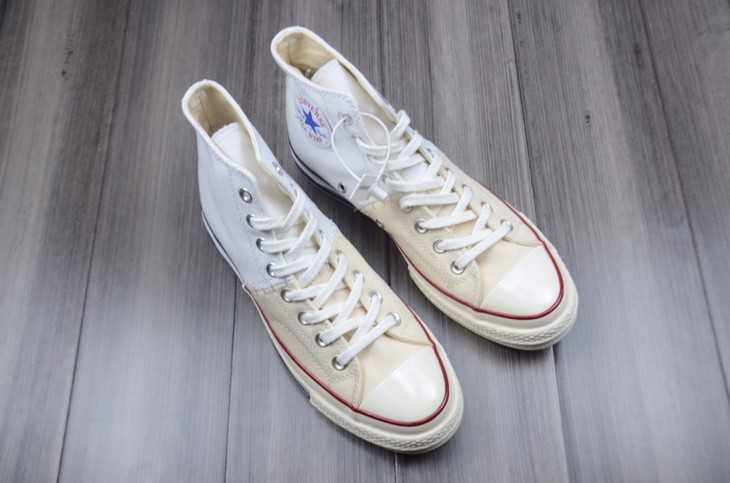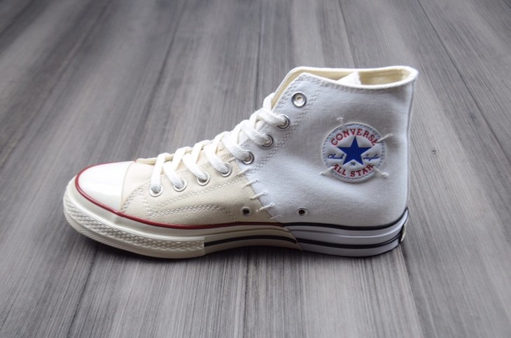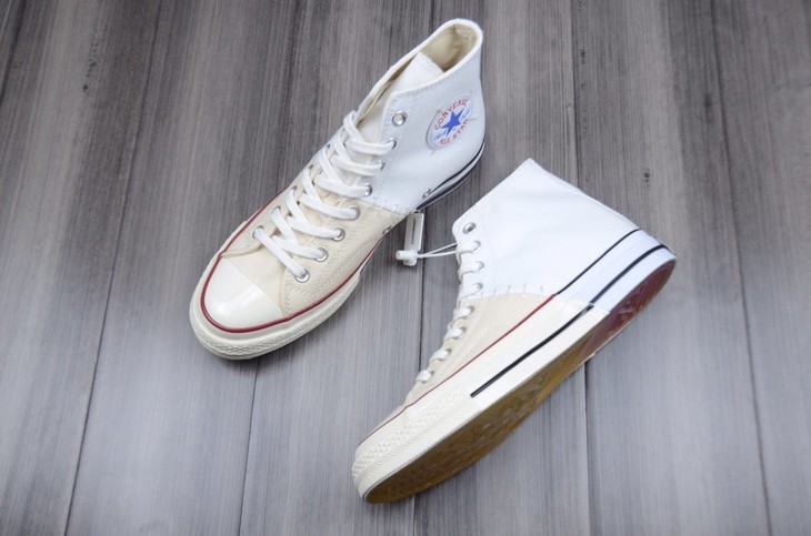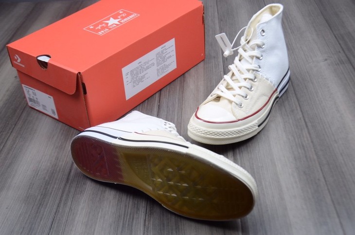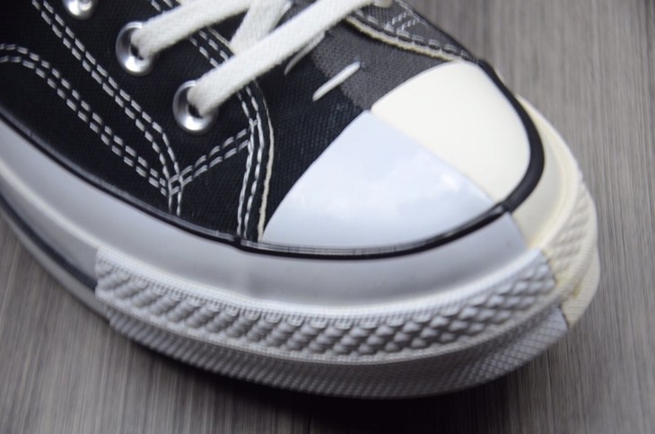 解构系列原装硫化 正确发售版本,硅蓝PU中底制双拼补丁,解构重组效果,匡威Converse Restructured Chuck 1970 高帮硫化休闲运动板鞋“拼接双鞋黑灰米白”164555C
