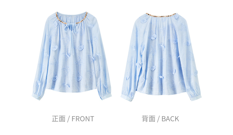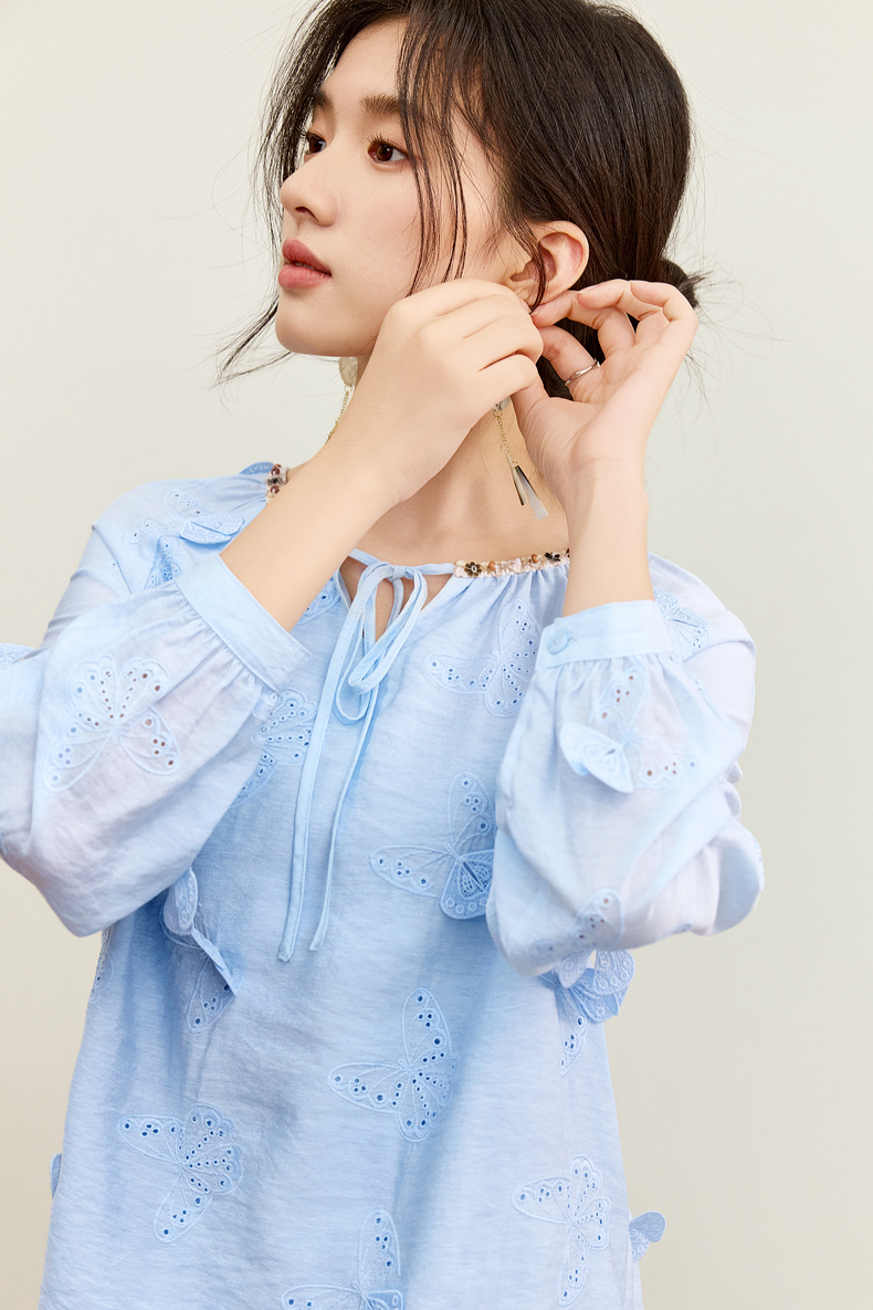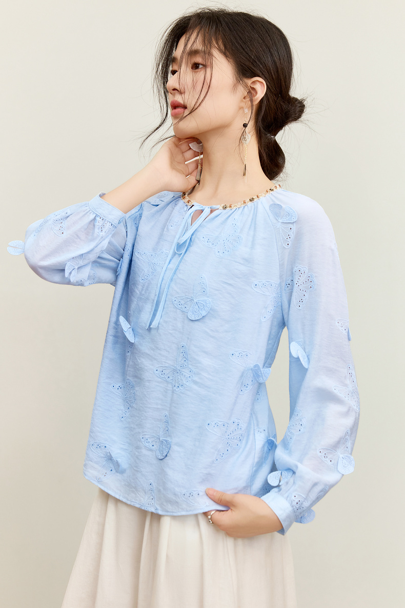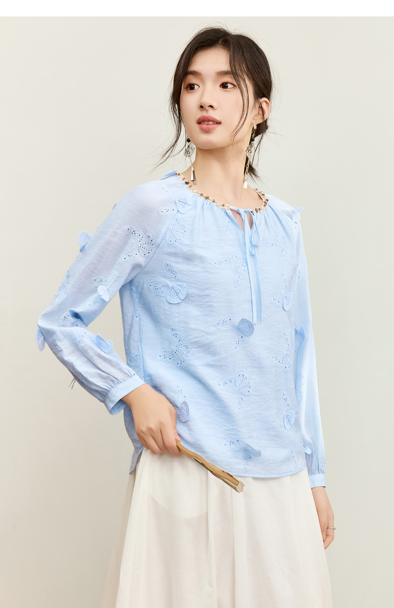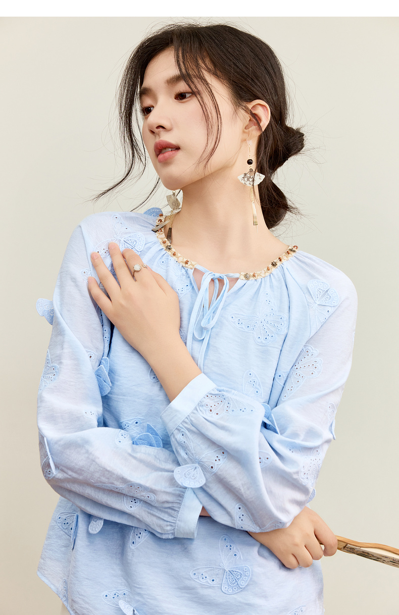 【内购】【灵动蝴蝶】浪漫优雅波西米亚花边系带领插肩袖宽松显瘦雪纺衫-153VA3819