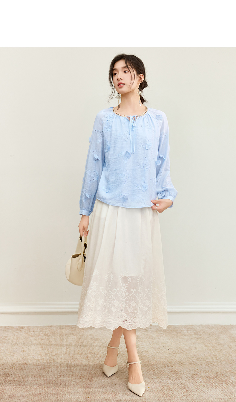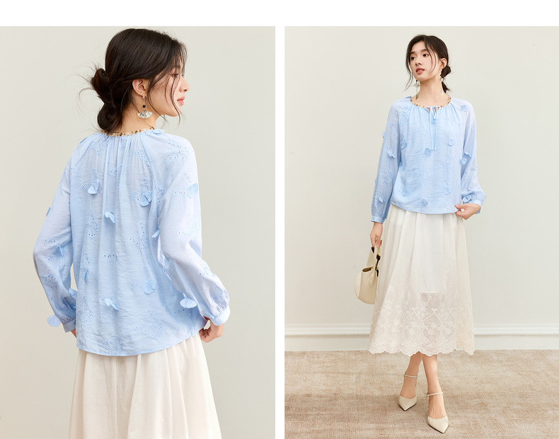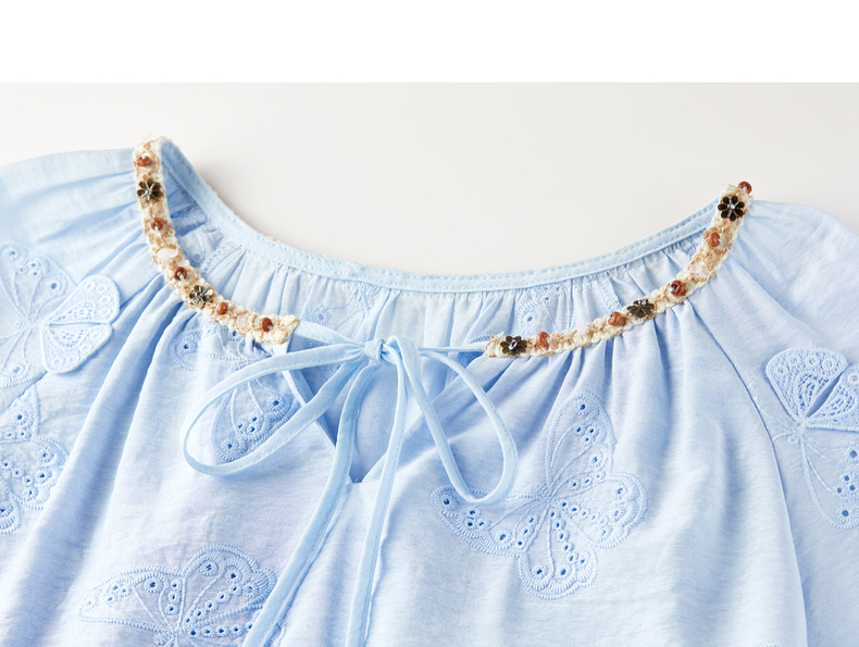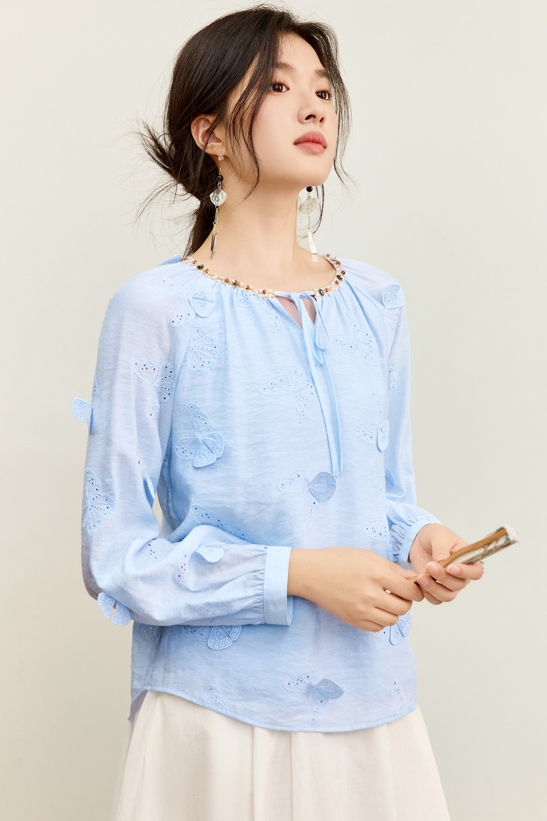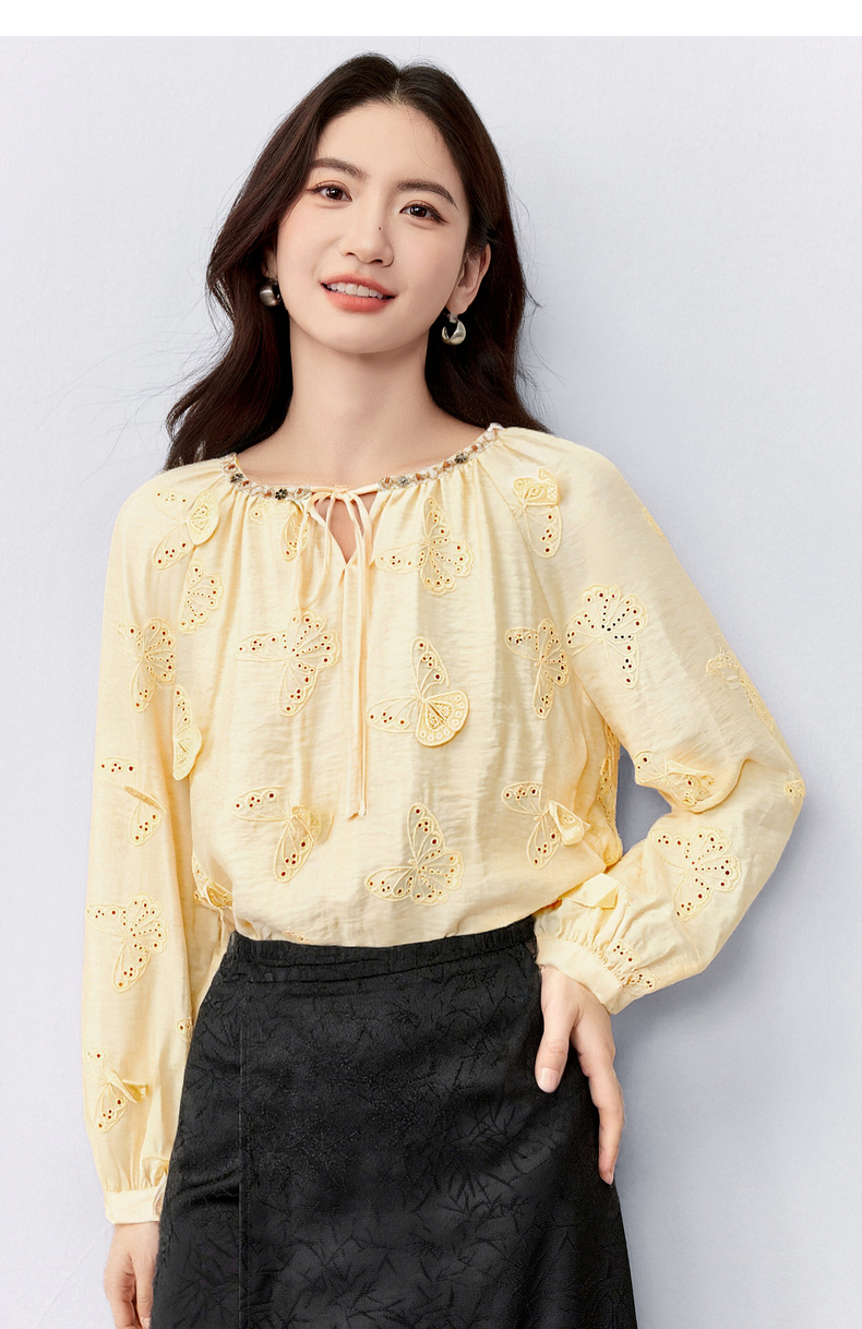 【内购】【灵动蝴蝶】浪漫优雅波西米亚花边系带领插肩袖宽松显瘦雪纺衫-153VA3819