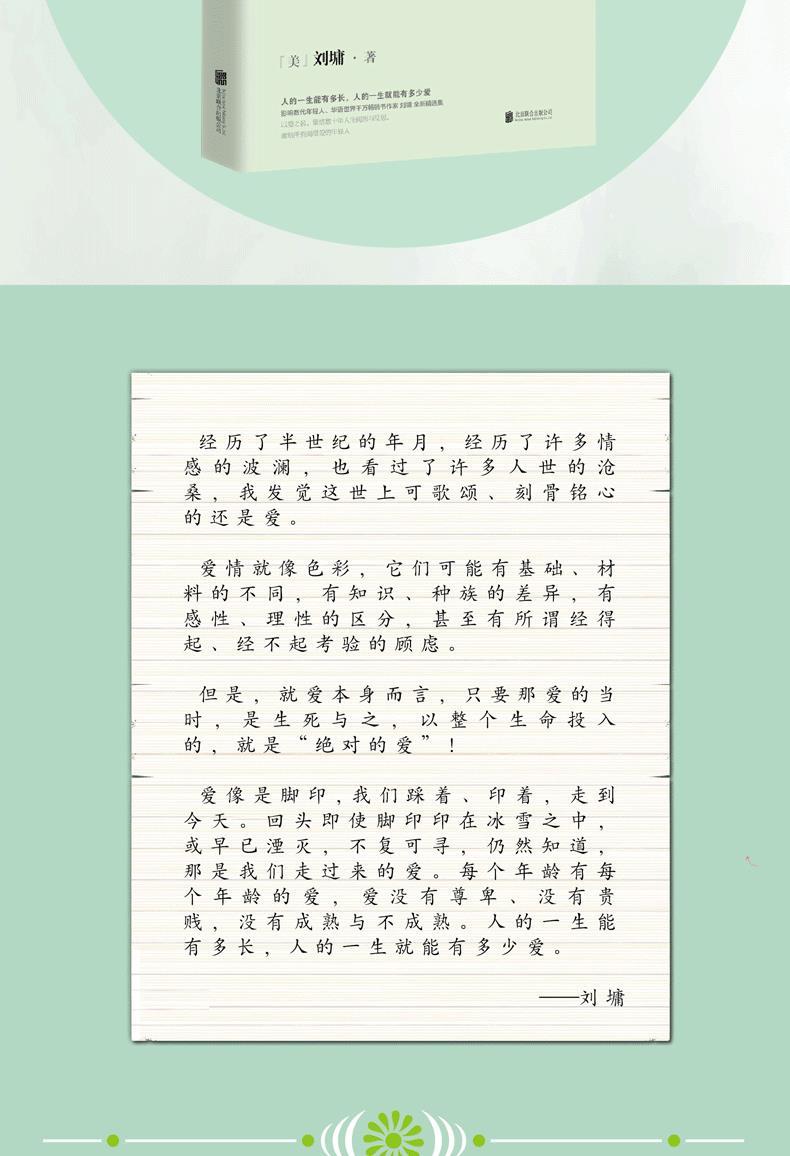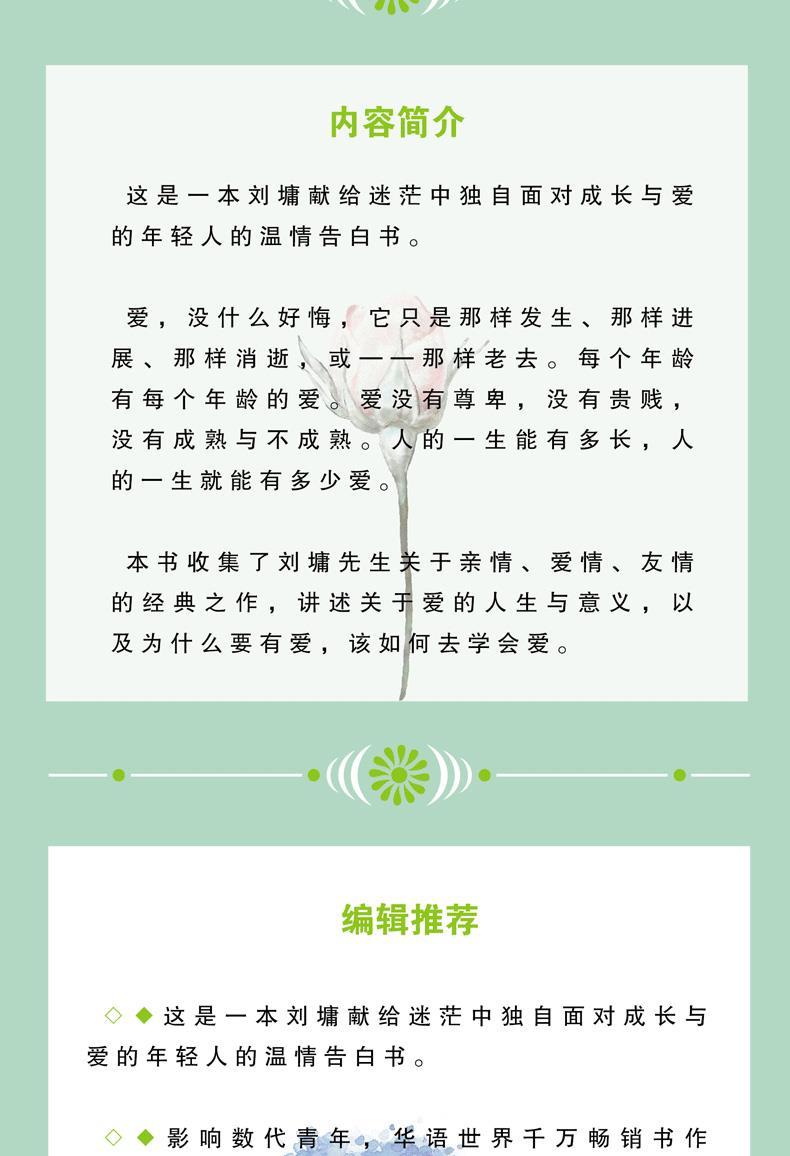 ★这是一本刘墉献给迷茫中独自面对成长与爱的年轻人的温情告白书。★影响数代青年,华语世界千万畅销书作家、生活哲学家、励志大师 刘墉 全新精选集。★收录刘墉有关亲情、爱情、友情的经典之作,讲述关于爱的人生与意义。★小故事、小道理、小镜头、小幽默中折射出大智慧、大人生、大视野、大成功。