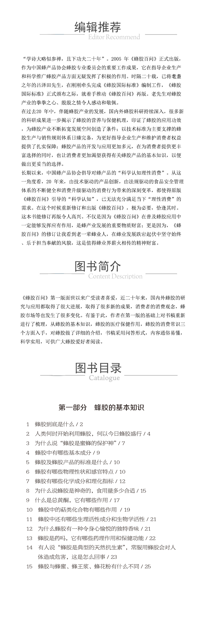 《蜂胶百问》自2005 年出版发行,近二十年来,国内外蜂胶的研究与应用都取得了很大进展,也取得了很多新的成果,消费者的消费观念,蜂胶市场也发生了很多变化。 首先,原来引用的很多数据,随着相关研究的进展发生了很多变化,此次再版予以了调整和更新。 其次,鉴于蜂胶的研究和应用取得了很多新的进展,借本次再版进行了相关的调整、补充和解答。 针对不少读者提出的诸如“蜂胶及蜂胶产品的标准是什么?为什么说蜂胶是紫色黄金?复方蜂胶是怎么回事?效果会更好吗?蜂胶含有激素吗?中国牵头起草的《蜂胶国际标准》被正式批准发布,能否介绍一下?《蜂胶国际标准》与我国《蜂胶》国家标准有何不同?”等新的问题,编者都一一做了解答。 为使本书再版的内容更具科学性,编者特邀了中国蜂产品协会蜂胶专业委员会首席专家、浙江大学动物科学学院胡福良教授,以及中国蜂产品协会蜂胶专业委员会周萍、卢岗两位专家参加了解答,并对再版的内容进行了审核把关。 为满足一些读者想更深入了解国内外蜂胶研究应用进展情况的需要,特将胡福良教授团队所著124.1 万字的《蜂胶研究》摘要版《国内外蜂胶研究动态》(节选)作为附录1 编入了本书。 限于水平,对本书的不妥和疏漏之处,热忱希望各位读者给予指正,以便今后继续补充和提高。 中国蜂产品协会蜂胶专业委员会主任委员 2023年12月28日于北京