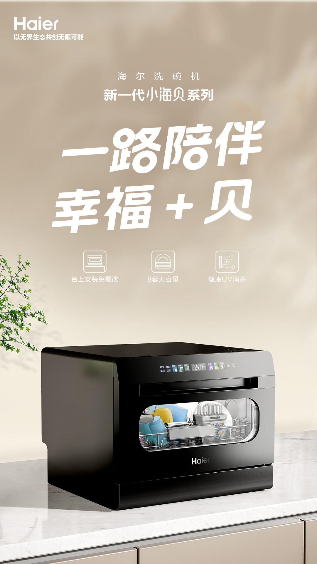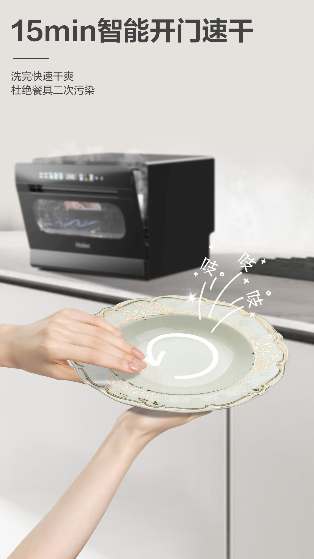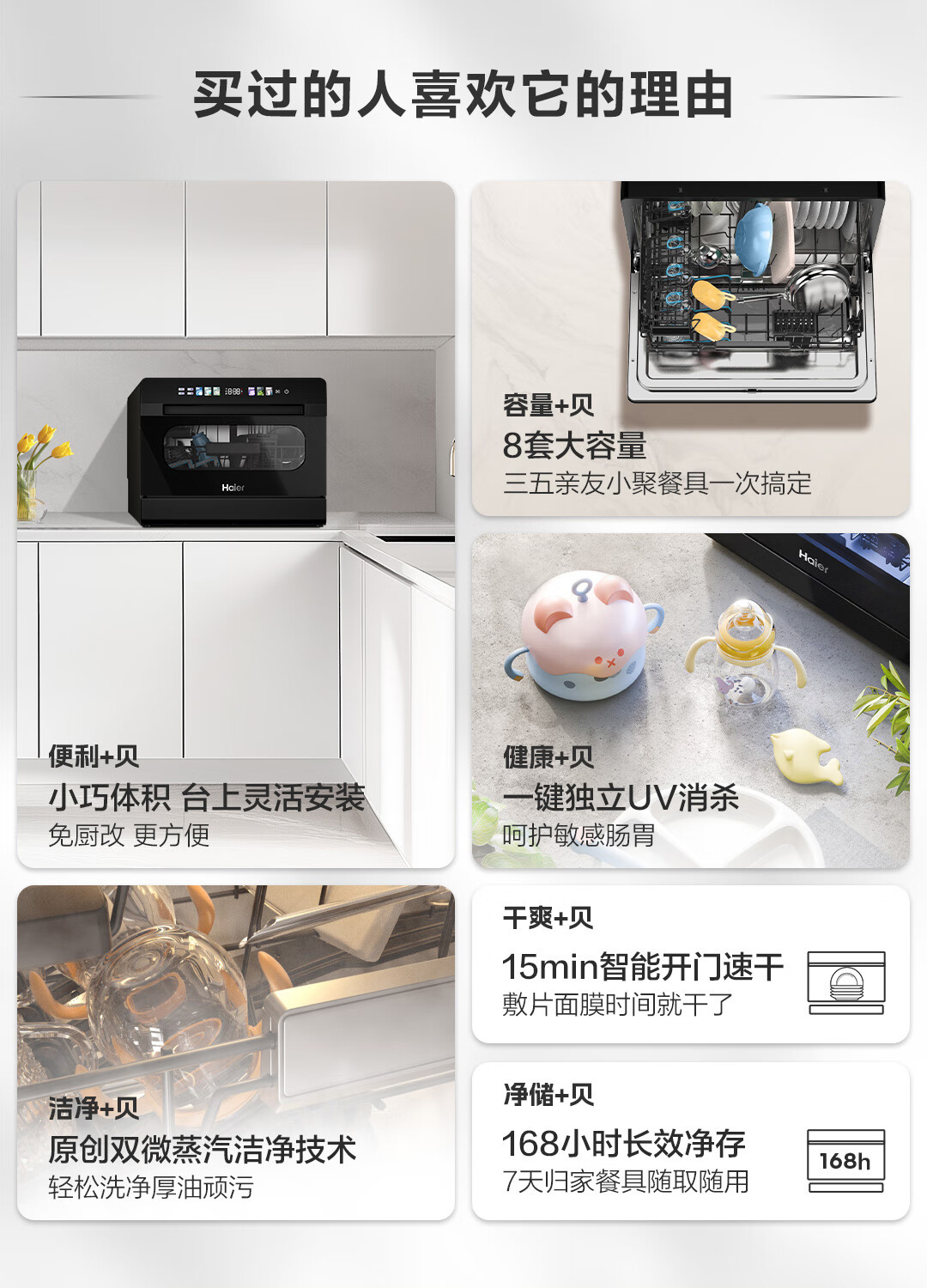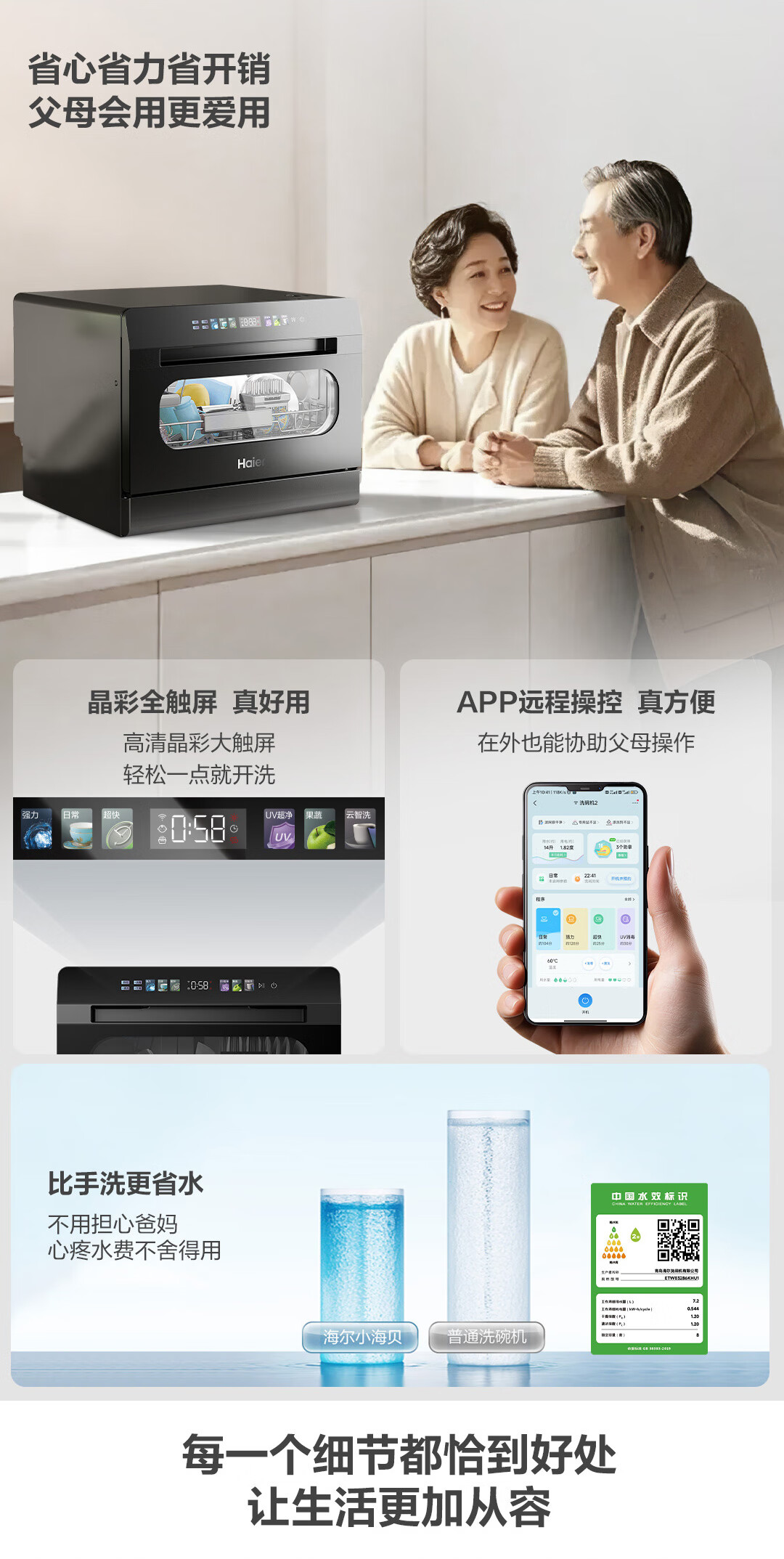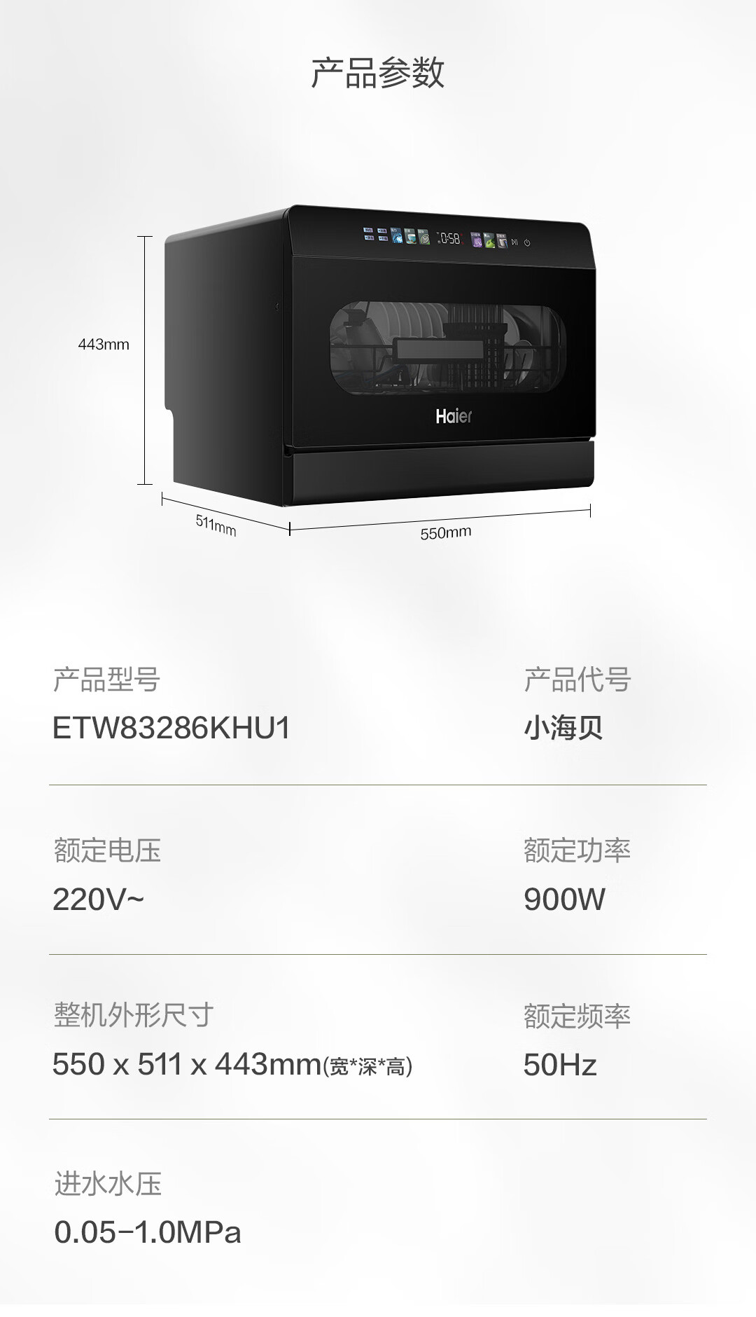 海尔(Haier)双面洗台式洗碗机小海贝 8套容量 晶彩全触屏 洗消一体 自动开门速干 7天存储ETW83286KHU1