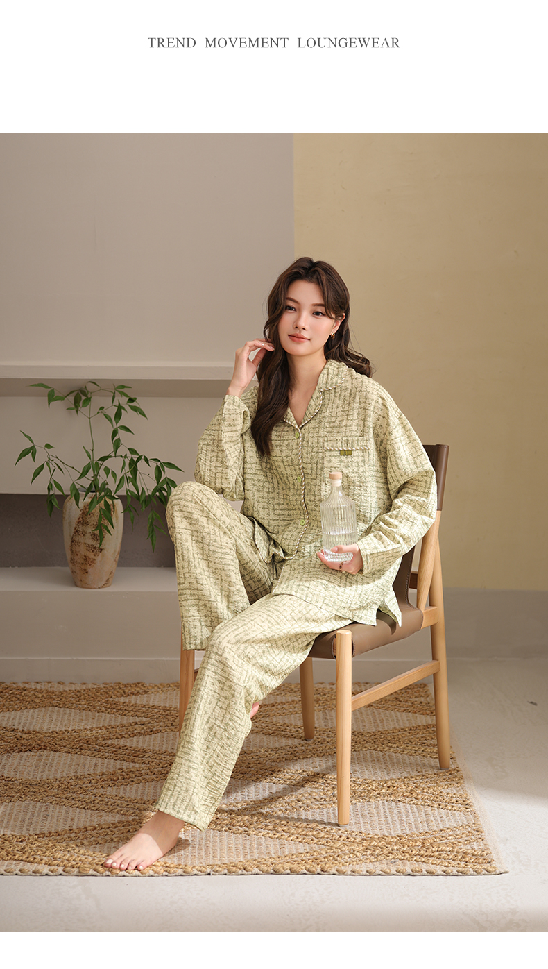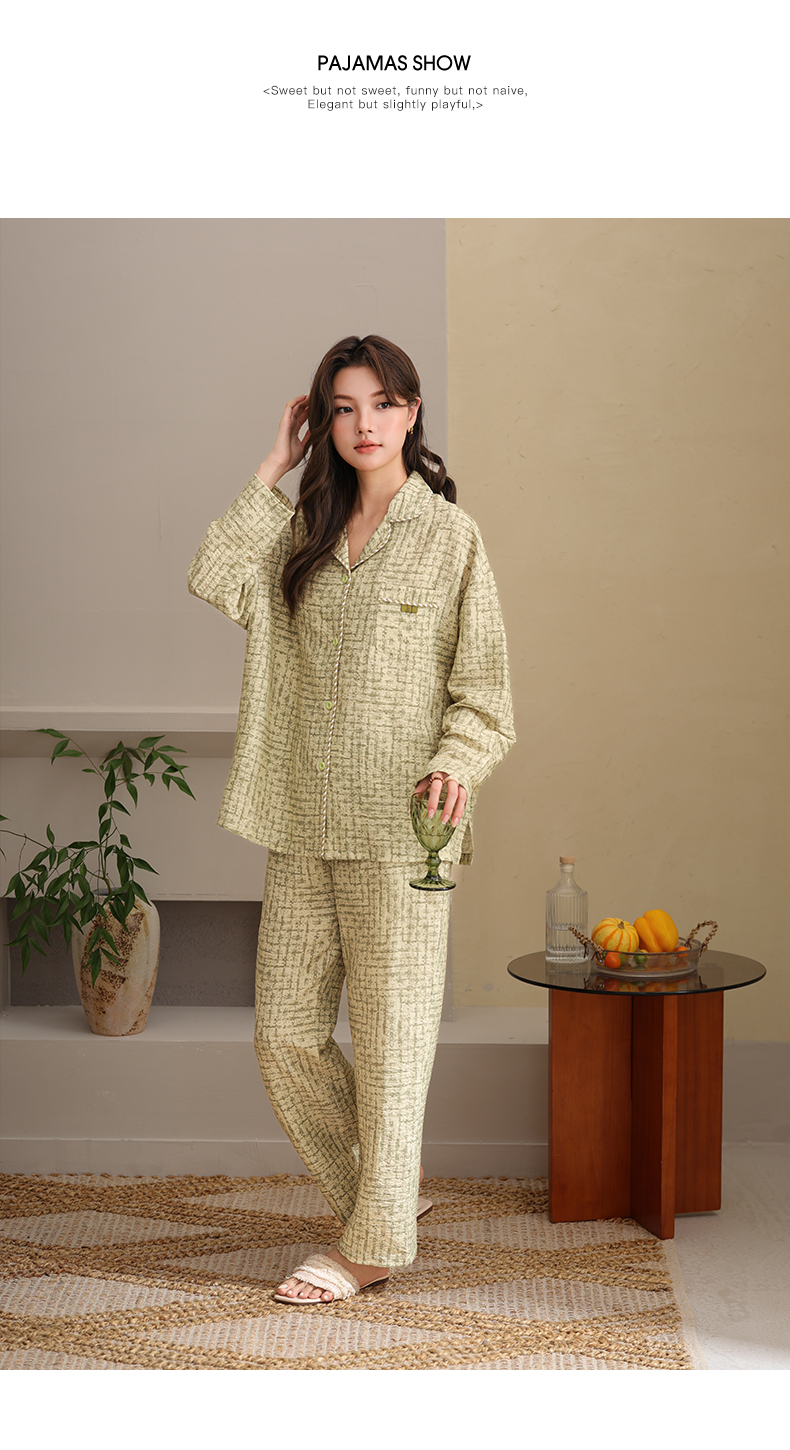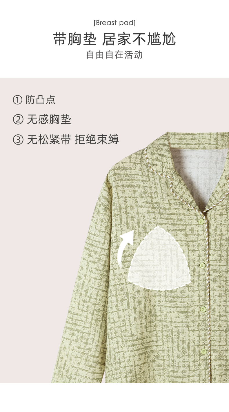 可人儿春秋季带胸垫泡泡绵女士长袖长裤睡衣可外出小众家居服套装