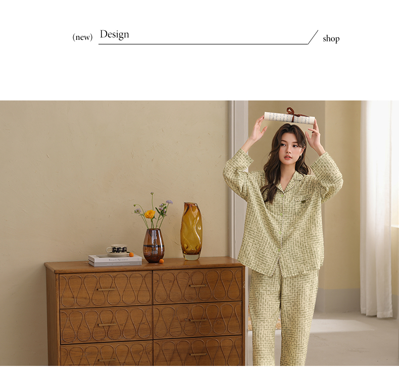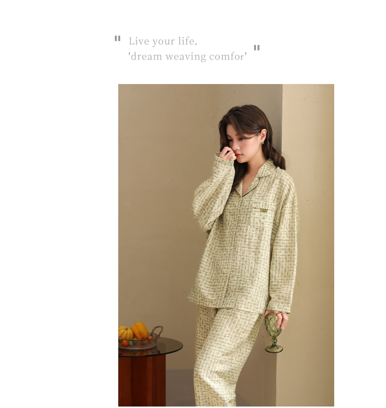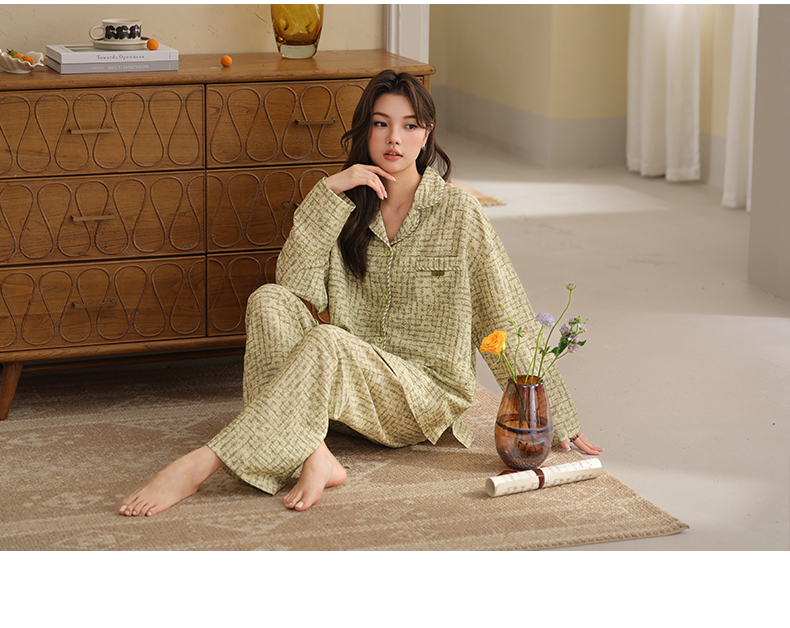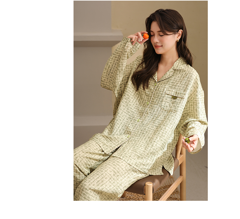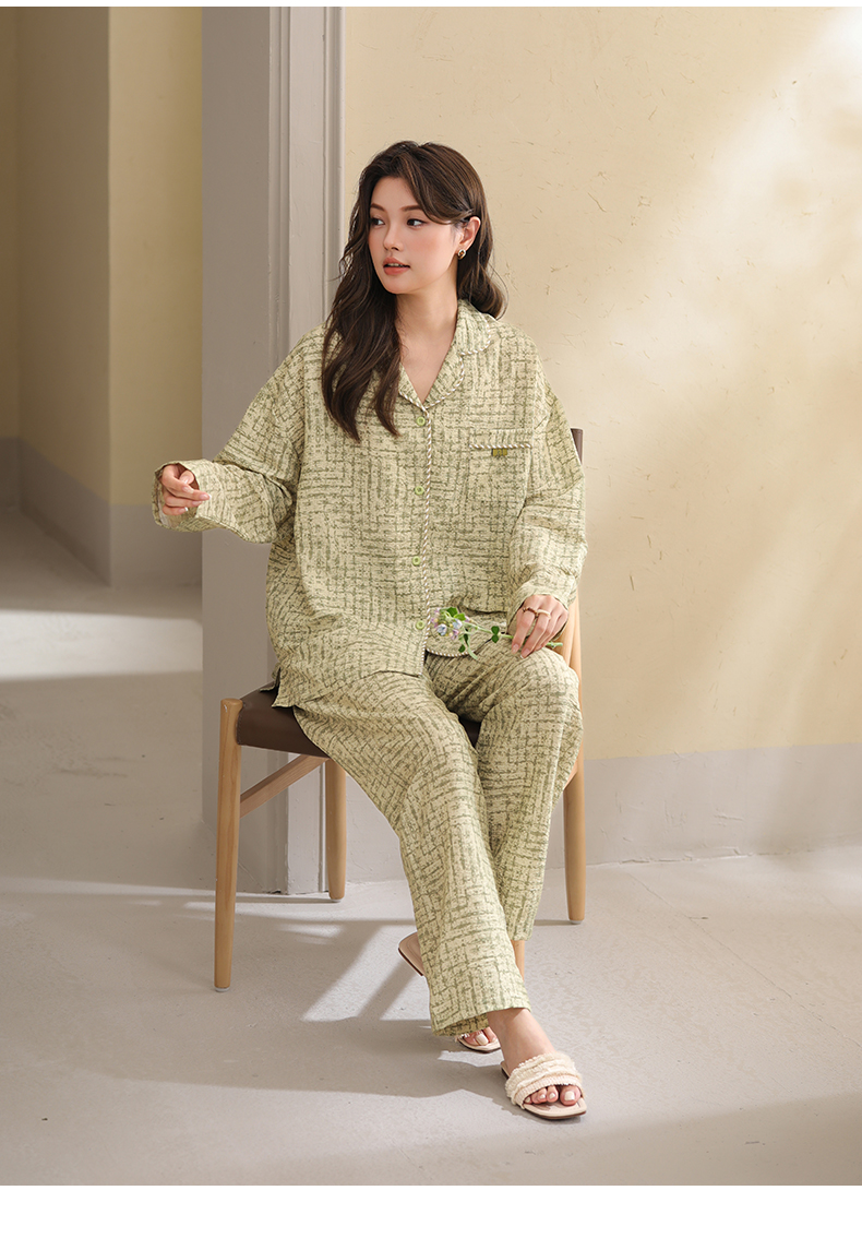可人儿春秋季带胸垫泡泡绵女士长袖长裤睡衣可外出小众家居服套装