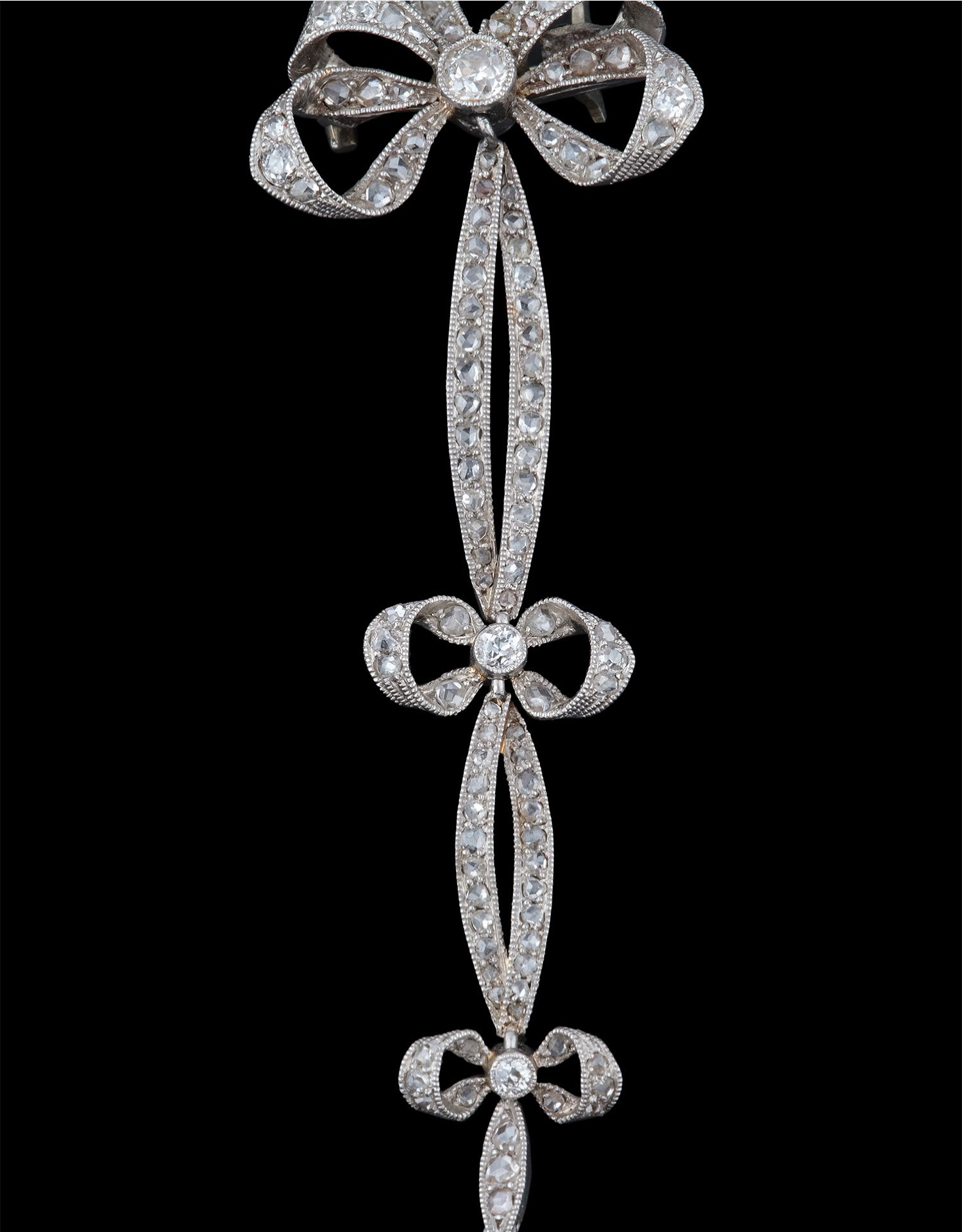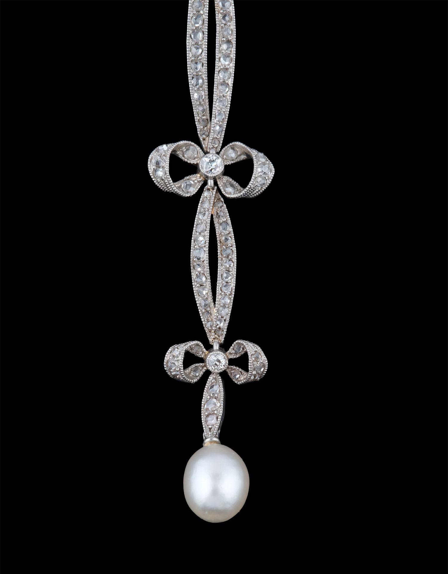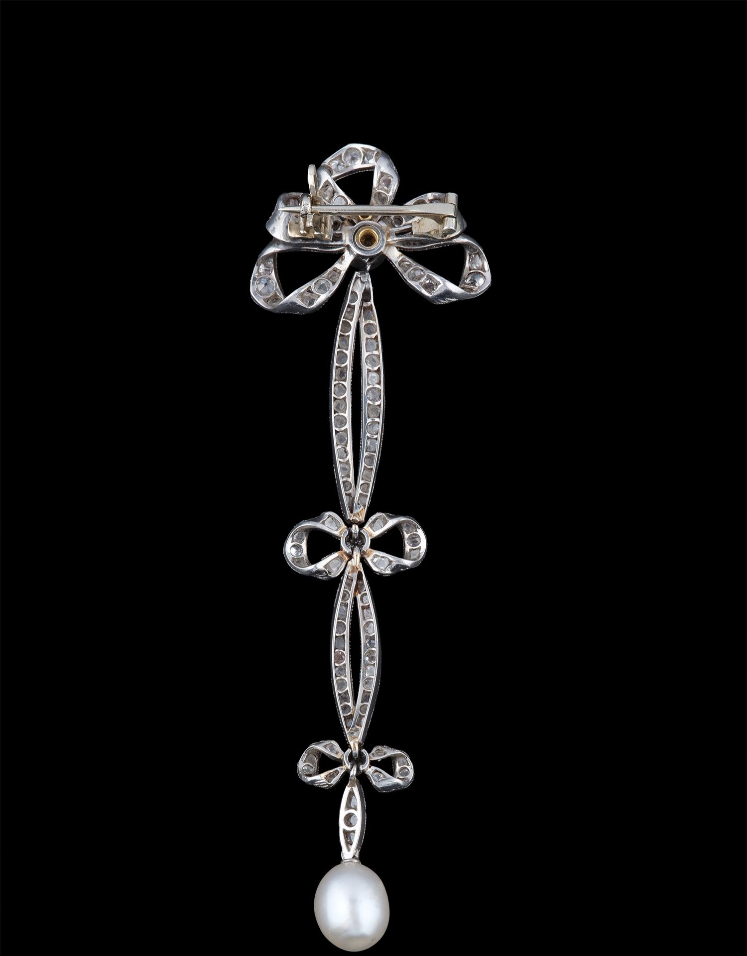 独角鹿西洋古董法国美好时代风格铂金镶钻石珍珠蝴蝶结缎带胸针