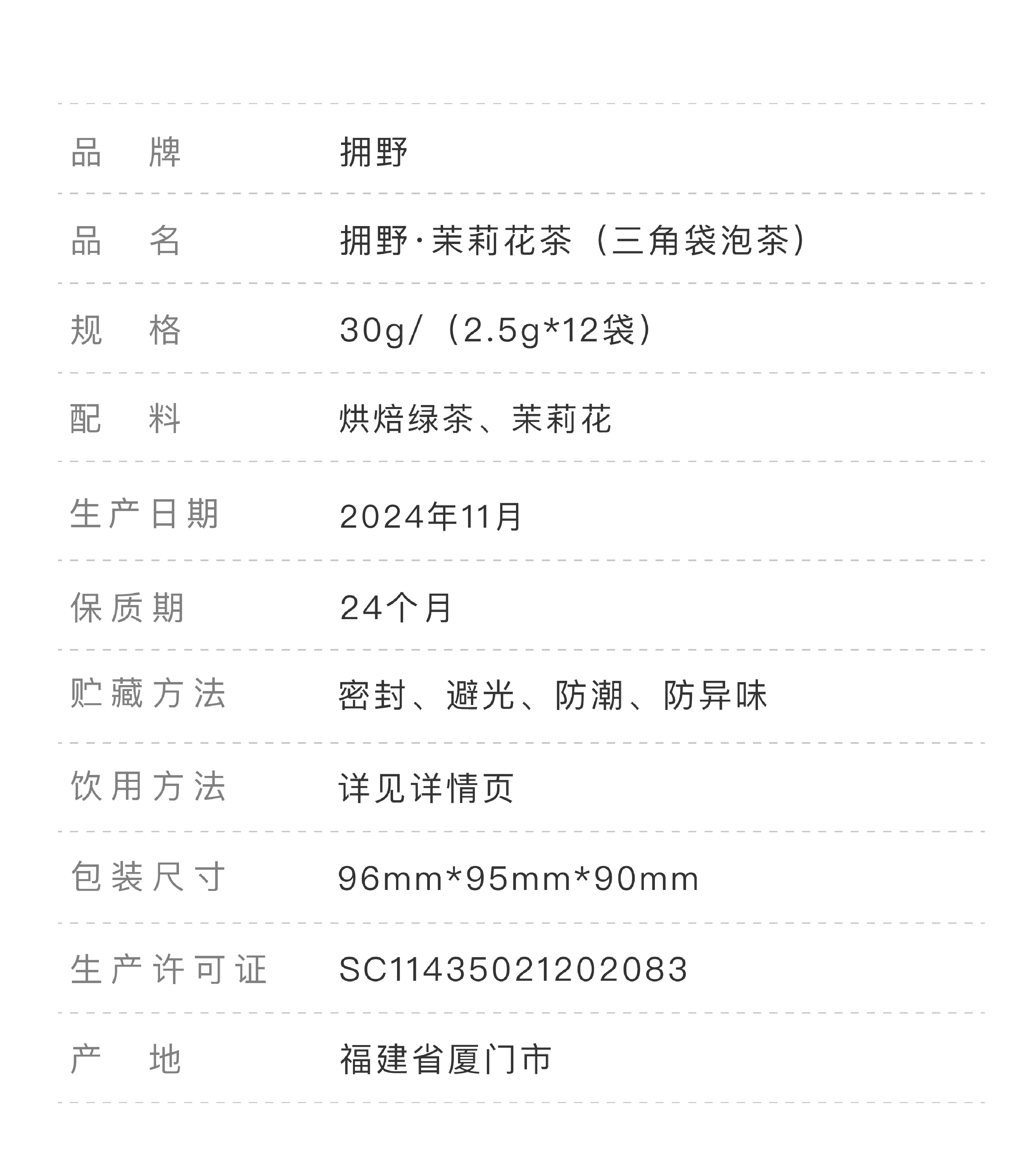 拥野·茉莉花茶 三角袋泡茶 2.5gx12袋/盒