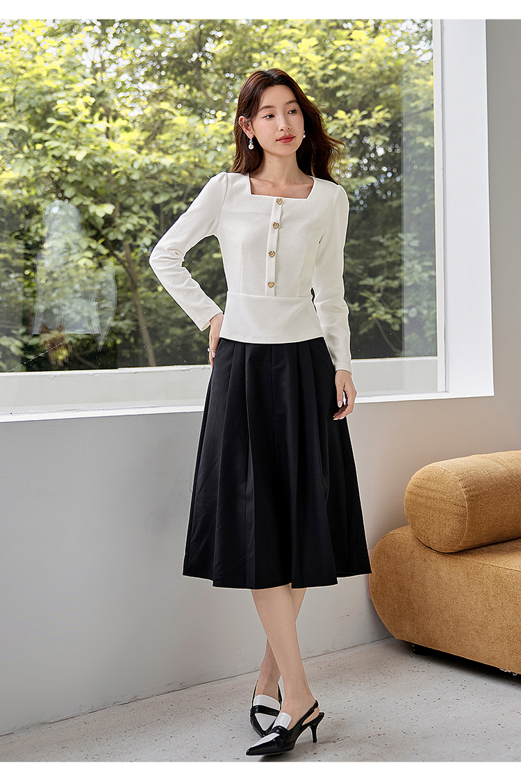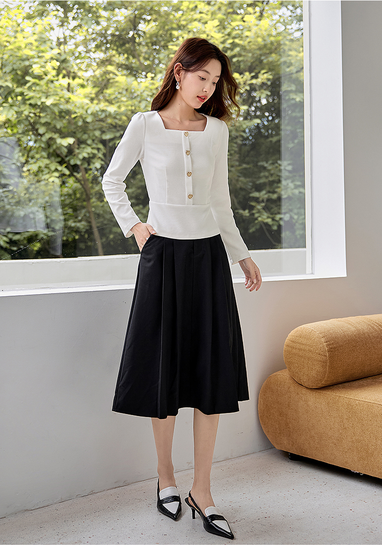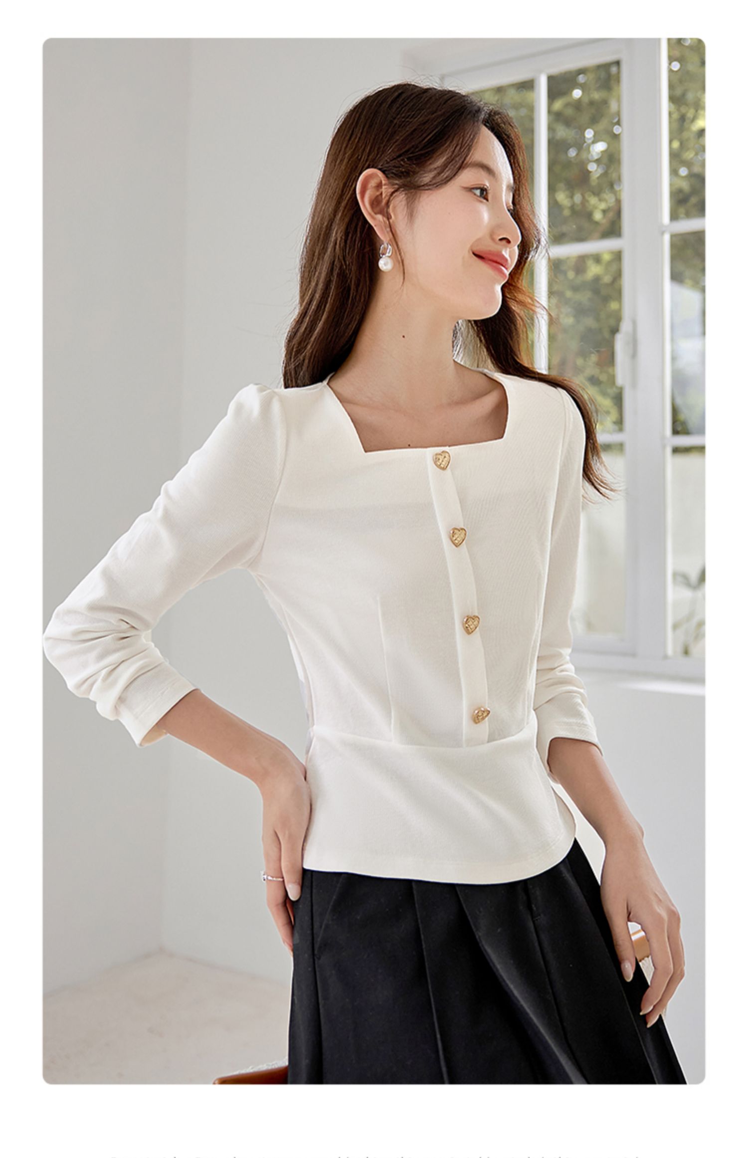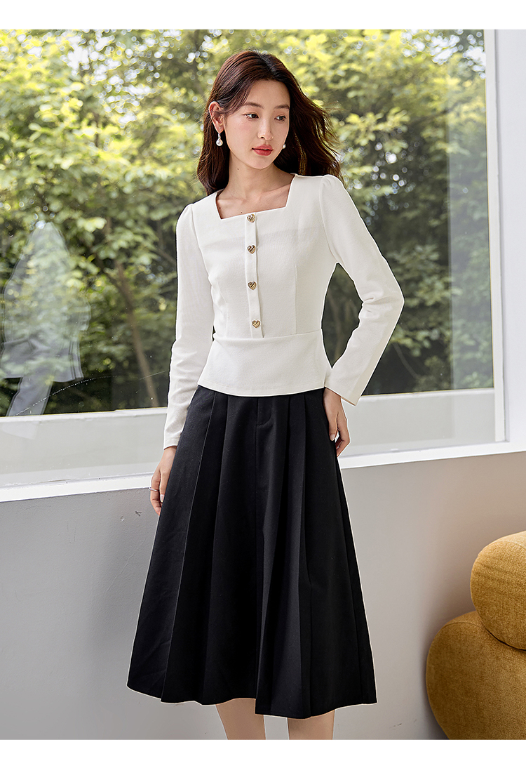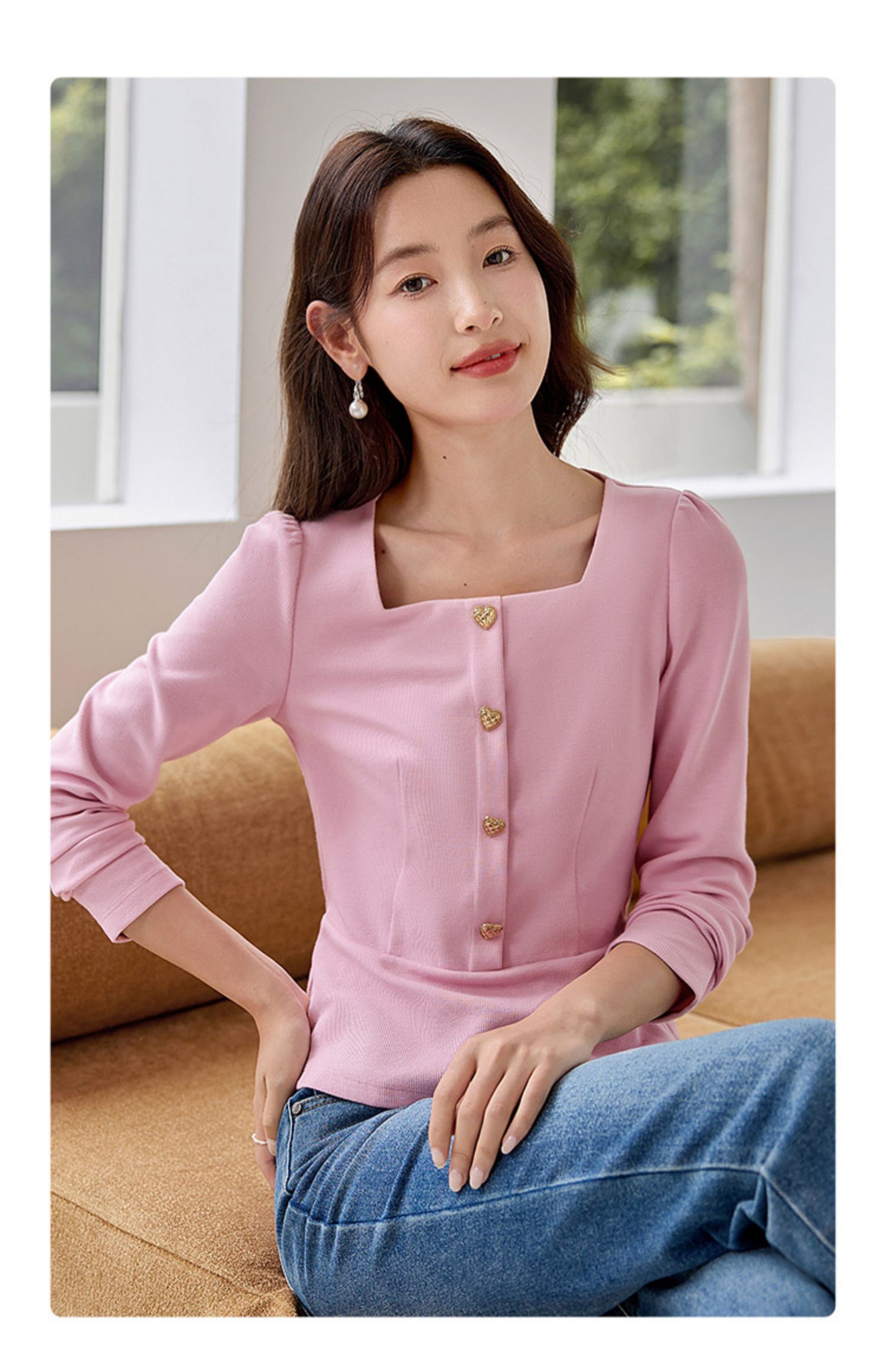 【五折购】熙世界法式方领针织衫女2025秋季新款收腰时尚洋气长袖T恤上衣