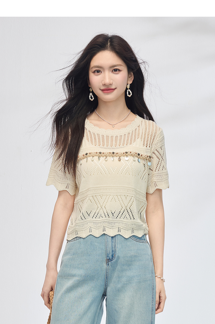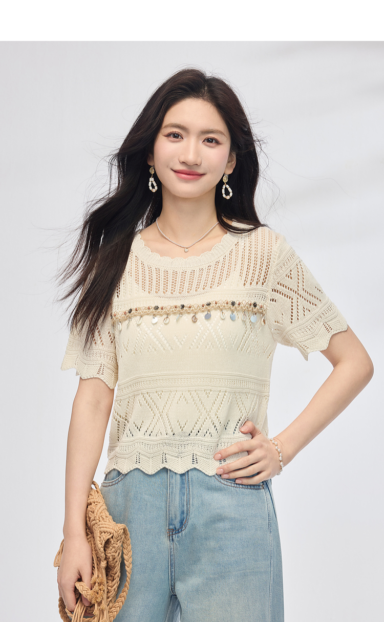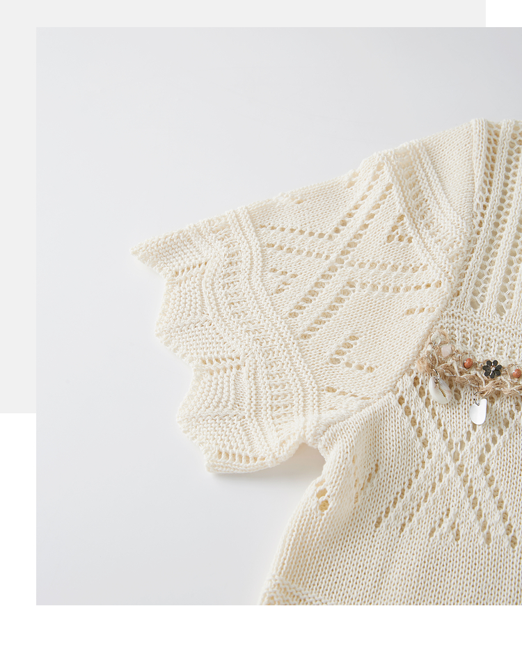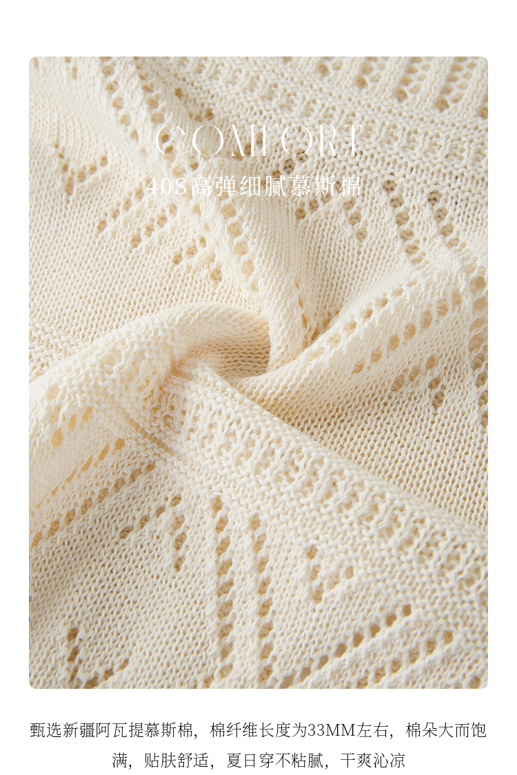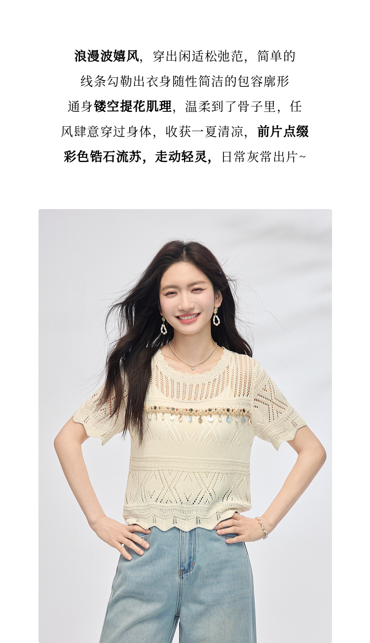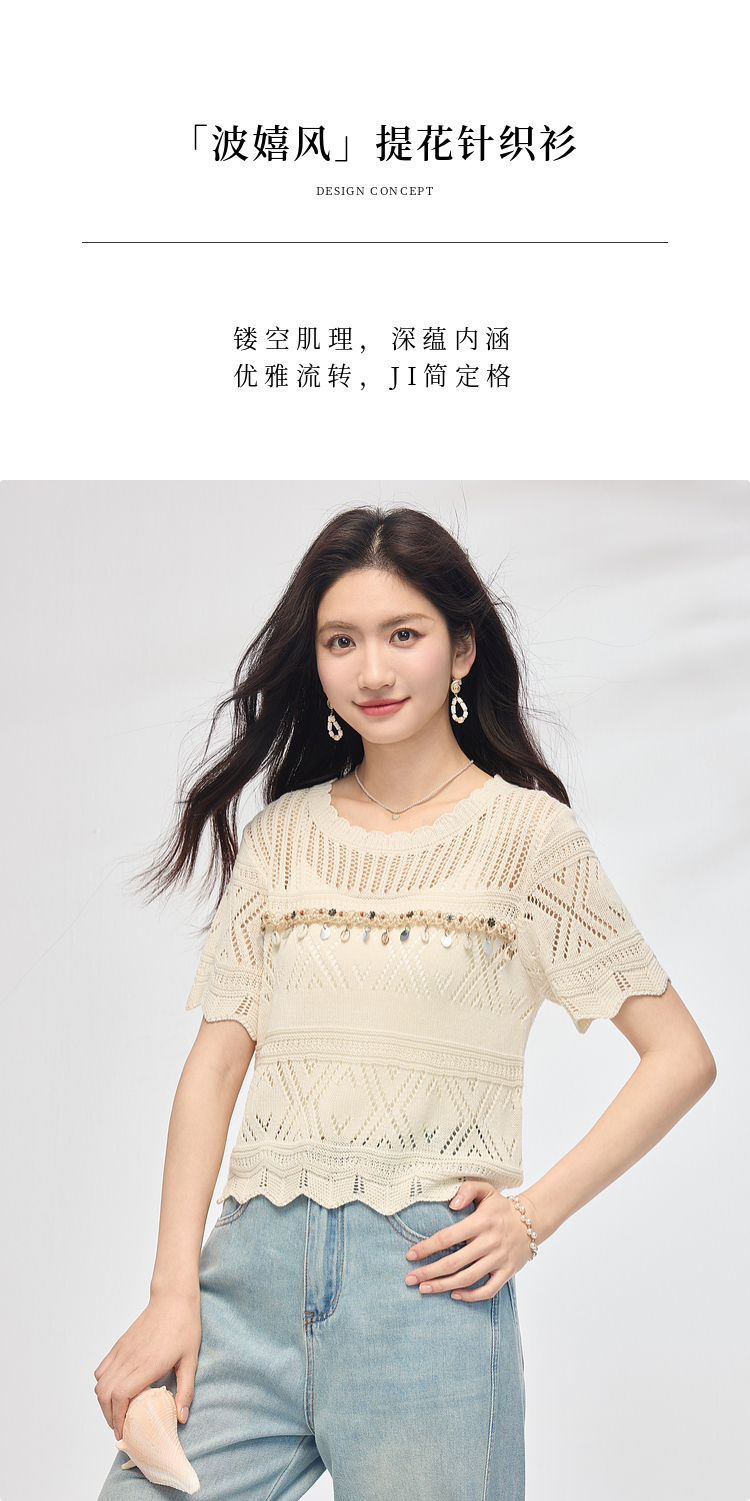 熙世界重工镂空提花针织衫女夏薄款2025新款休闲宽松短袖罩衫上衣