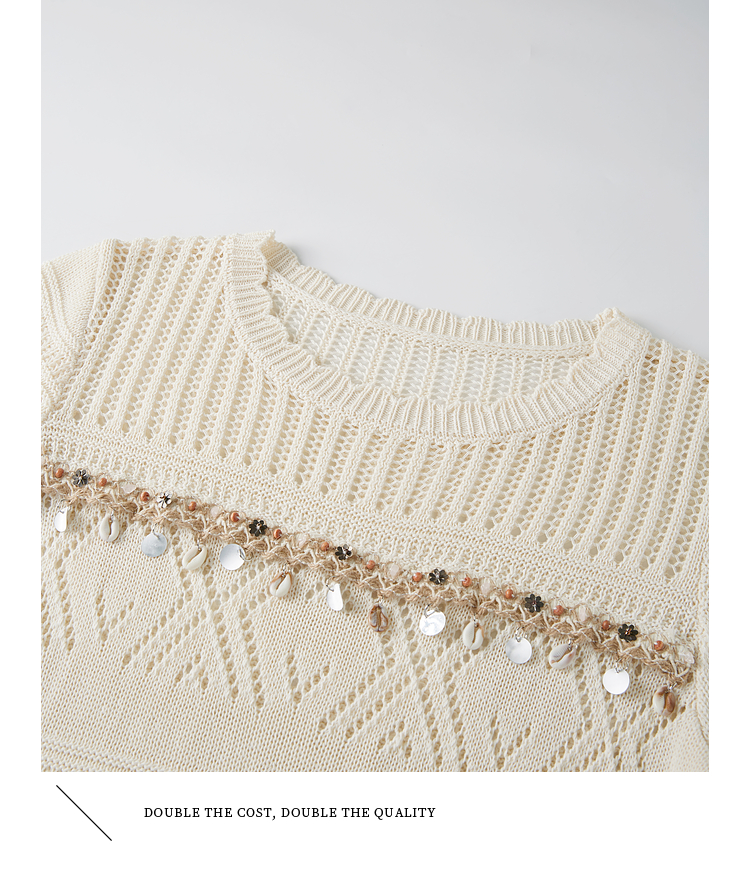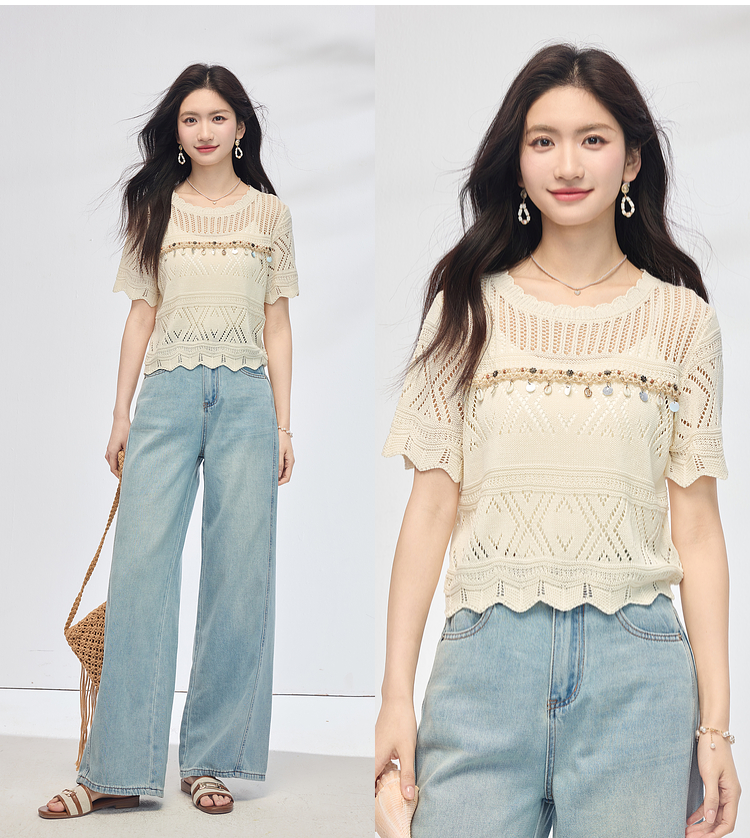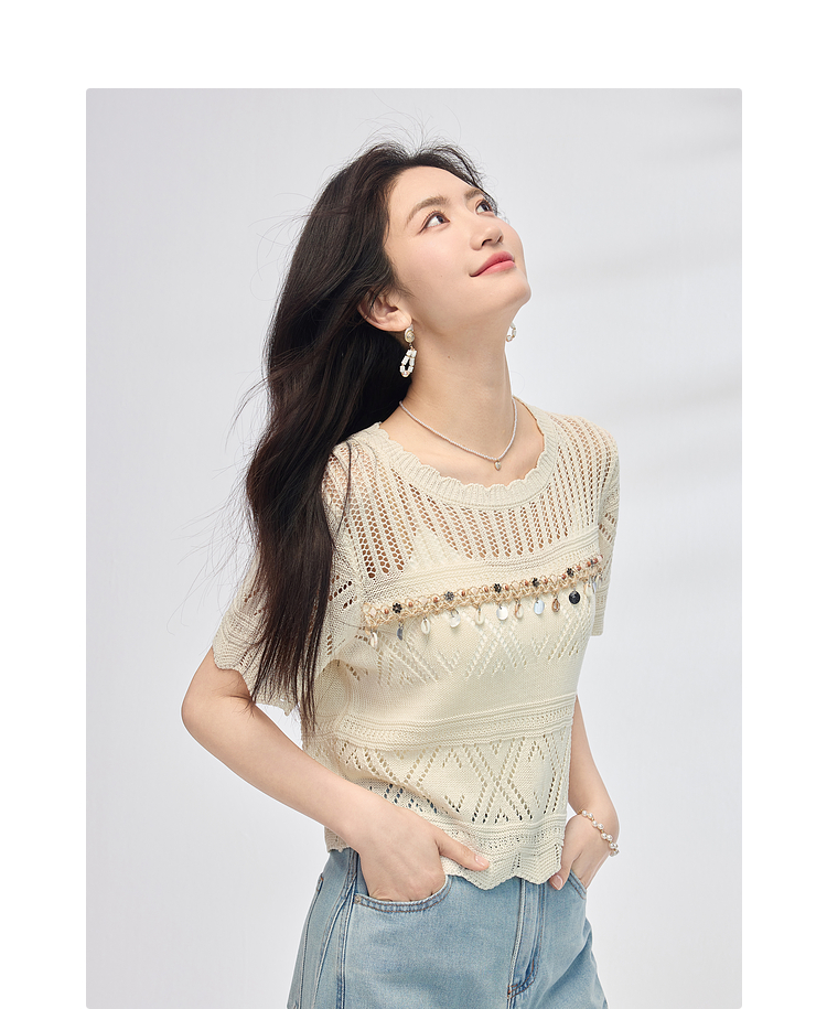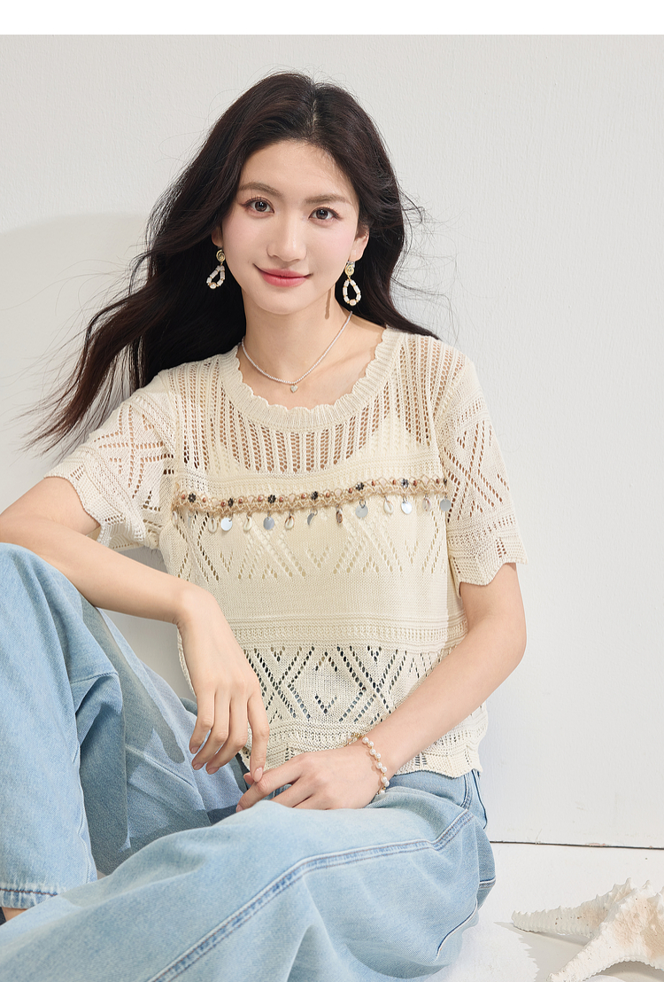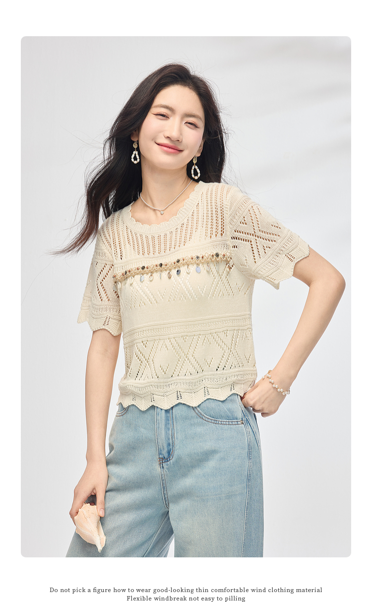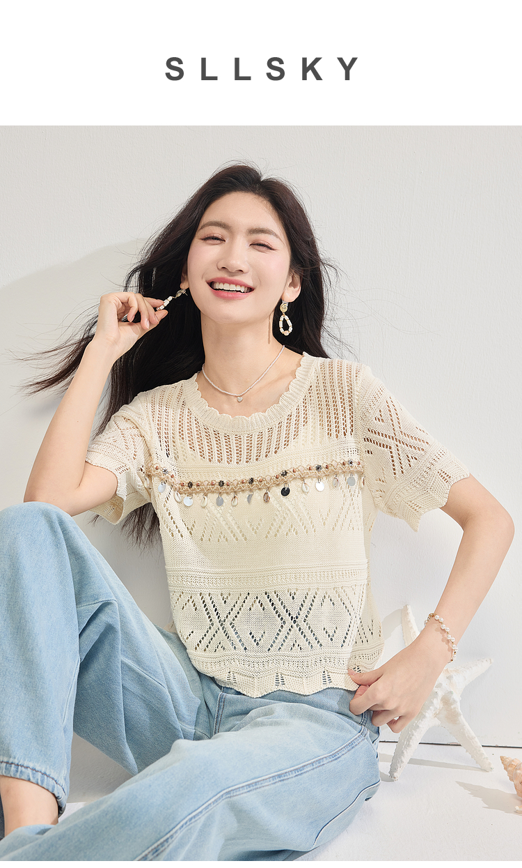 熙世界重工镂空提花针织衫女夏薄款2025新款休闲宽松短袖罩衫上衣