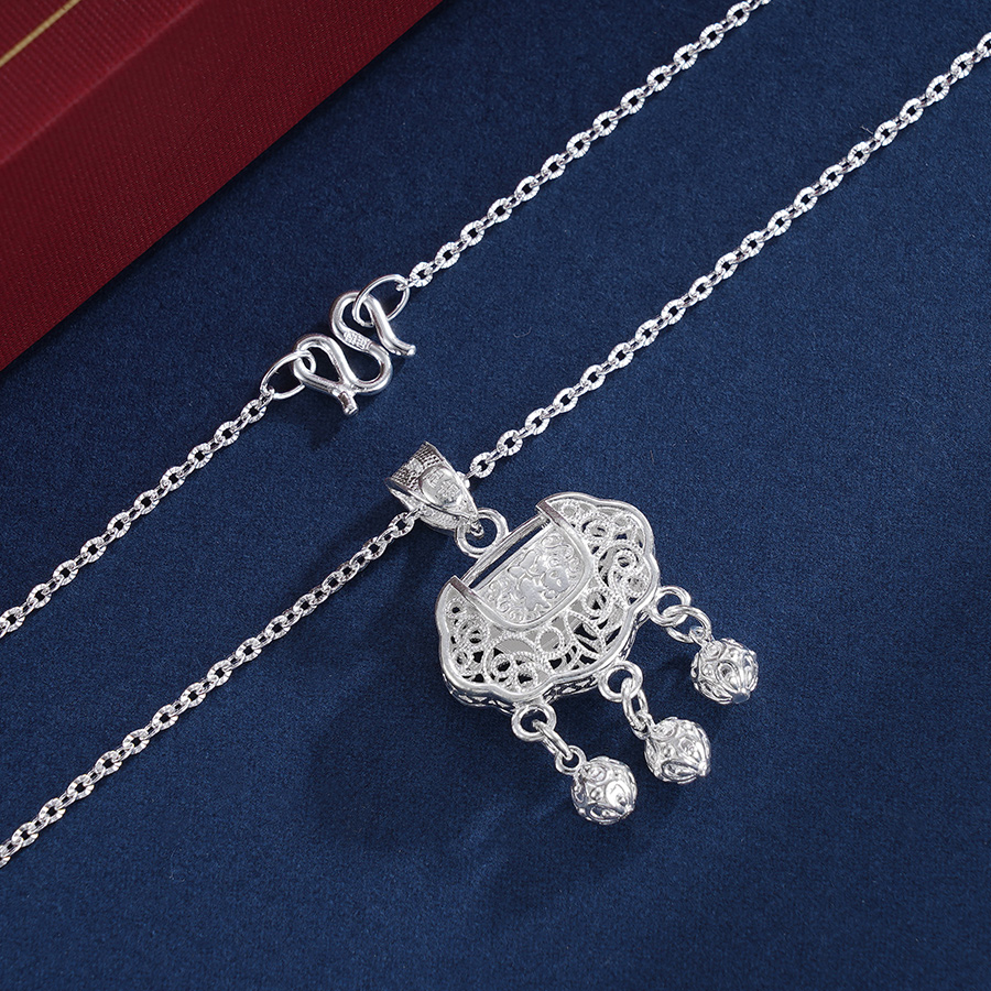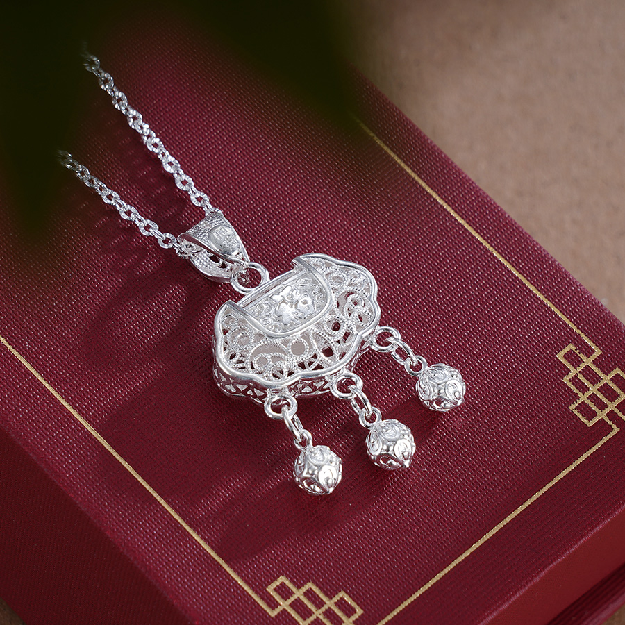 【寓意】:纯银如意锁吊坠,采用银花丝工艺编织打造,整体设计清雅灵动。吊坠之上点缀“福”字,象征藏福纳富。
