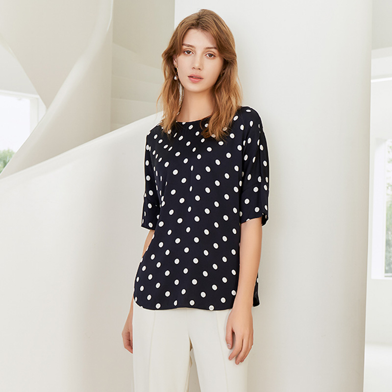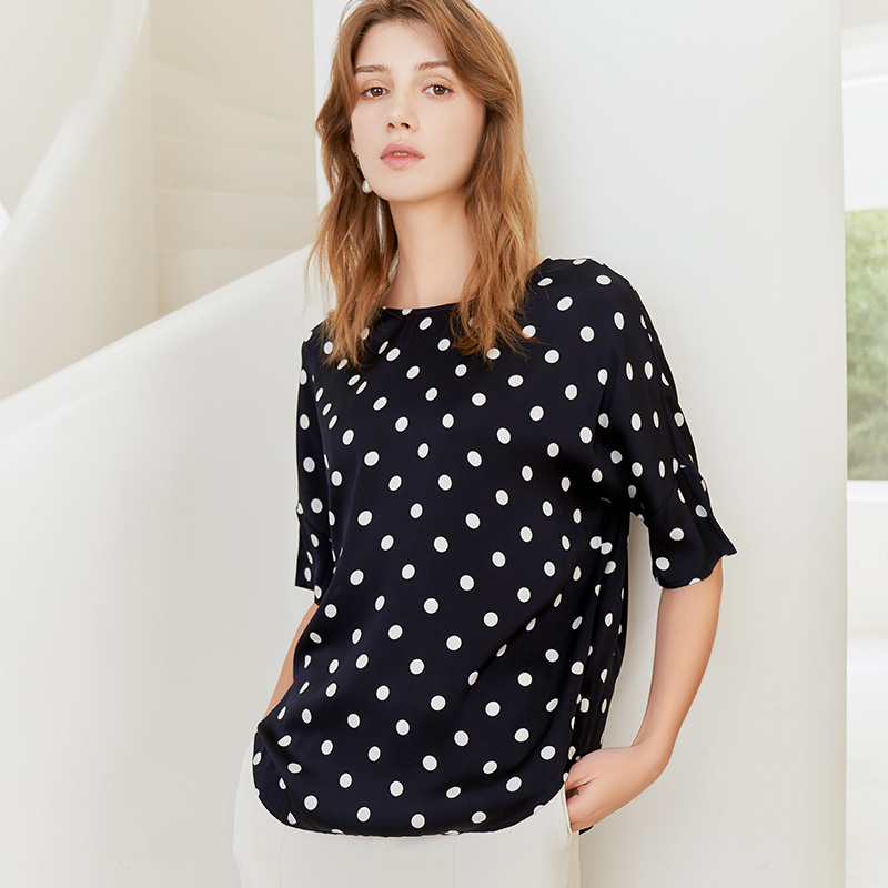 【桑蚕丝圆领T恤】23年春夏女士新品桑蚕丝T恤藏青底圆点印花上衣