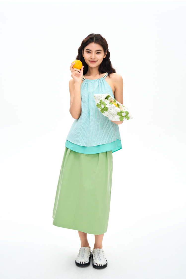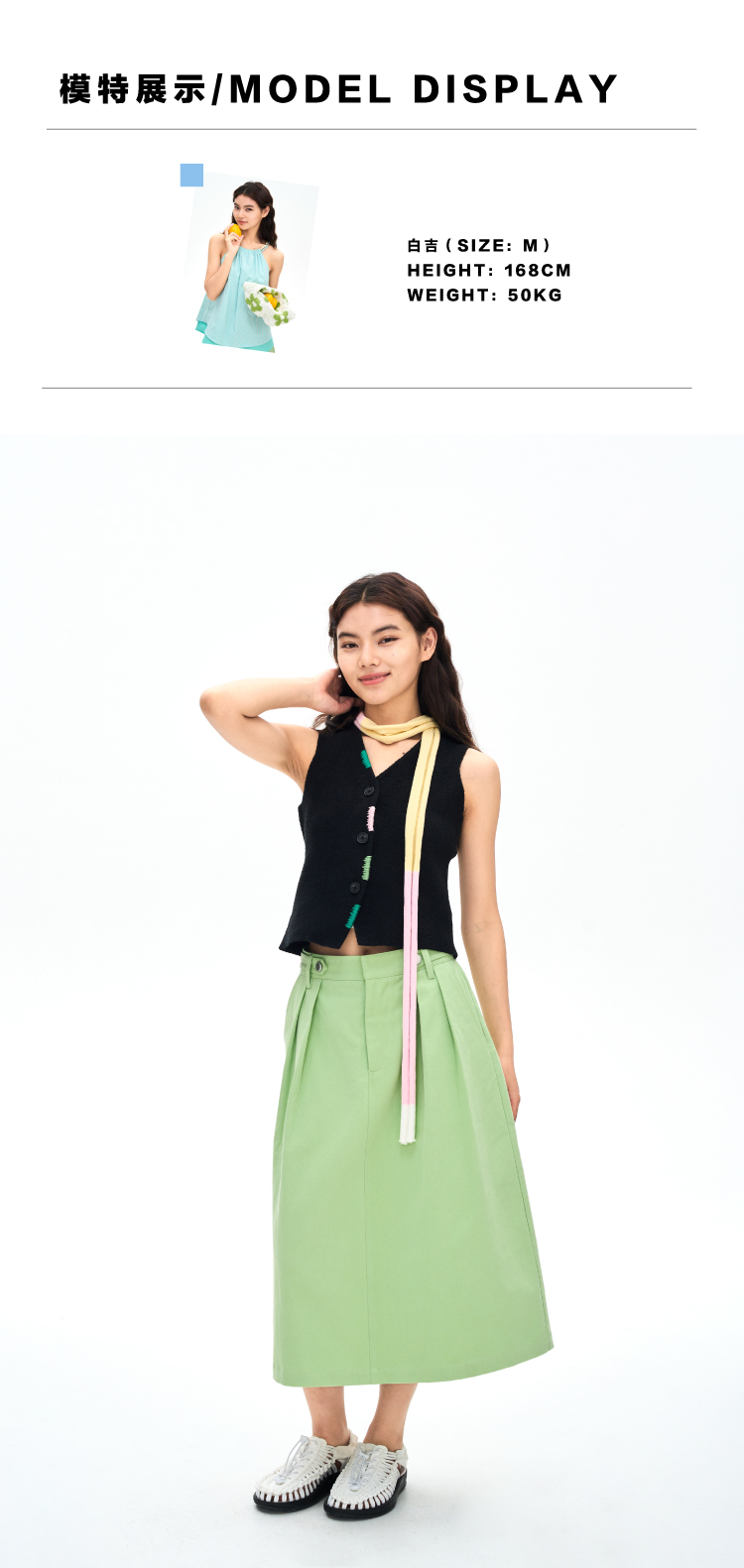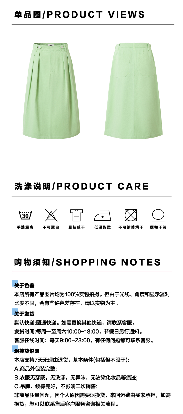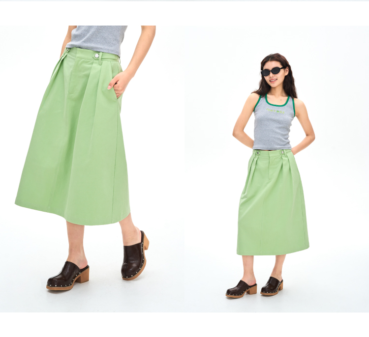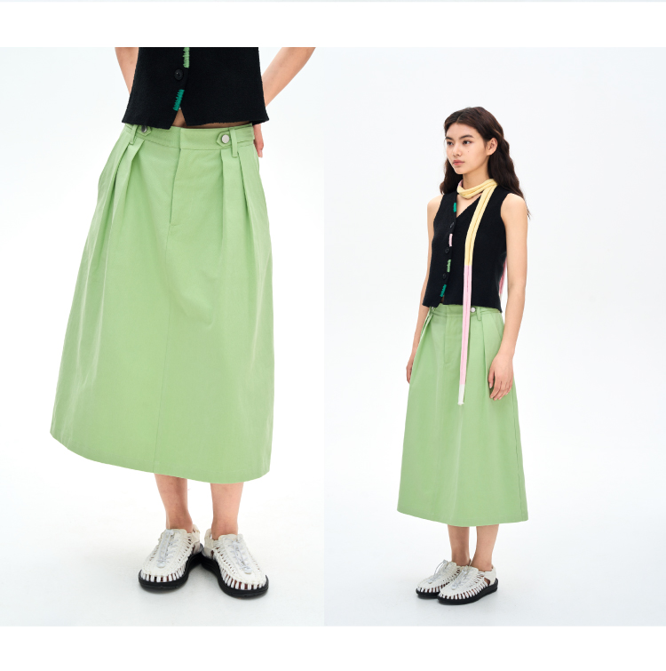 heris/H42114/草果绿细斜棉布 打褶花苞廓形 A字中长半裙百搭