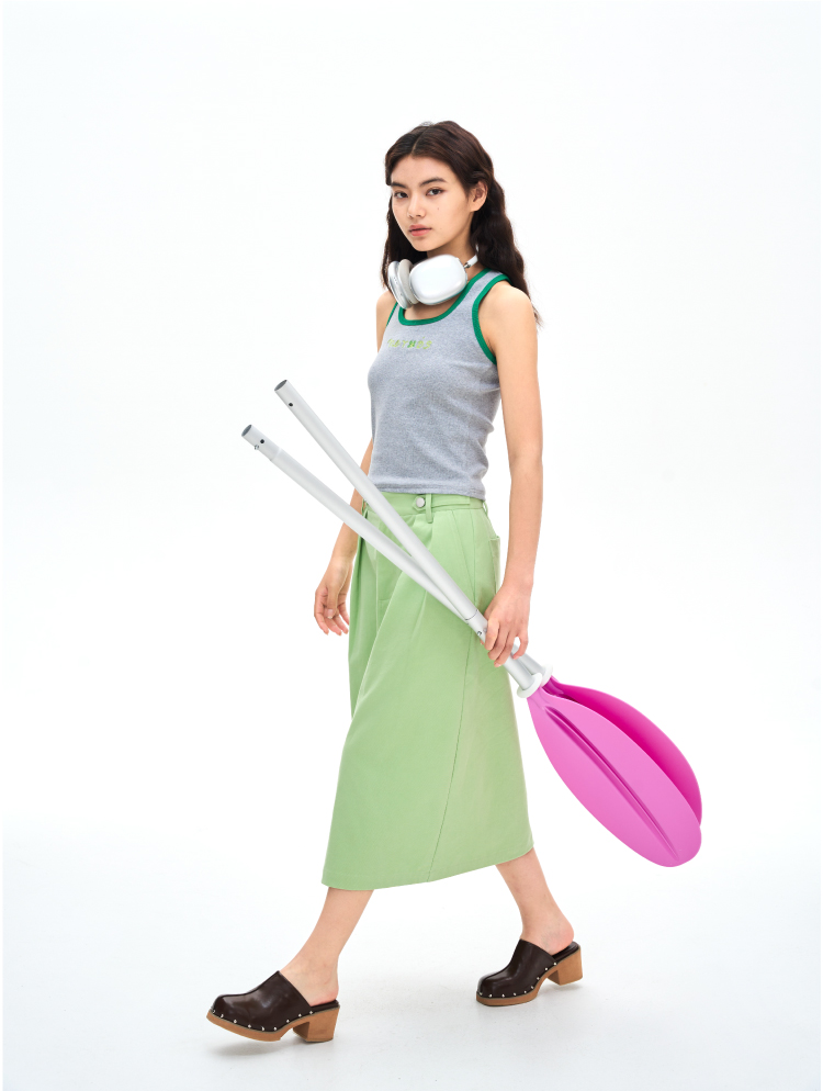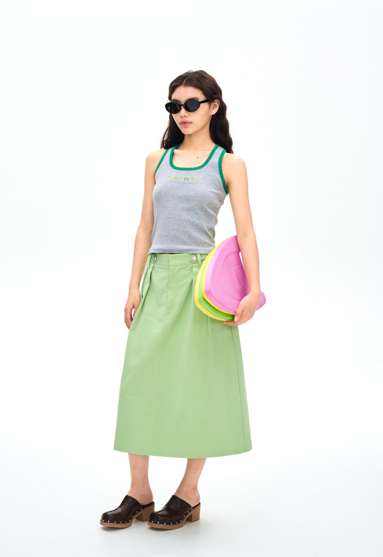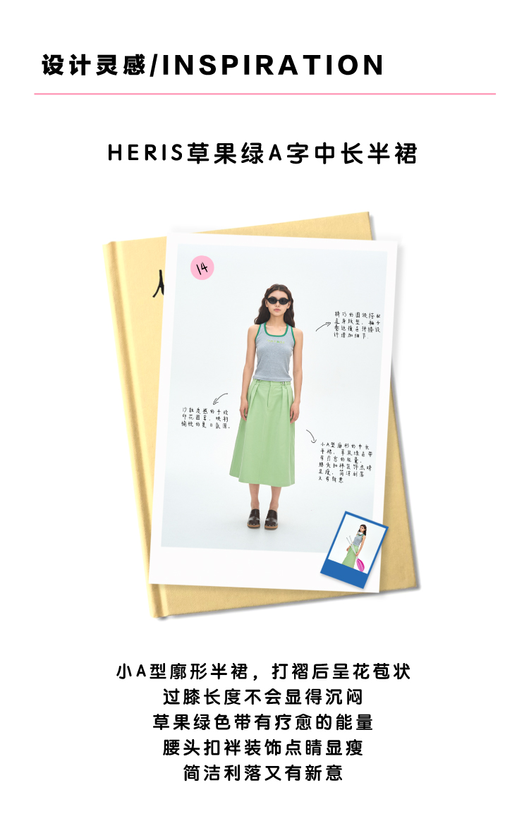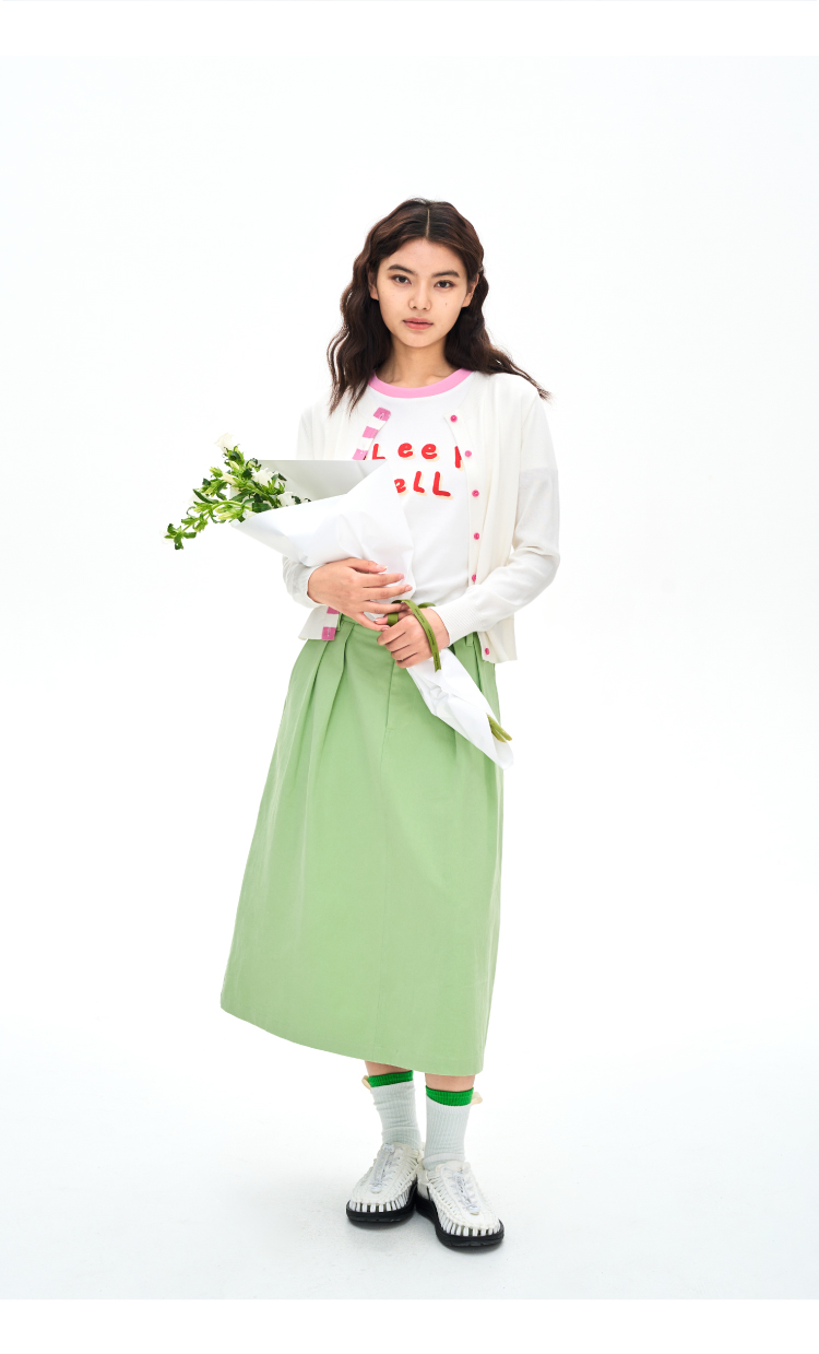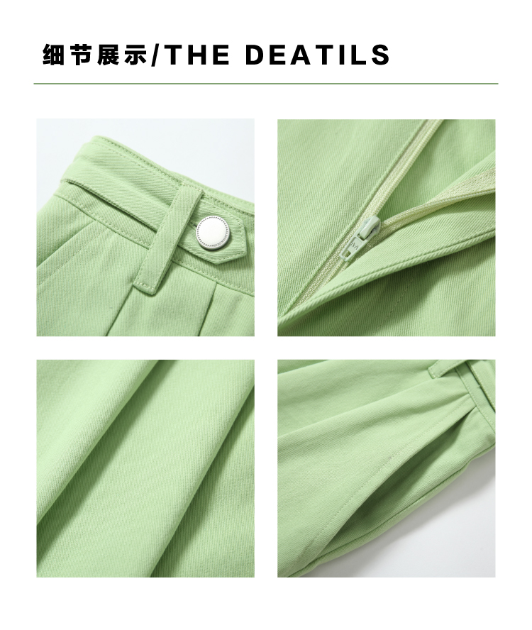 heris/H42114/草果绿细斜棉布 打褶花苞廓形 A字中长半裙百搭