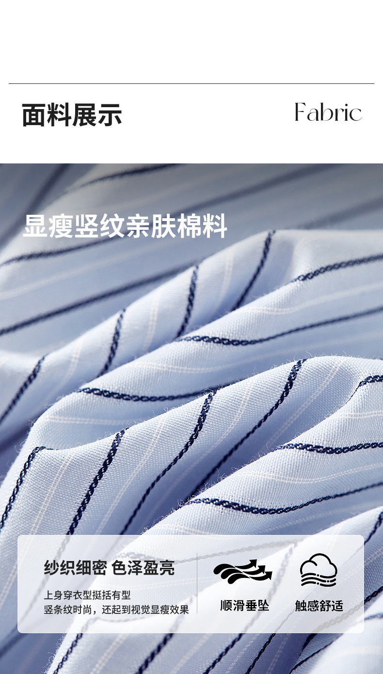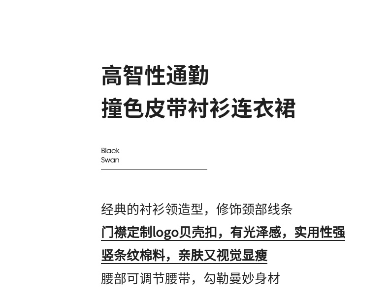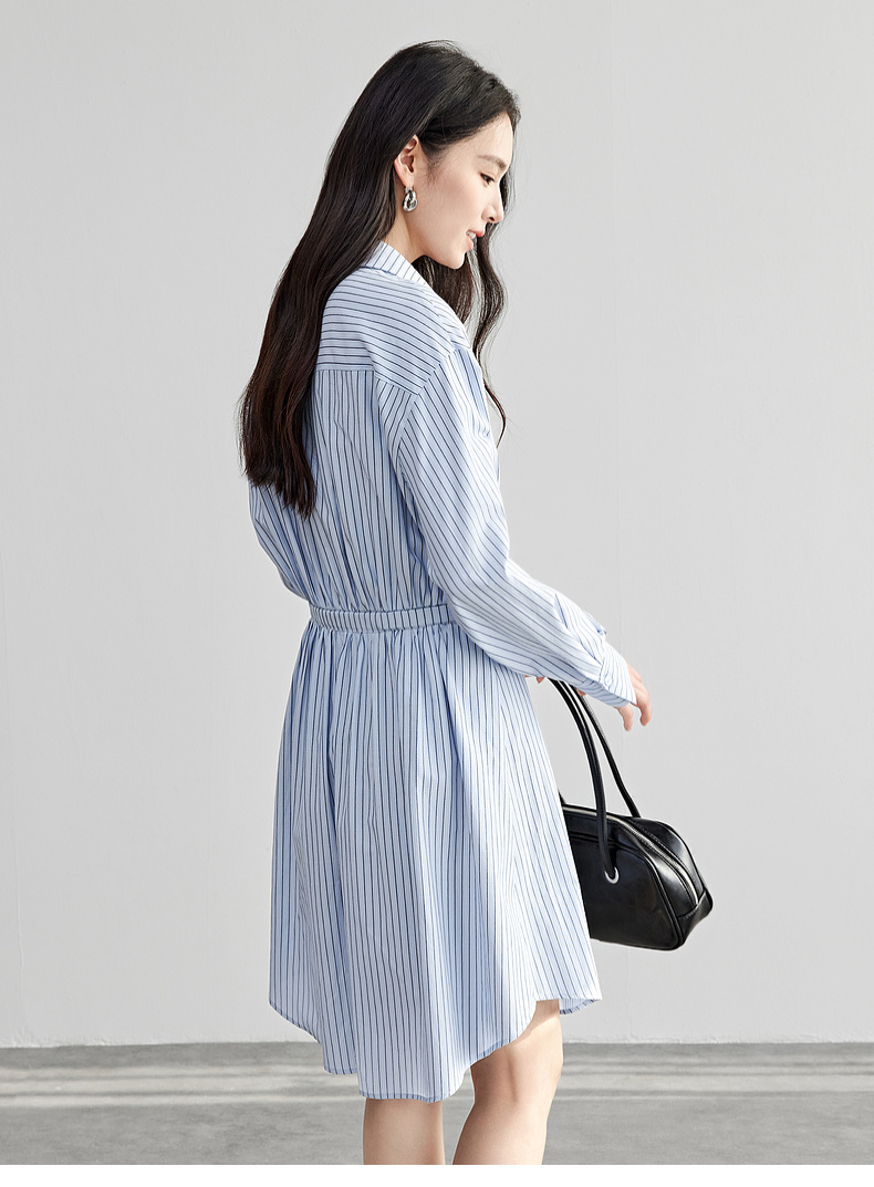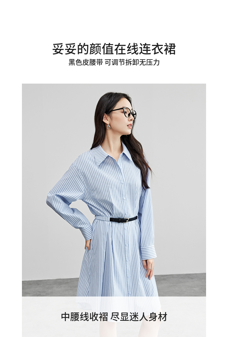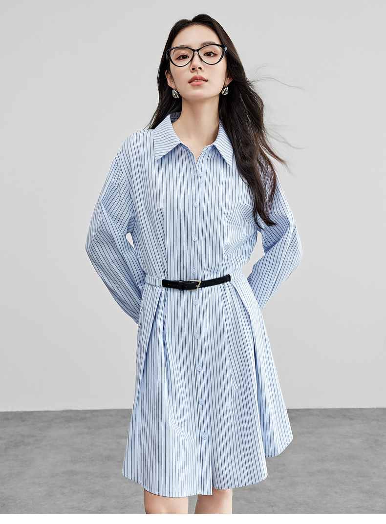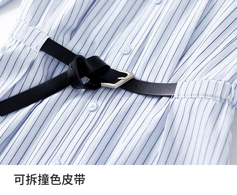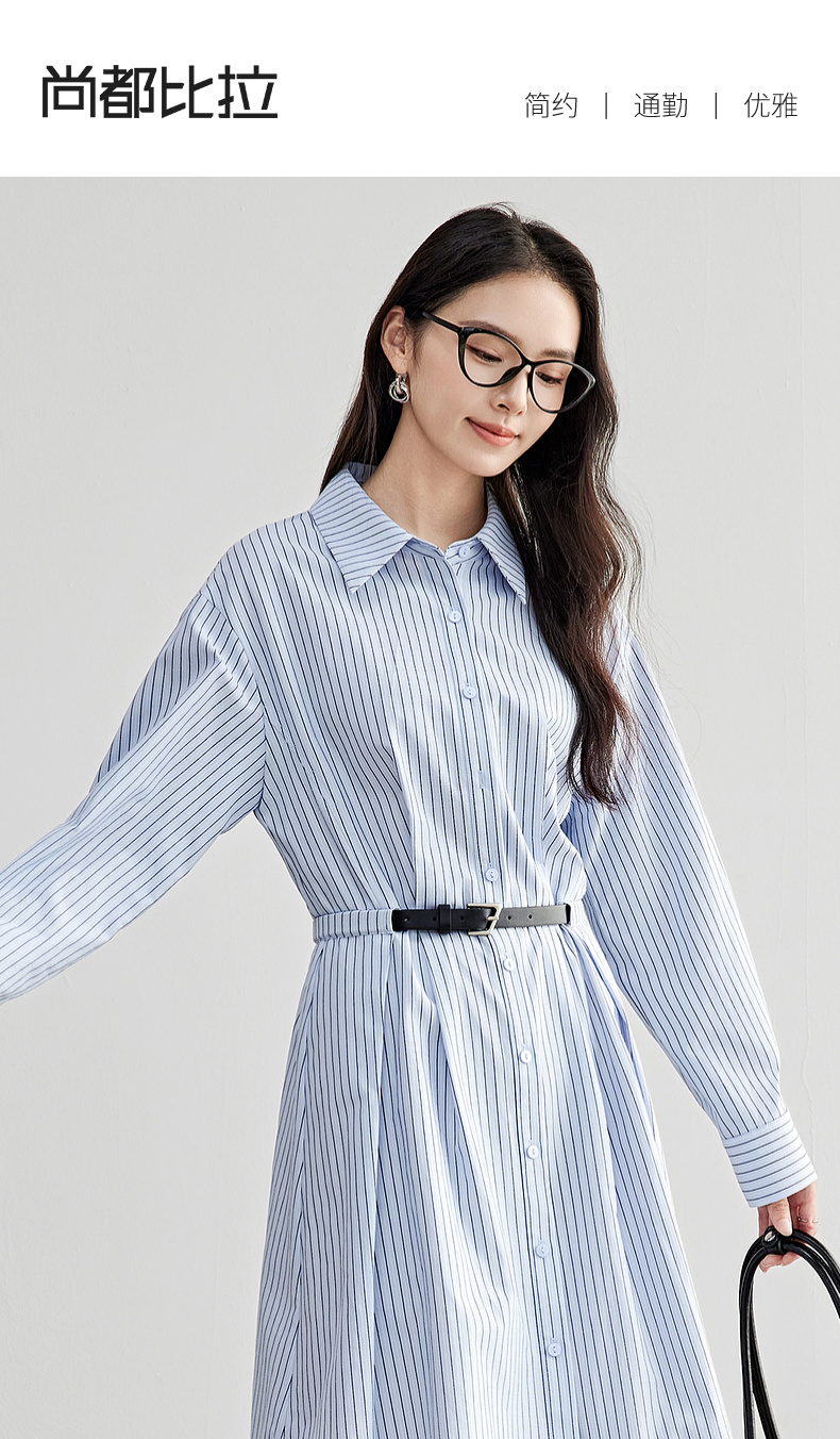 【内购】尚都比拉简约通勤撞色皮带收腰A字条纹棉衬衫领连衣裙-58148