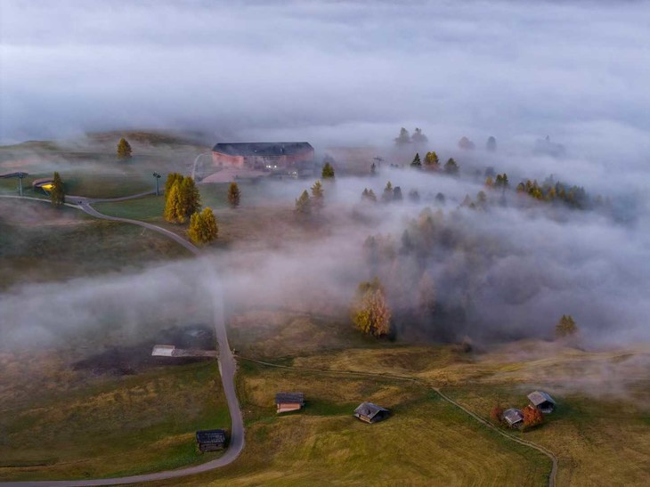 Alpe di Siusi晨雾和秋色草甸,St. Jakob山间小教堂、卡雷扎湖、碧绿湖水和雪山倒影,Passo Gardena & Passo Sella盘山公路风光,布莱耶斯湖晨雾与倒影,Tre Cime di Lavaredo(三峰)、米苏里纳湖日出、五塔、岩石地貌与秋色森林。