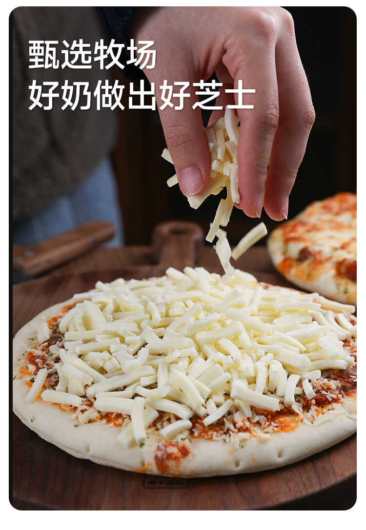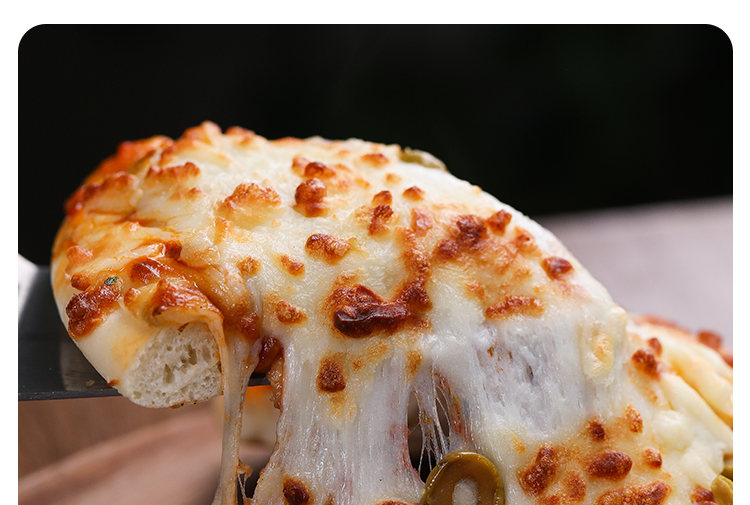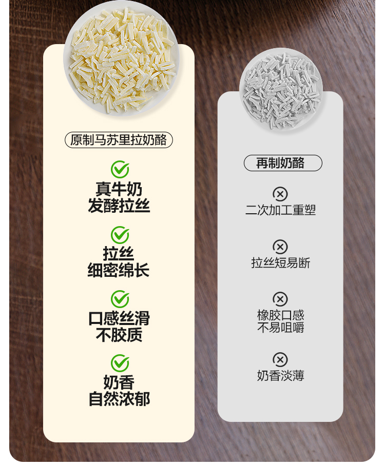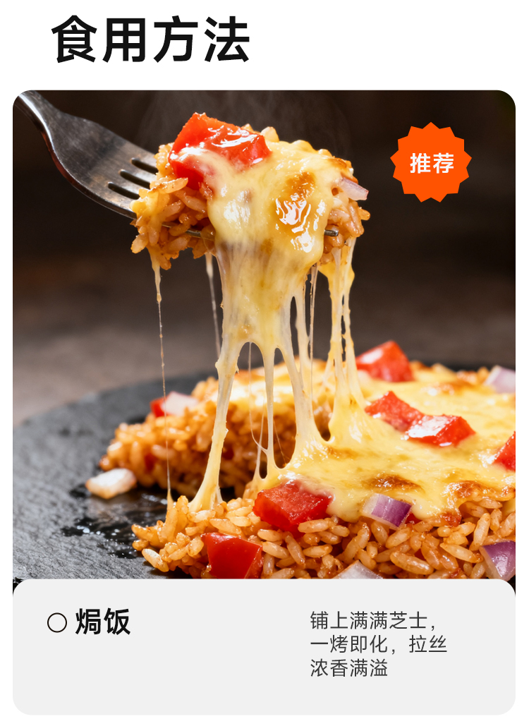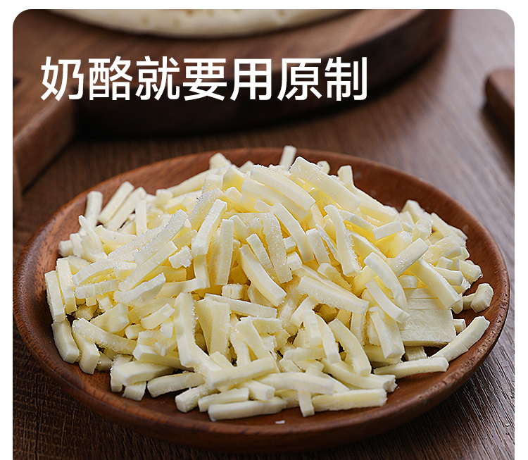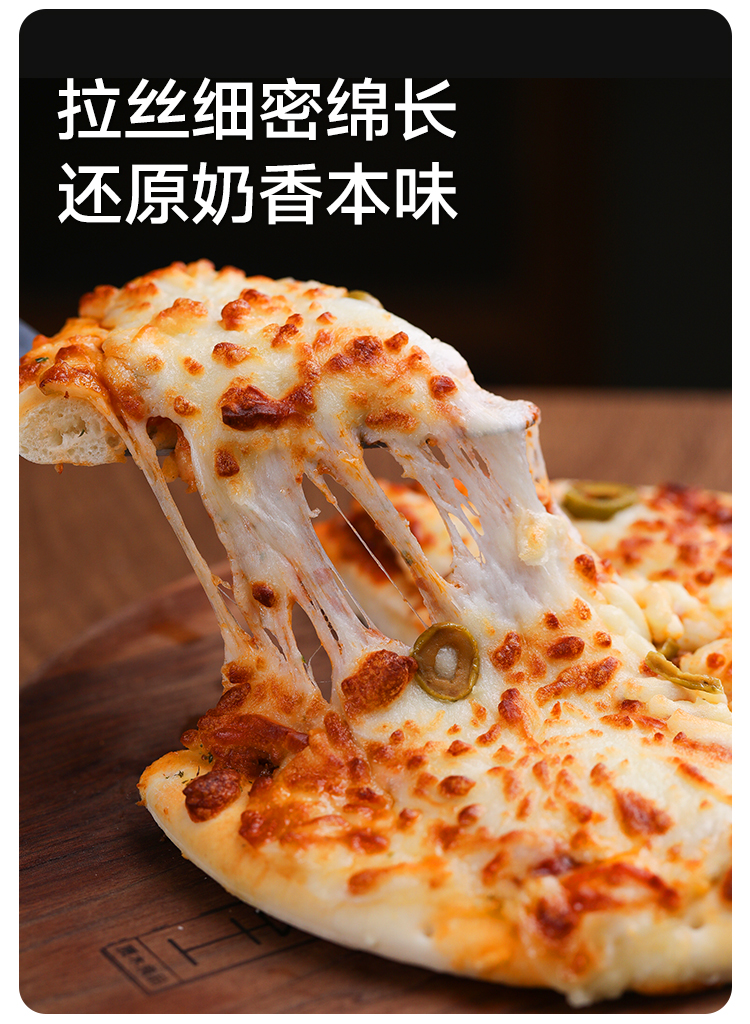 2、原制奶酪,非再制工艺,烤化后拉丝细密绵长,轻轻松松做到拉丝拉丝长长长。(