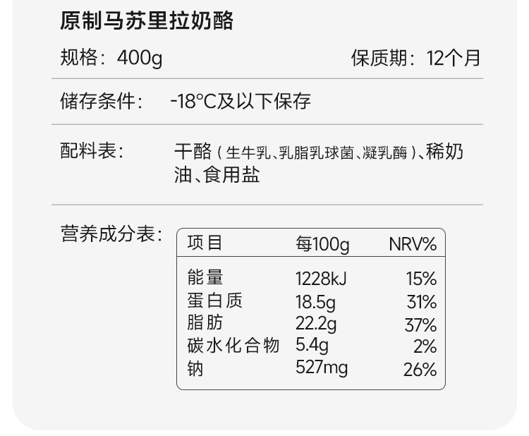 【品名/规格】【下厨房】原制马苏里拉奶酪(400g/袋)