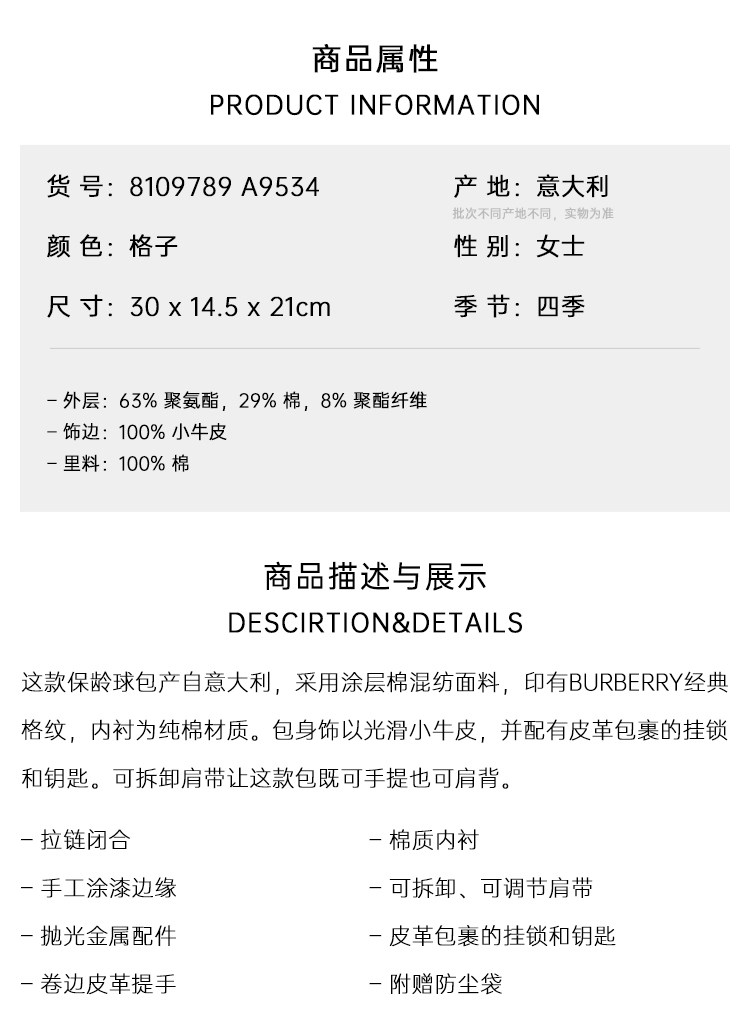 BURBERRY 巴宝莉 女士中号格子保龄球包 格子 8109789 A9534