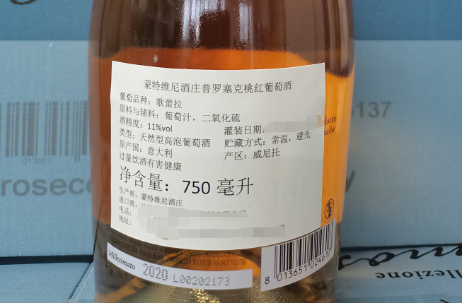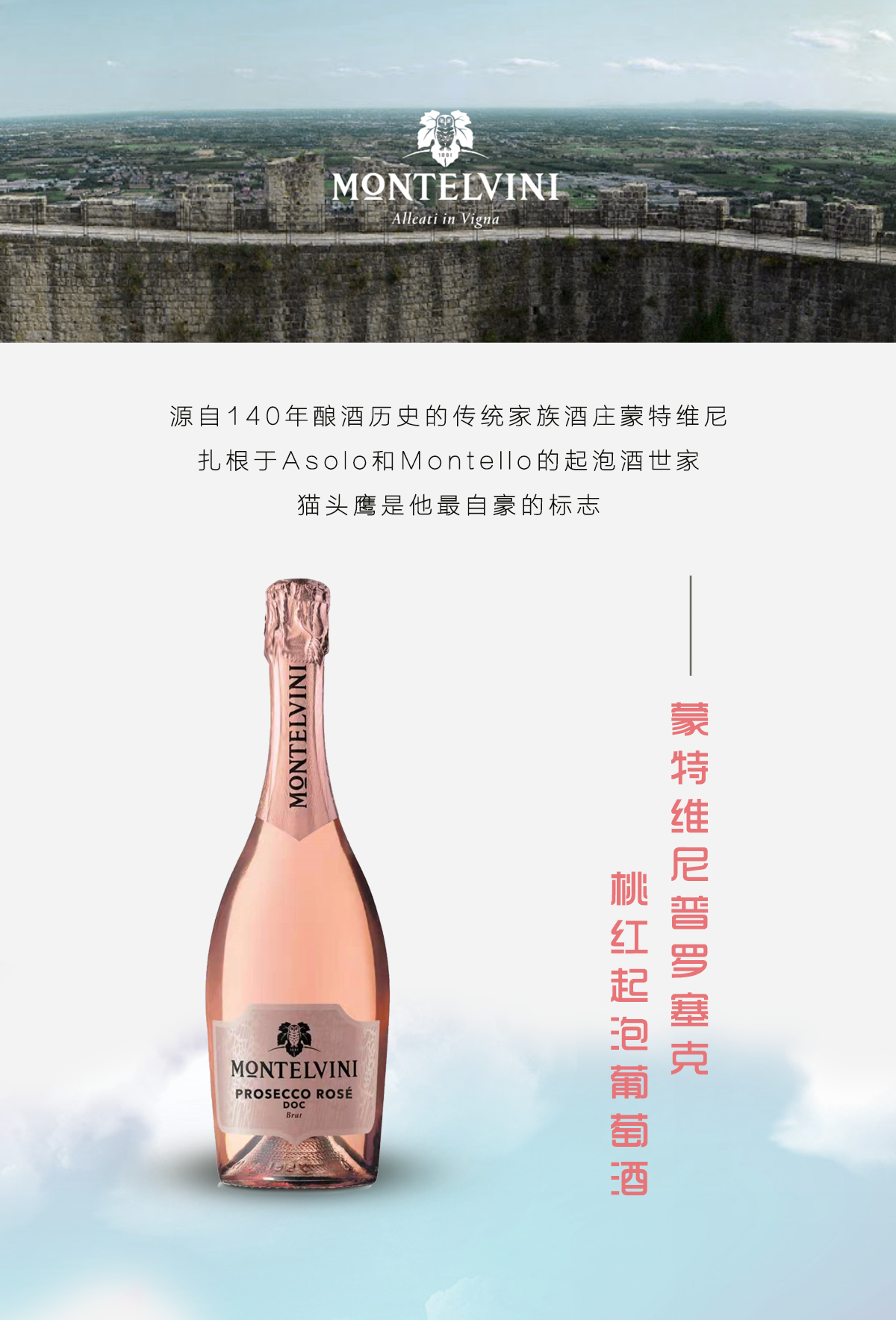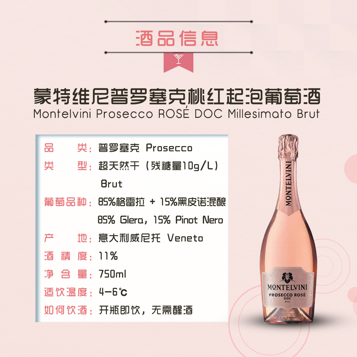 【粉瓶】蒙特维尼酒庄 普罗塞克prosecco桃红起泡酒 超天然干型11%750ml 意大利原瓶进口 包装升级