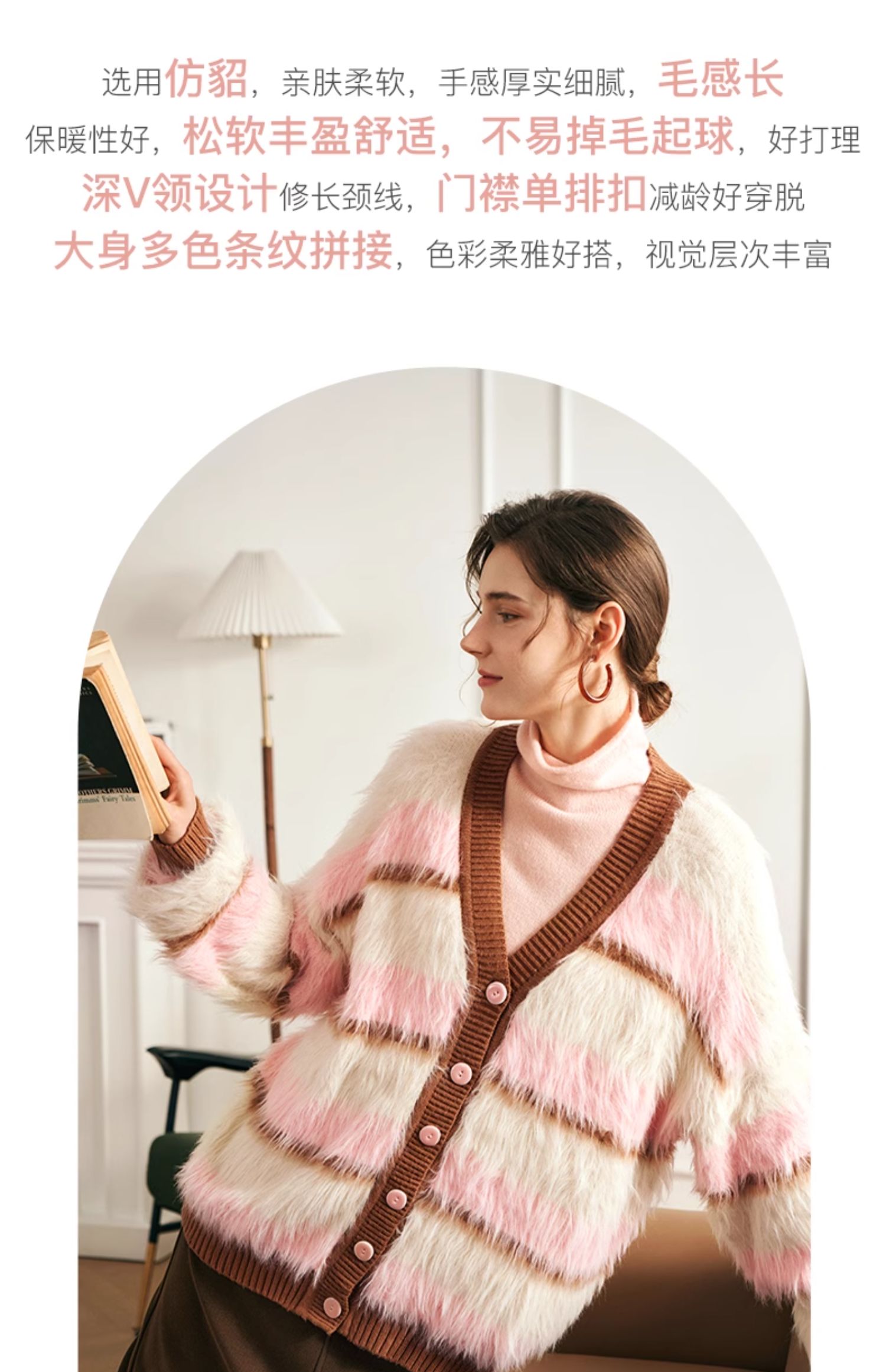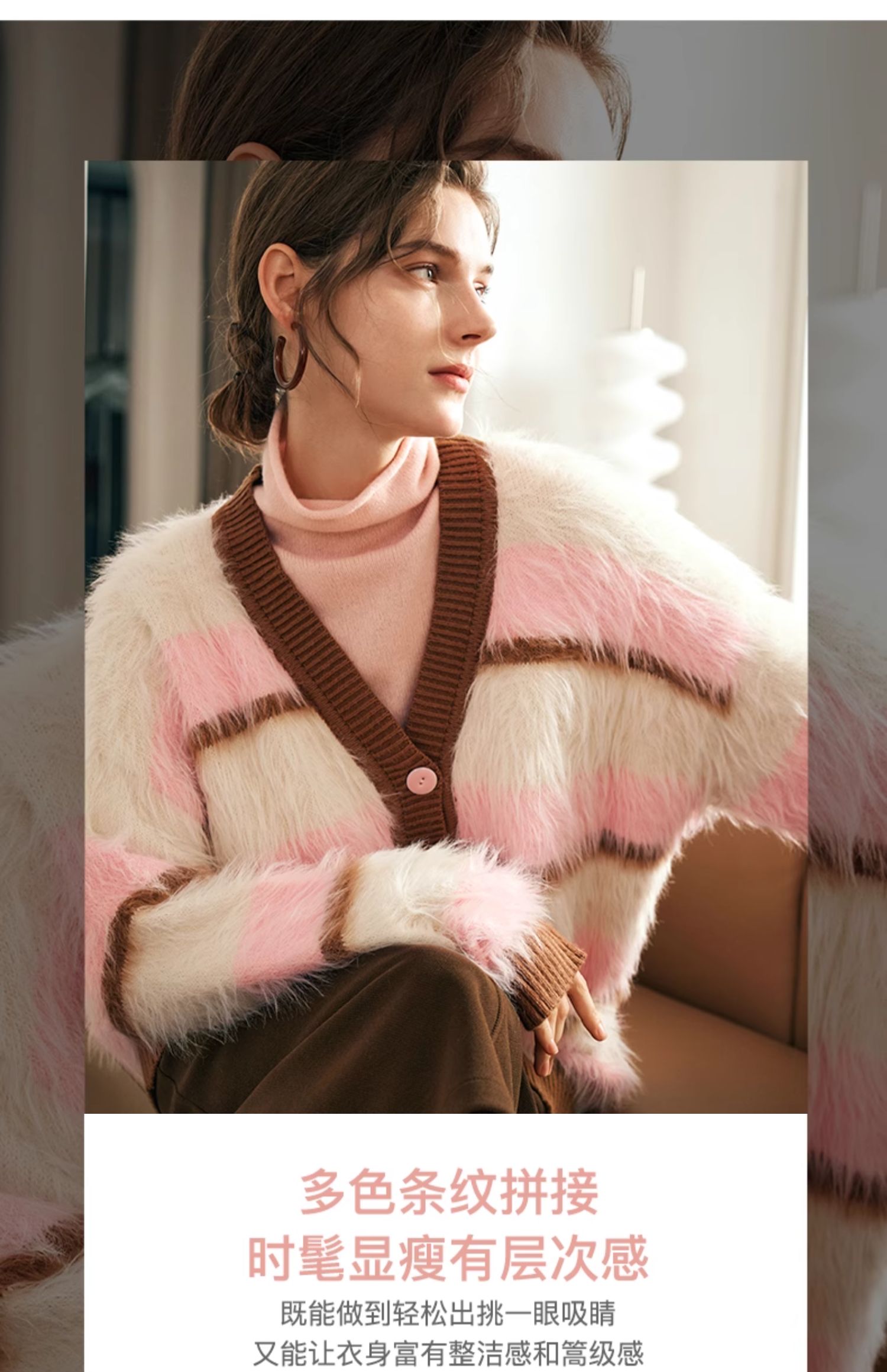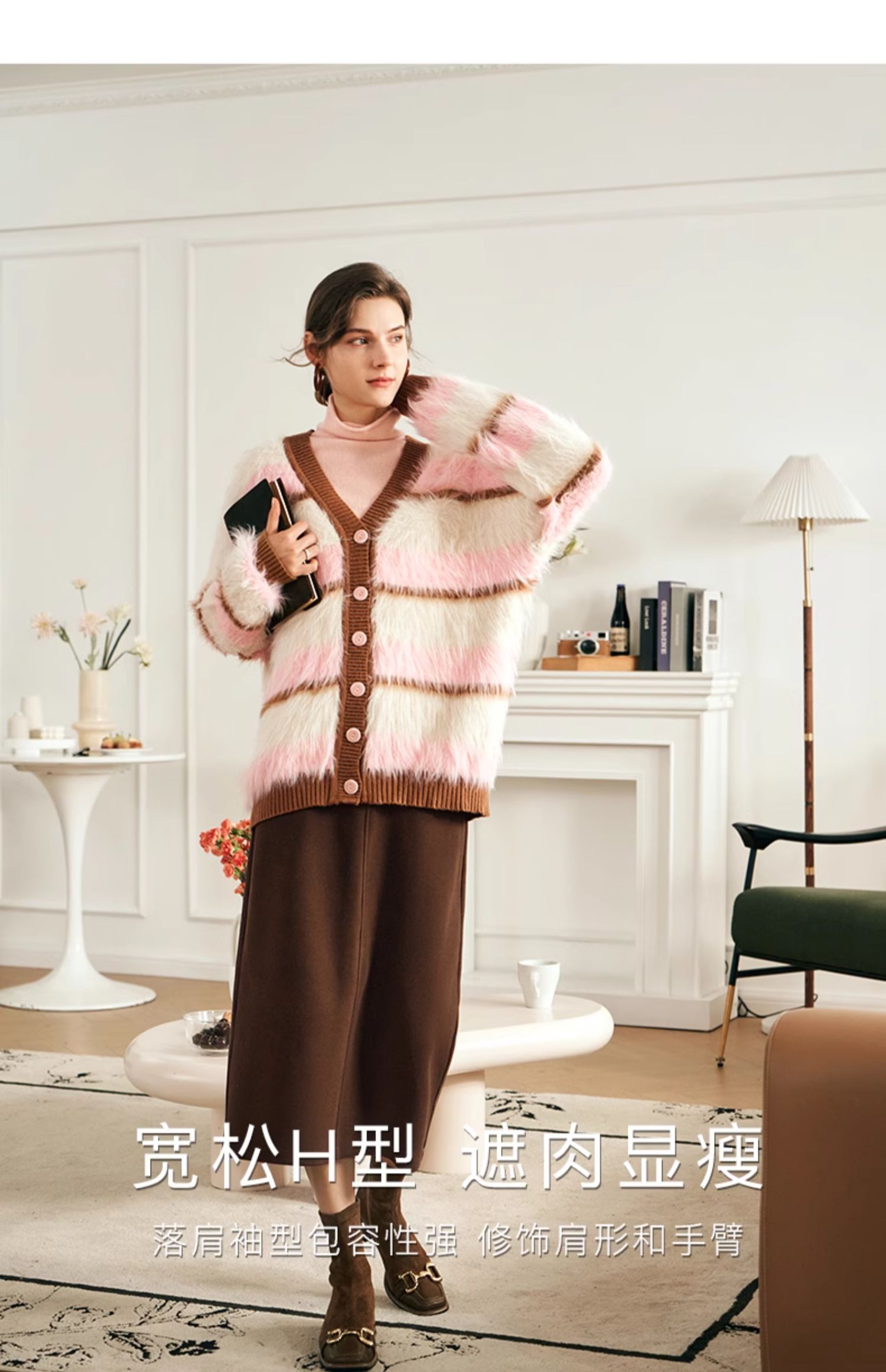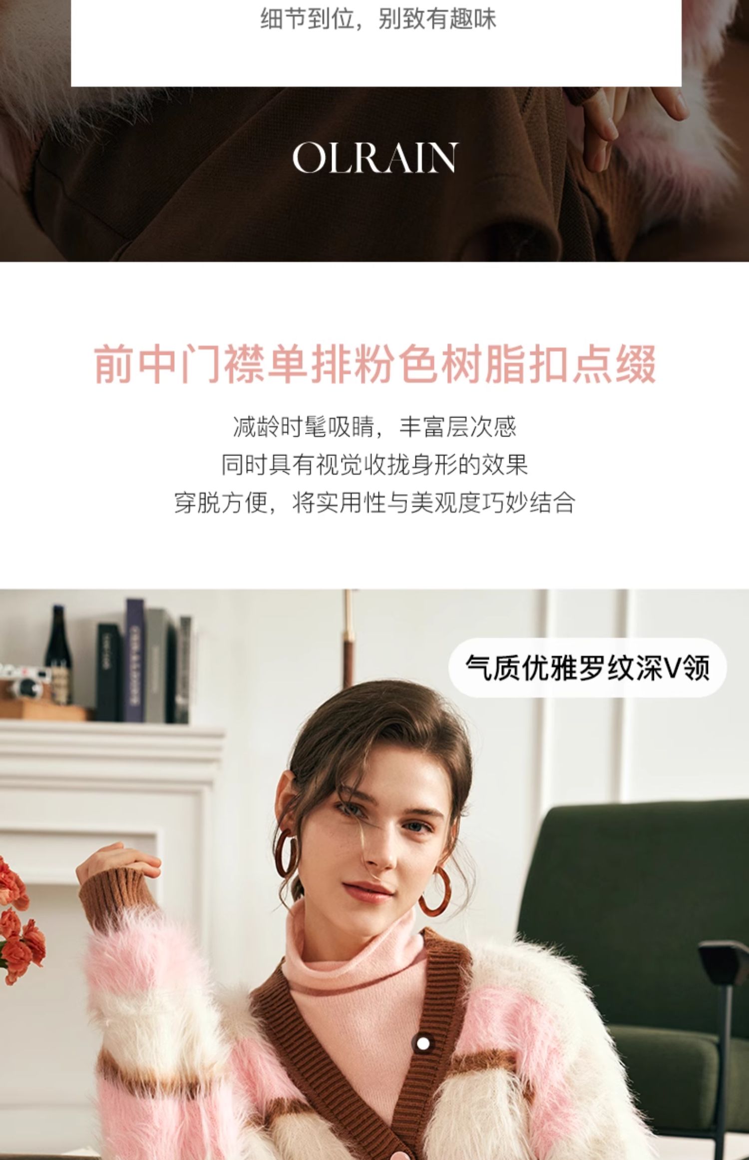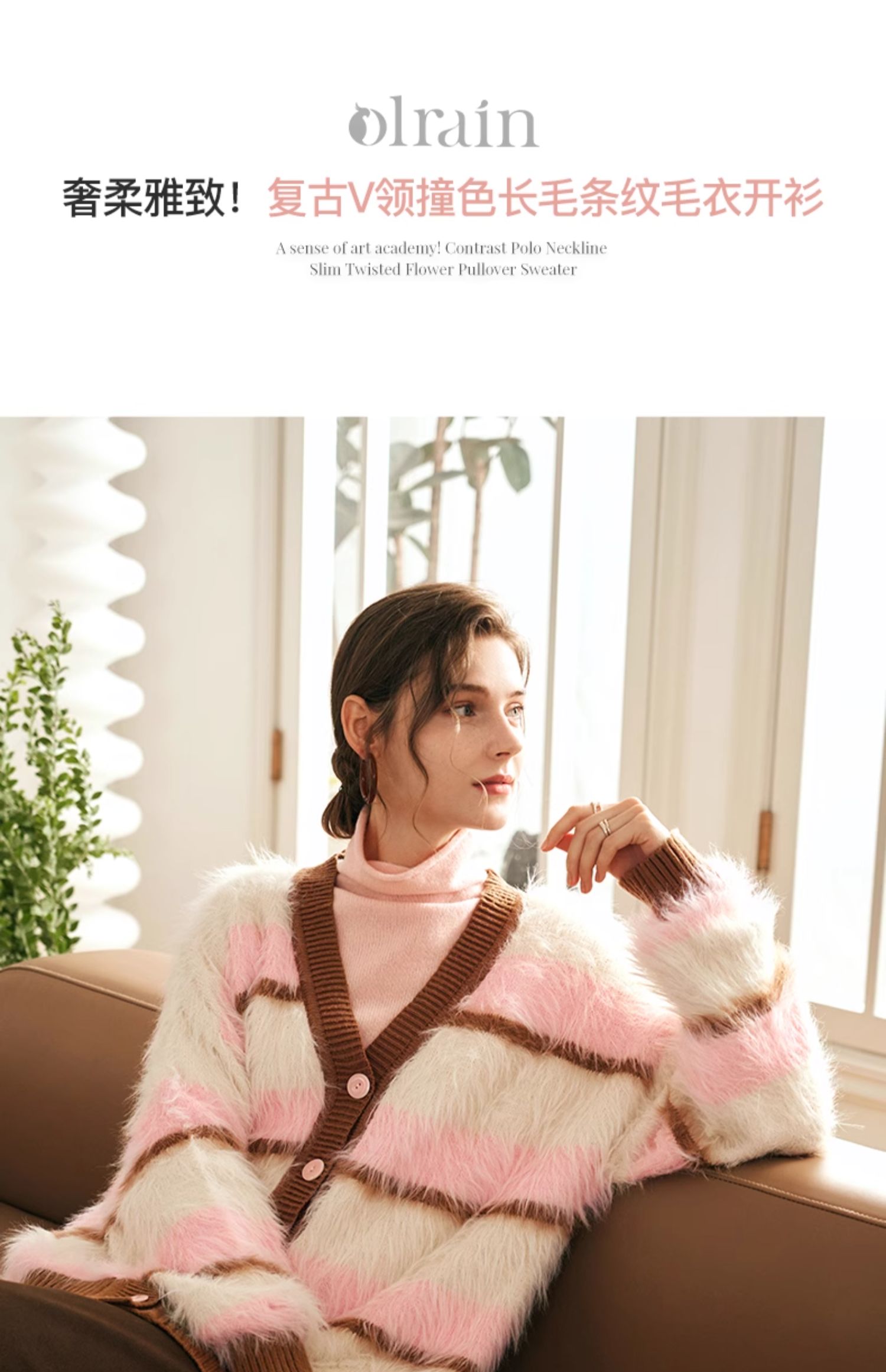 OLrain欧芮儿条纹开衫毛衣女冬季2025年新款复古v领撞色针织衫