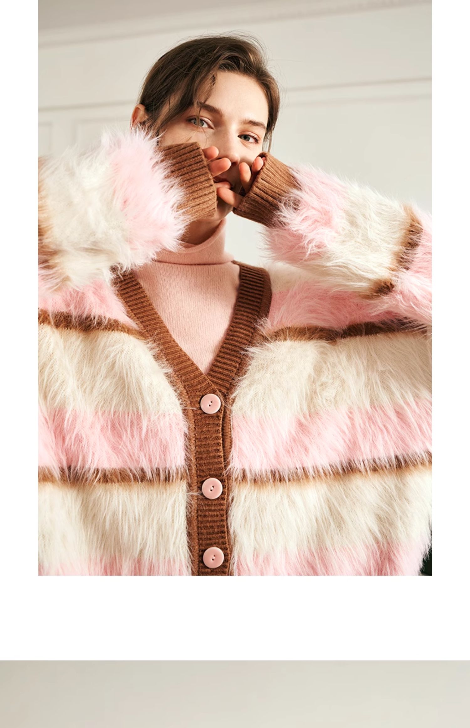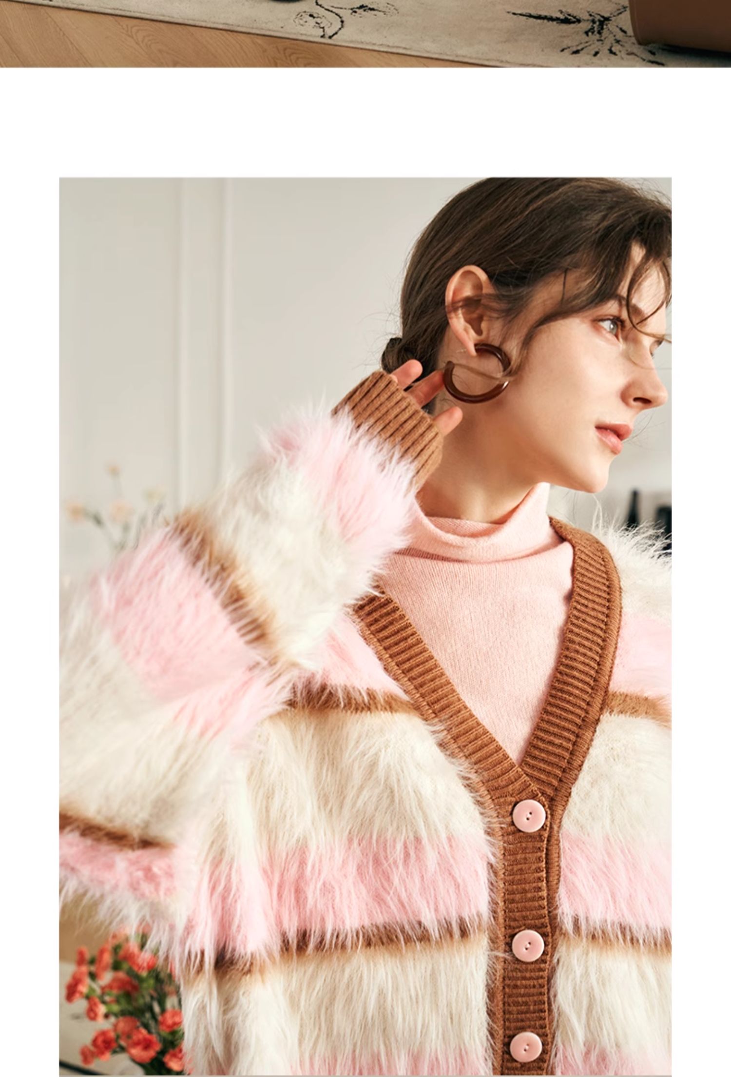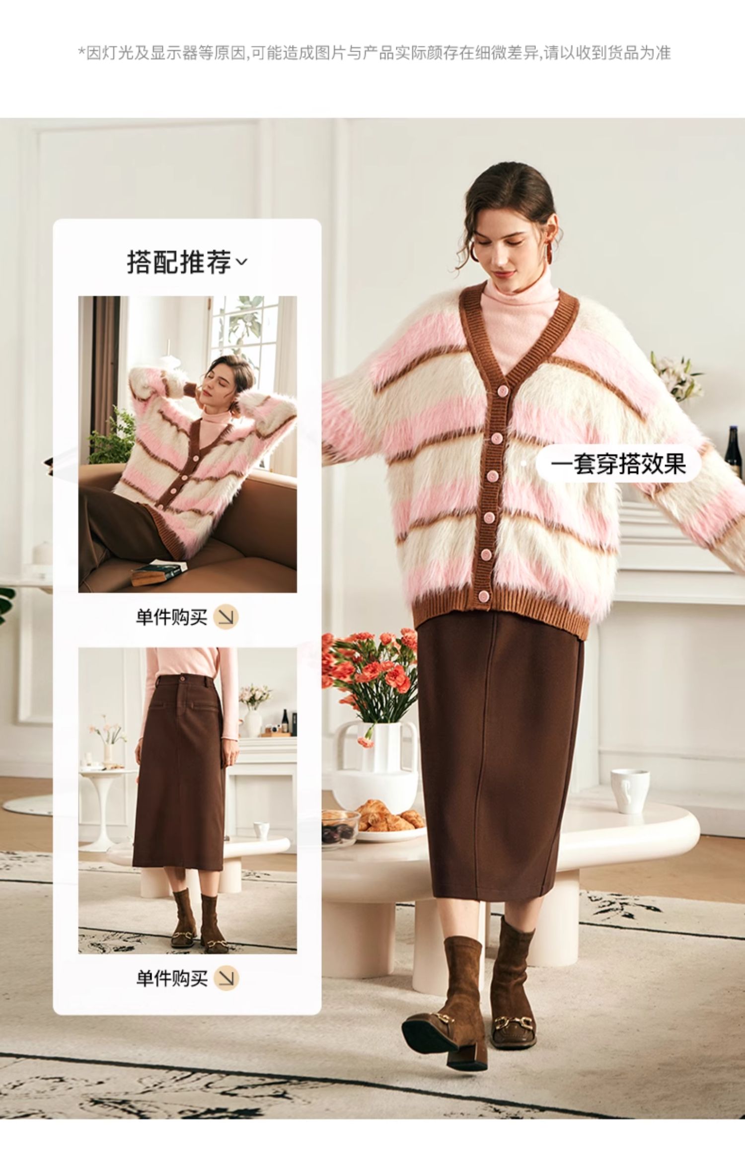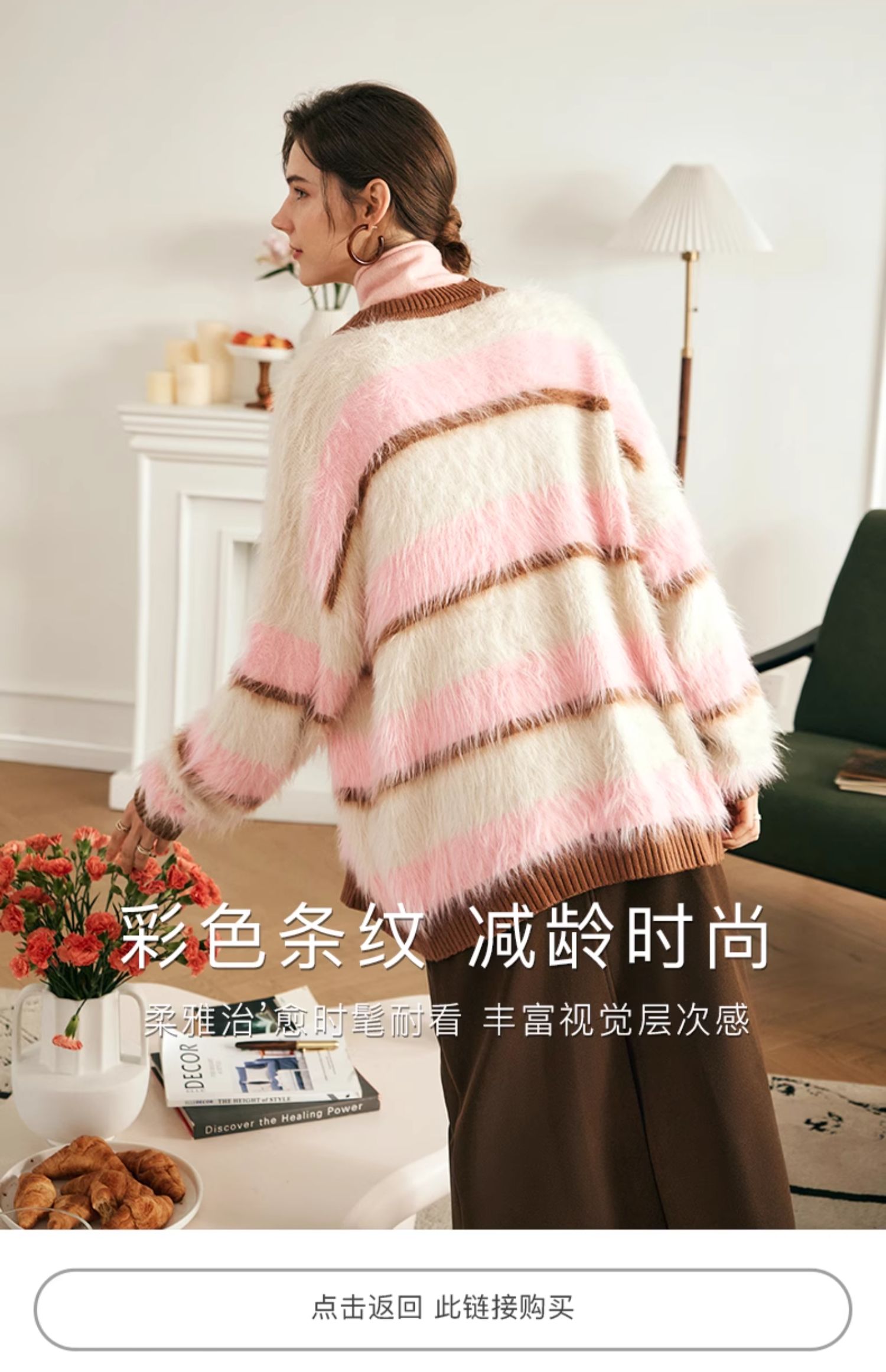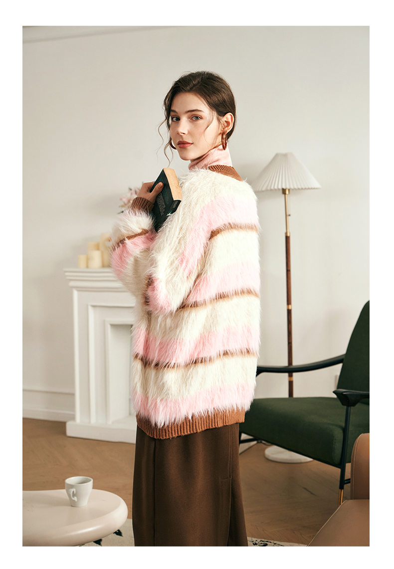 OLrain欧芮儿条纹开衫毛衣女冬季2025年新款复古v领撞色针织衫