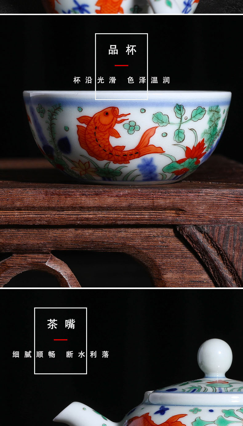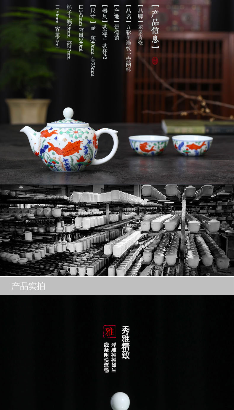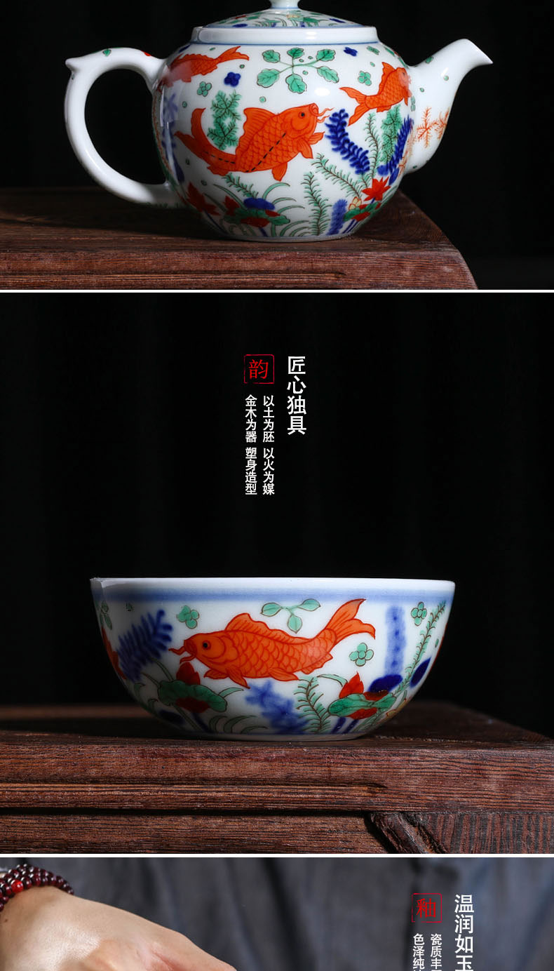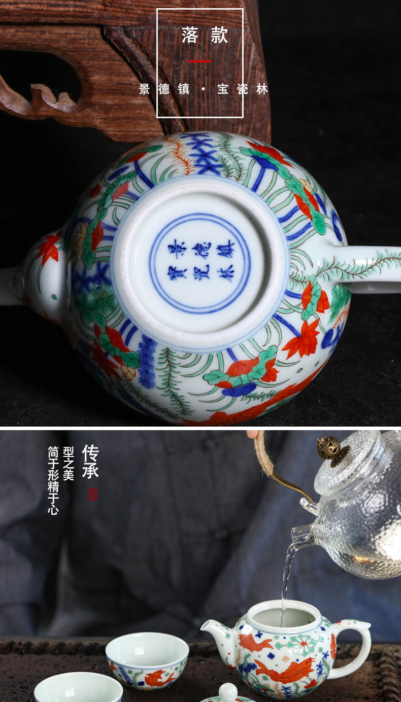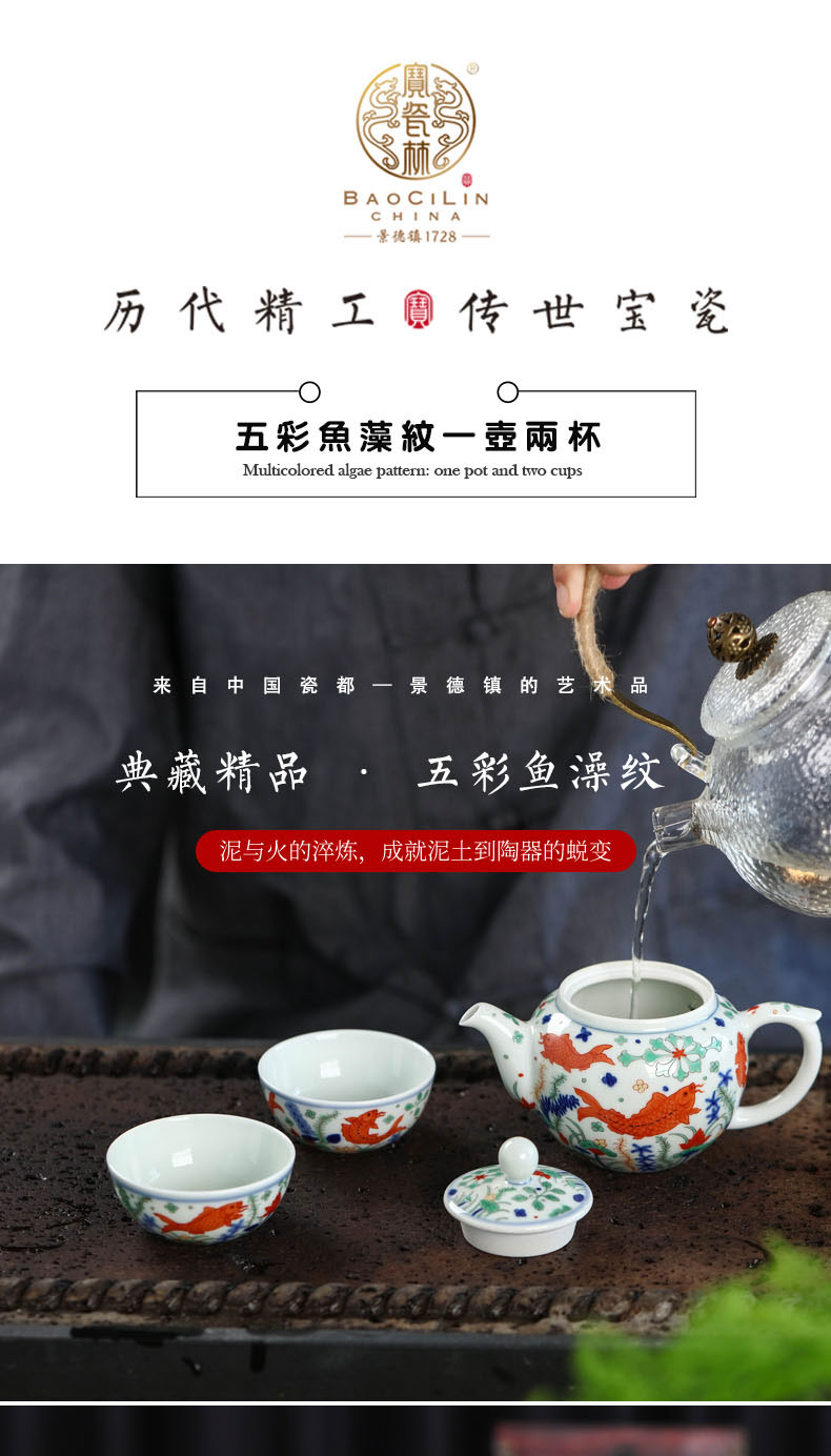 【宝瓷林】景德镇陶瓷五彩鱼藻纹一壶两杯套组(纯手工)