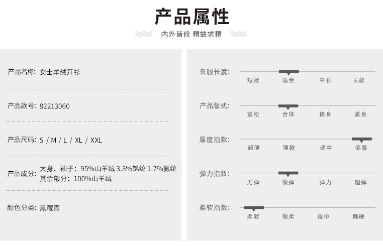| 销售渠道类型: 商场同款(线上线下都销售) | 材质成分: 山羊绒(羊绒)95% 聚酰胺纤维(锦纶)3.3% 聚氨酯弹性纤维(氨纶)1.7% |