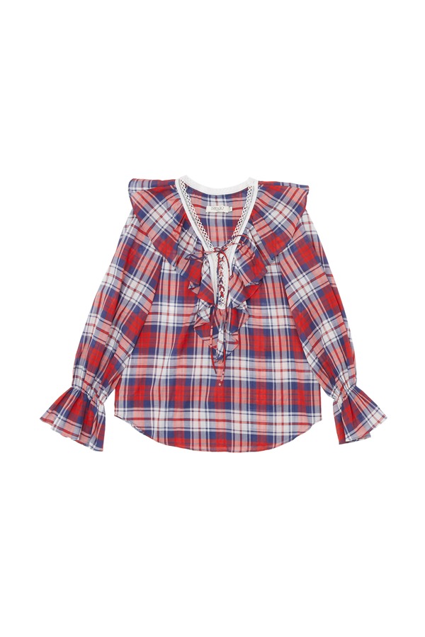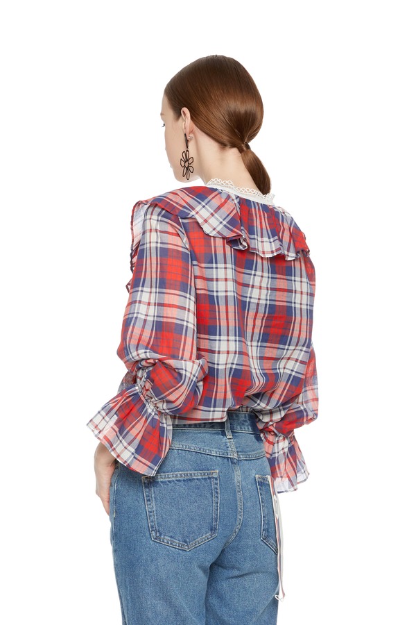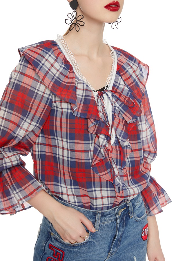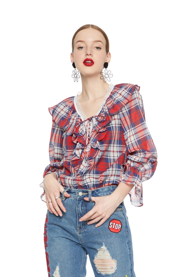 SIEGO 木耳边V领格纹上衣 5203