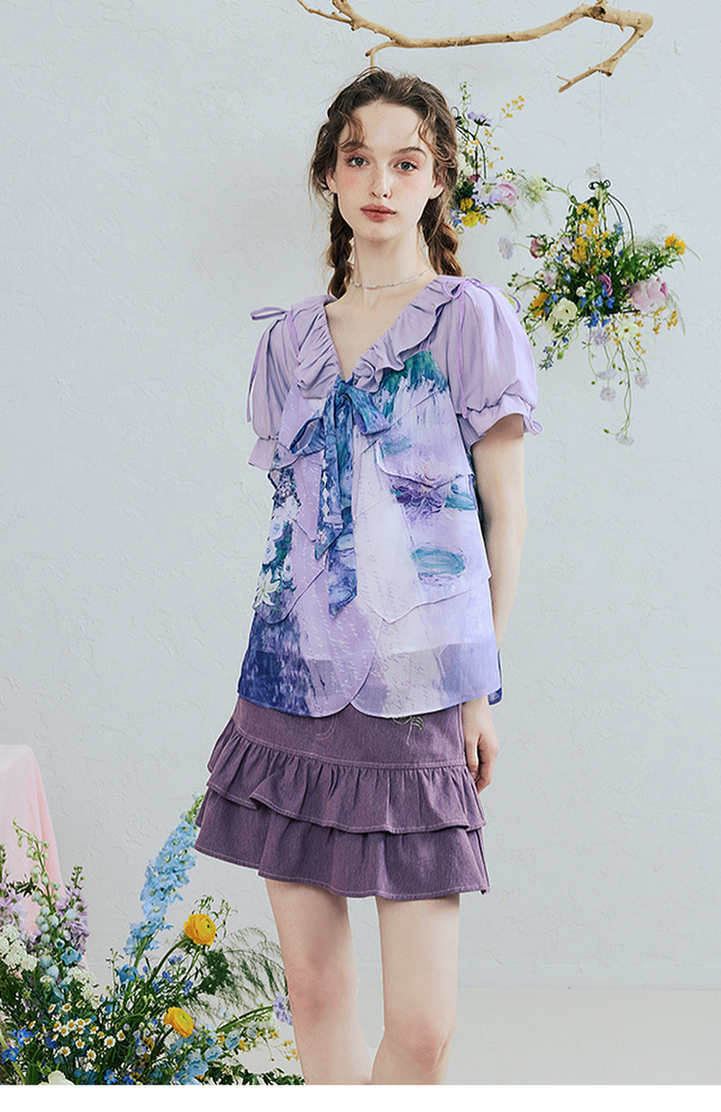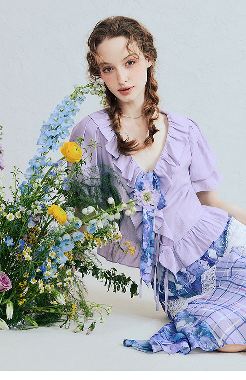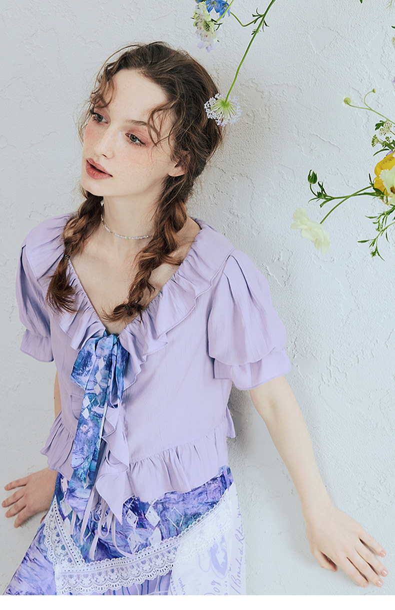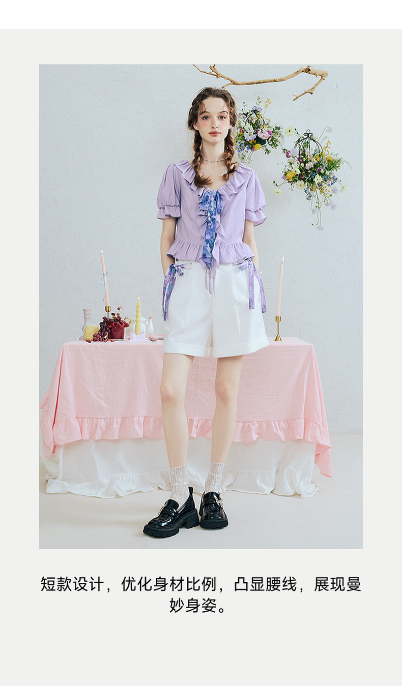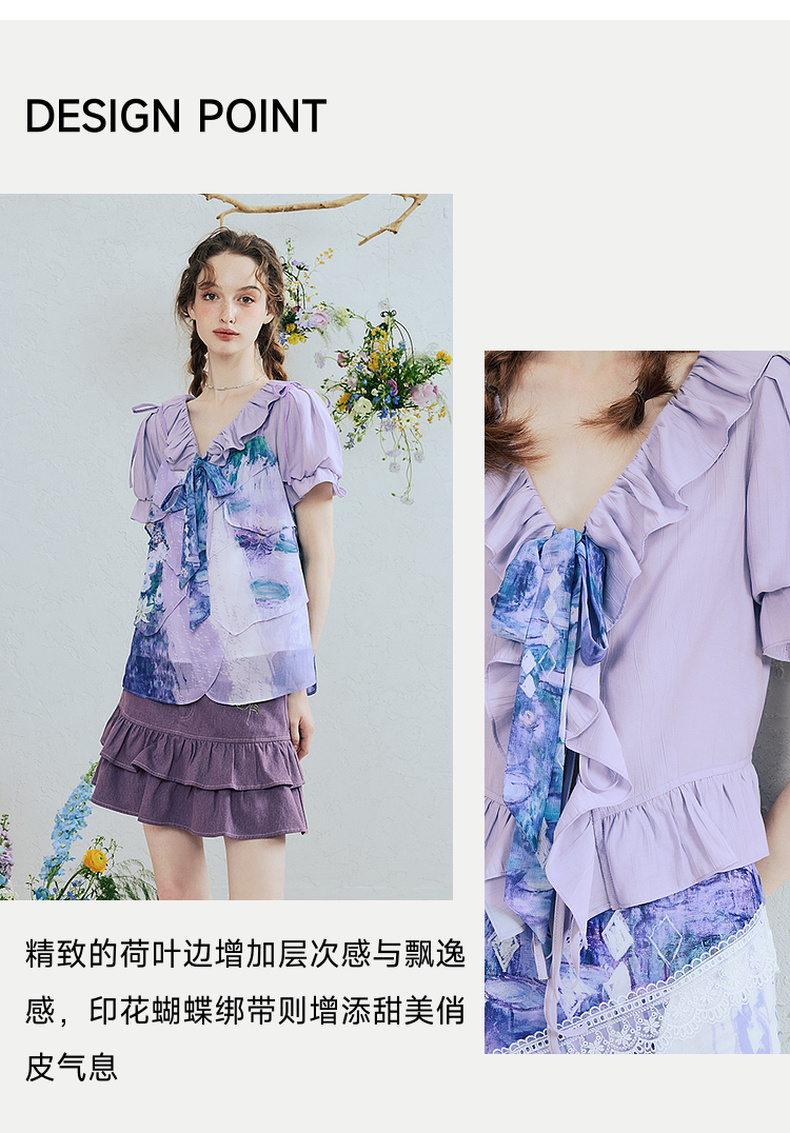 两三事 花楹织夏 2025夏季新款甜美泡泡袖荷叶边印花绑带衬衫女