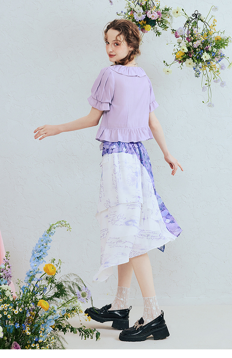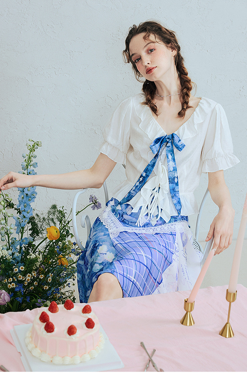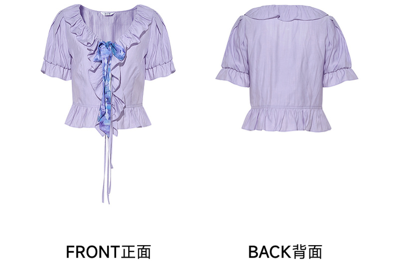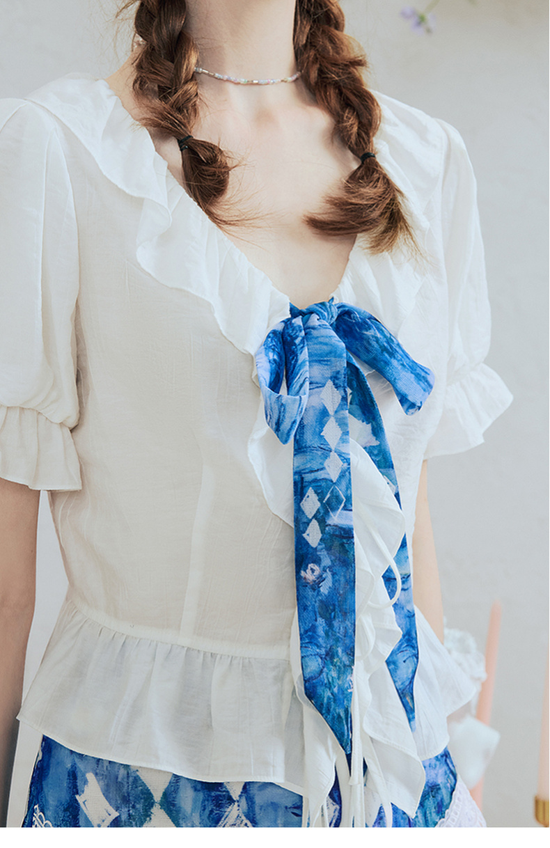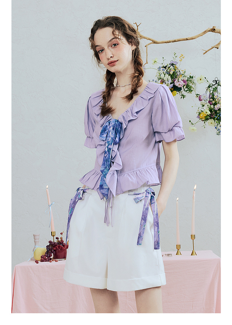 两三事 花楹织夏 2025夏季新款甜美泡泡袖荷叶边印花绑带衬衫女