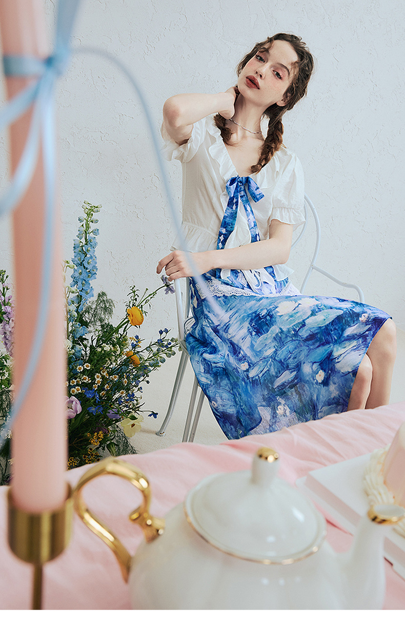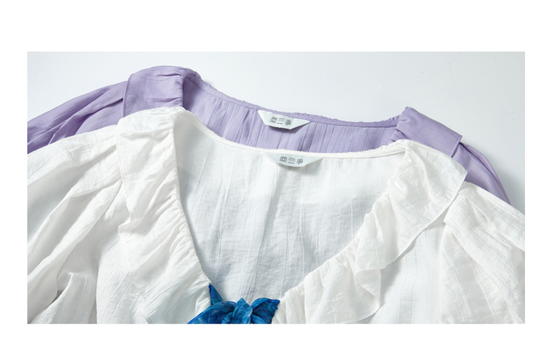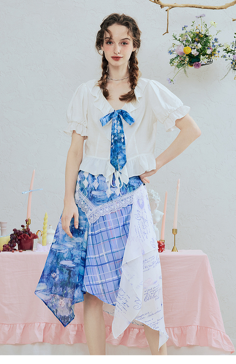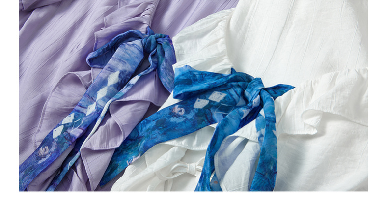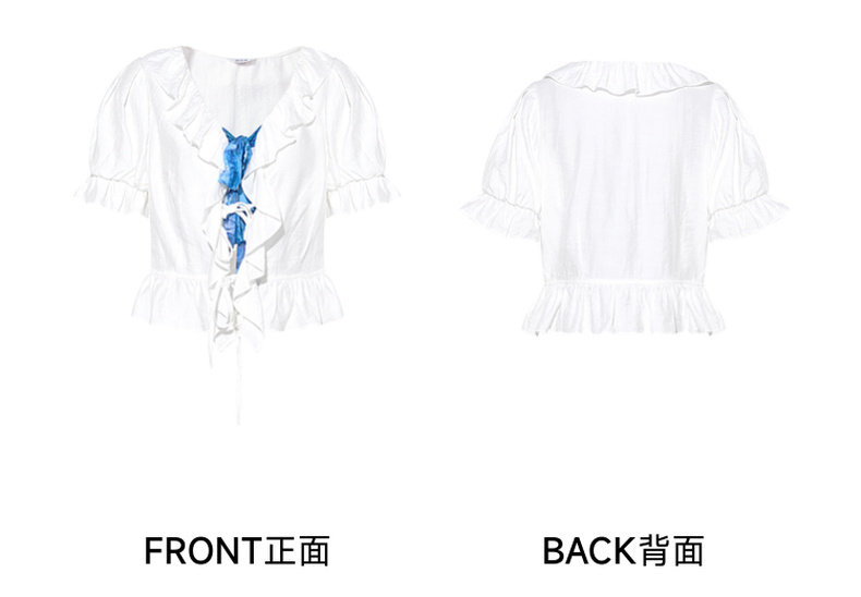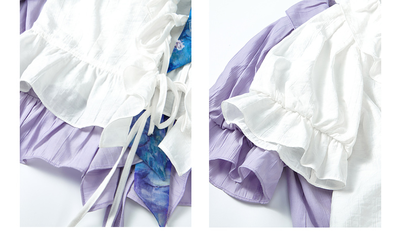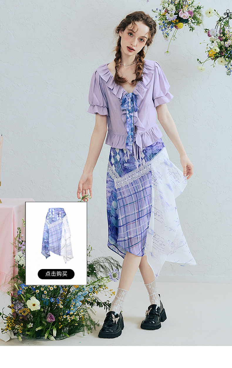 两三事 花楹织夏 2025夏季新款甜美泡泡袖荷叶边印花绑带衬衫女