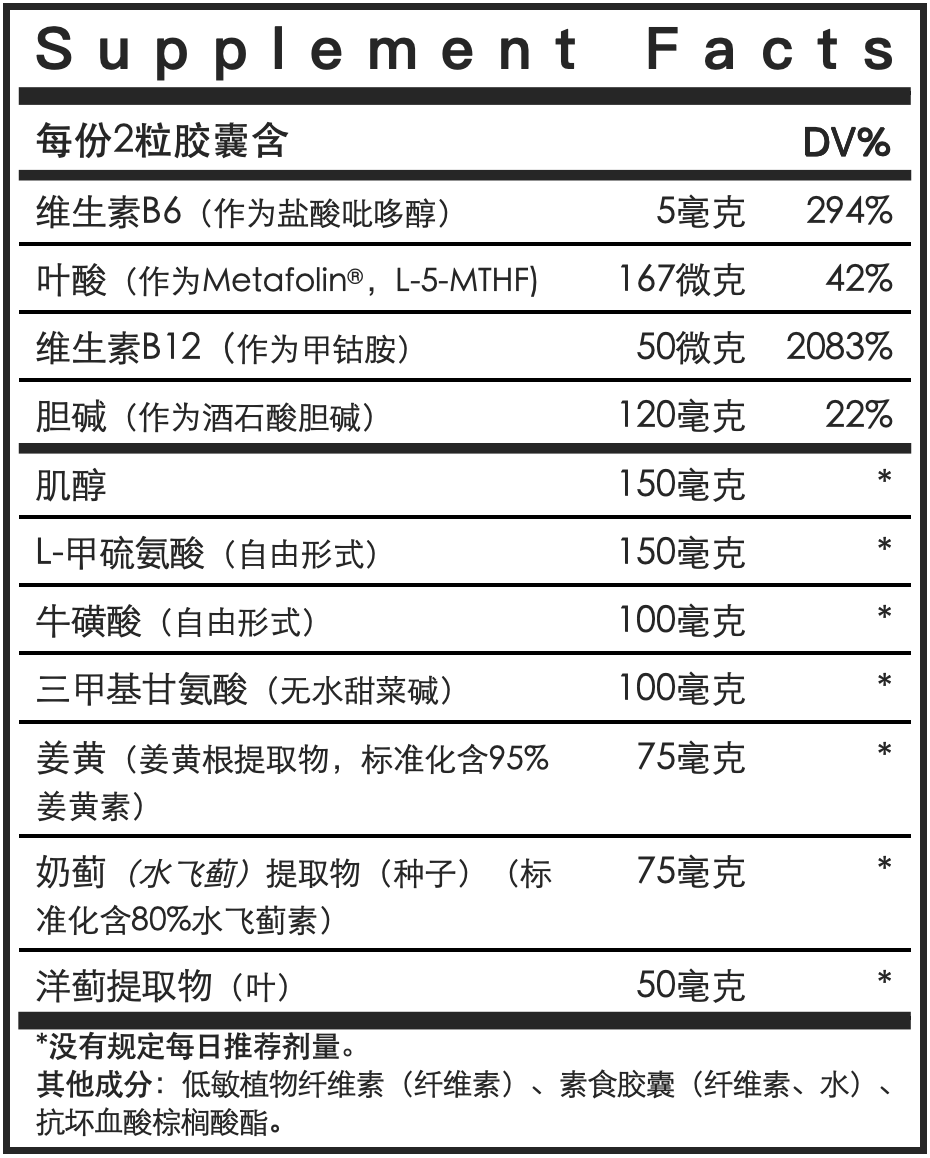 配方提供肝脏脂肪代谢、毒素代谢、胆汁流动和甲基化所需的必要营养成分。[1-9]