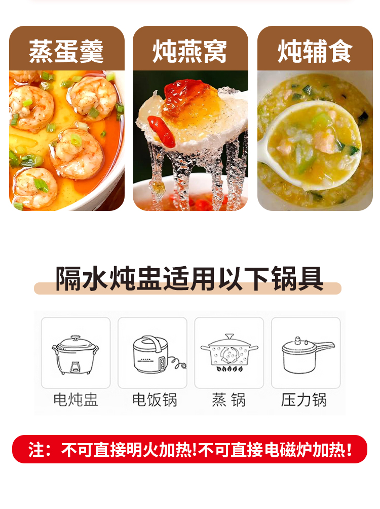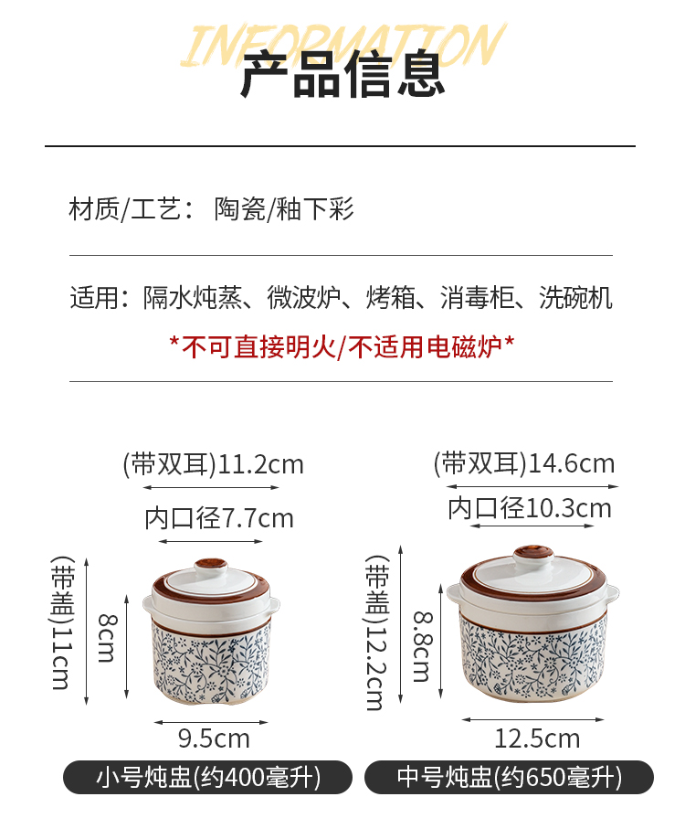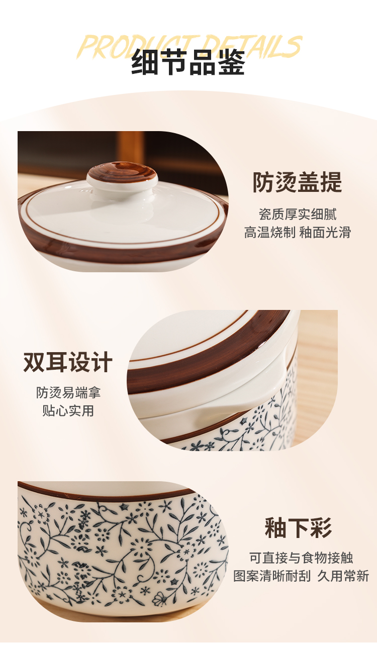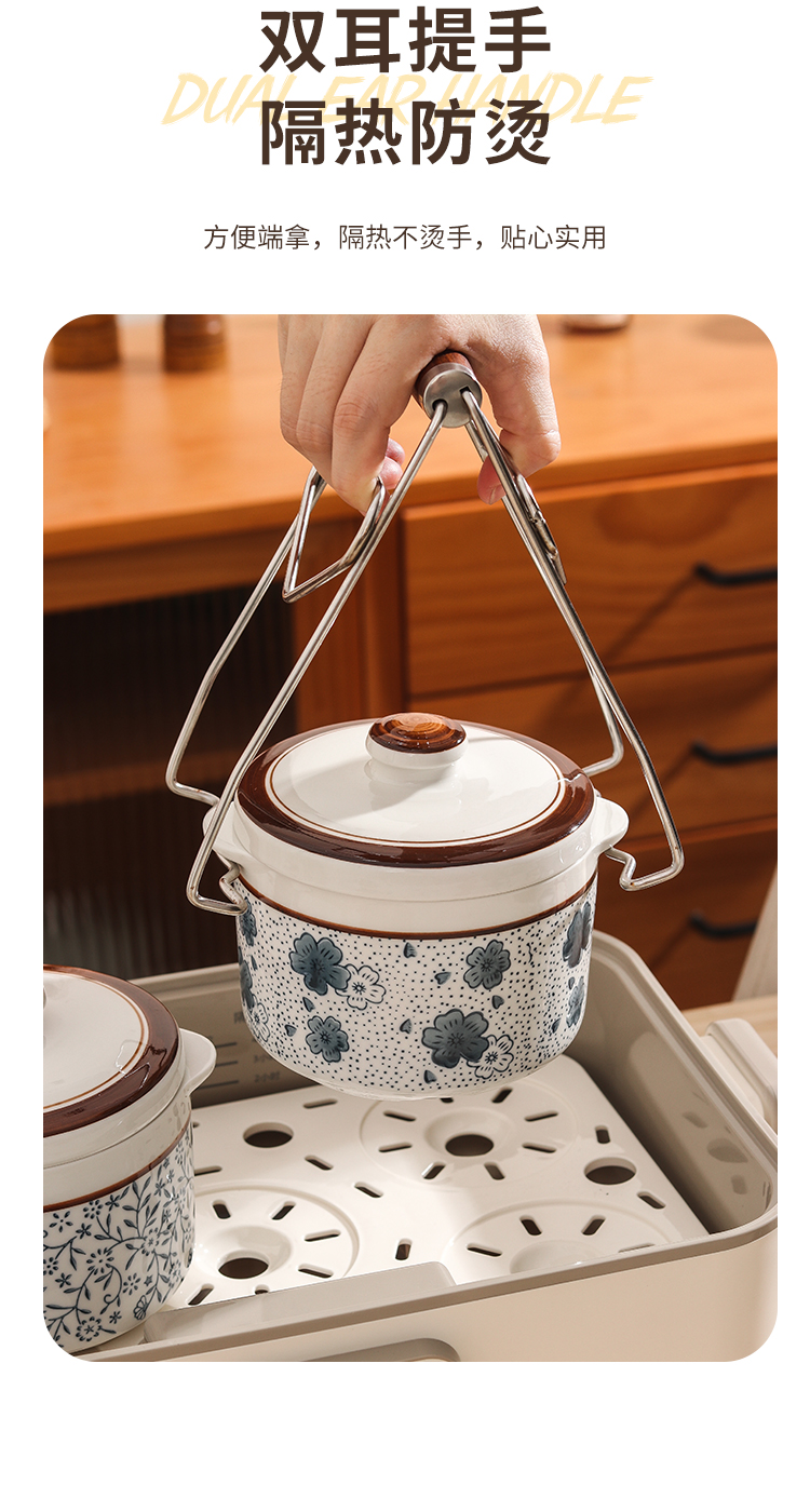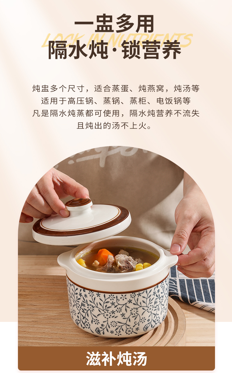 【详情】✅400毫升,650毫升,1000毫升几个容量,灵活实用性强✅独特锅沿设计,有效防止汤汁外溢,锁住营养✅炖汤、煮粥、炖甜品均可
