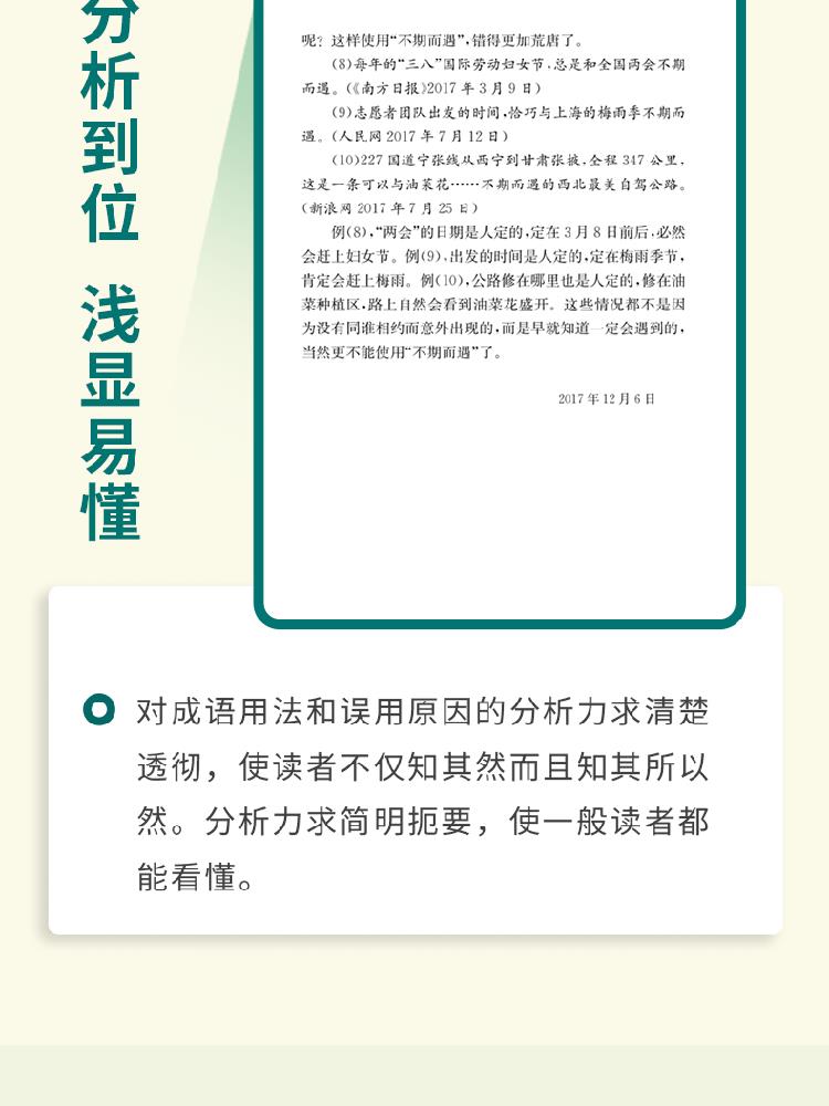 本书是作者继《成语误用辨析200例》(2013)和《成语误用辨析200例续编》(2018)之后写的又一部文集。是针对2017—2019三年间社会上误用甚至滥用成语的情况写成的小文章200篇。作者从2008年开始,陆续写了一批辨析成语误用的小文章,发表在《语文建设》《中学语文教学》等语文刊物和新闻刊物上发表,反响较好。每篇文章讲一条成语,千字左右。先说这条成语怎么讲,理解和运用这条成语要注意些什么,然后举出媒体中误用的例子,分析错在哪里,原因何在,必要时也指出应该怎样修改。《成语误用辨析200例》即是这些文章的汇编。 本书有以下几个特点: 一、所选200条成语是2017—2019三年中媒体中误用频率较高的,具有实用性和针对性。 二、所举错误用例比较多,而且都取自近期主要报刊和主要网站,以便说明问题的严重性和普遍性。 三、对成语用法和误用原因的分析力求清楚透彻,使读者不仅知其然而且知其所以然。分析力求简明扼要,一般不旁征博引,使一般读者都能看懂。 四、对成语字面义和深层含义的解释力求准确,书证力求丰富、典型。