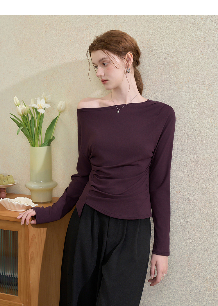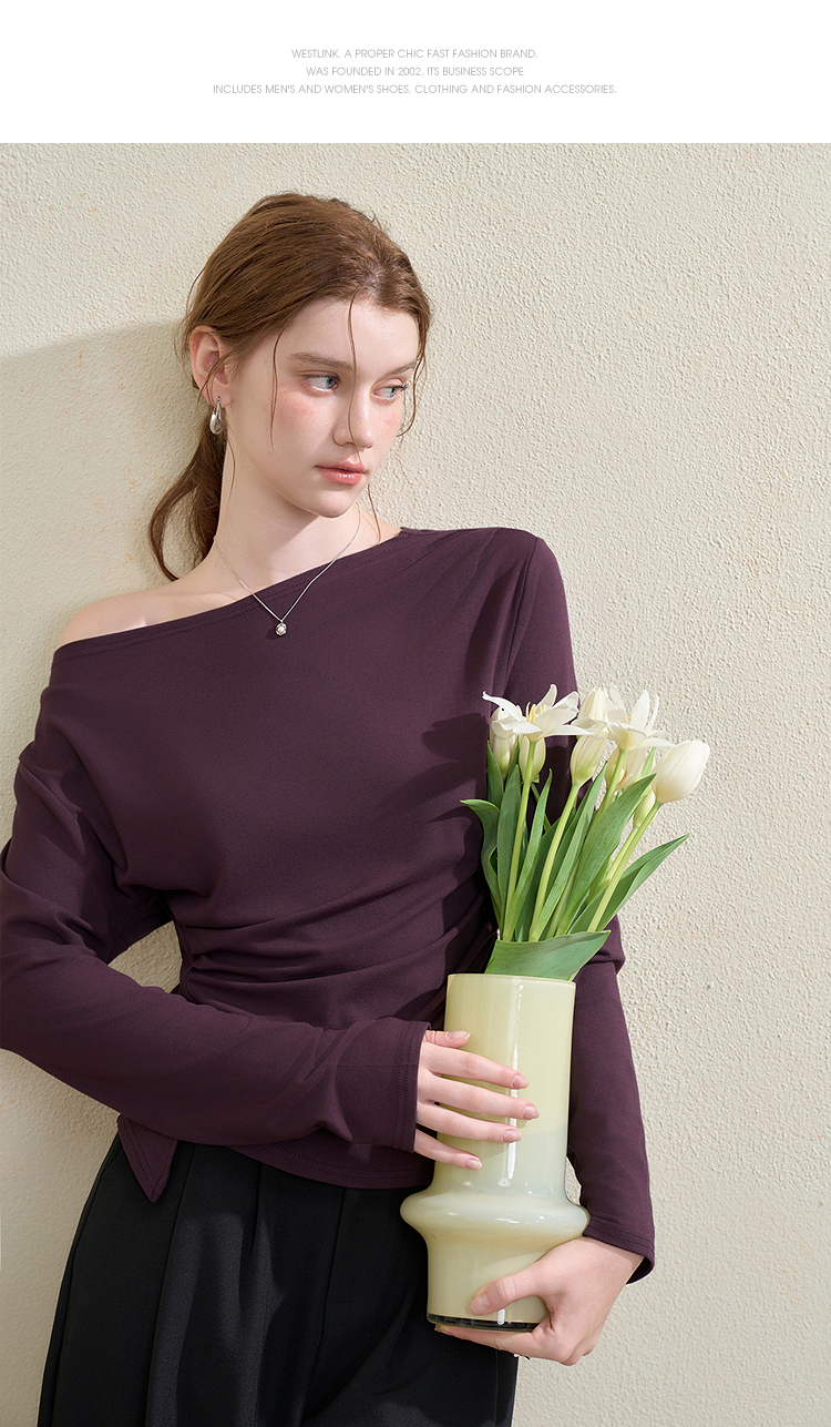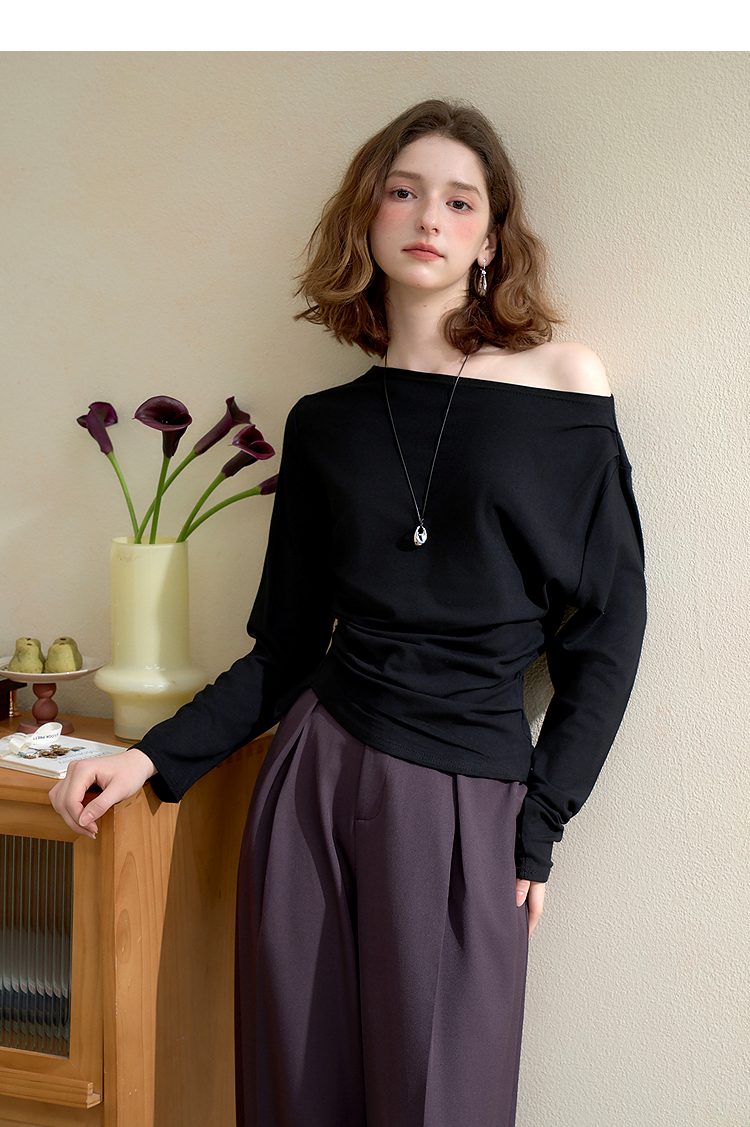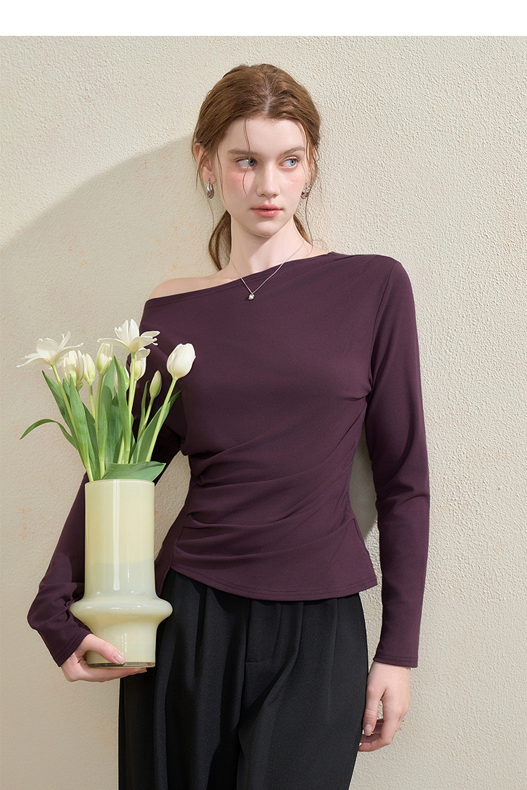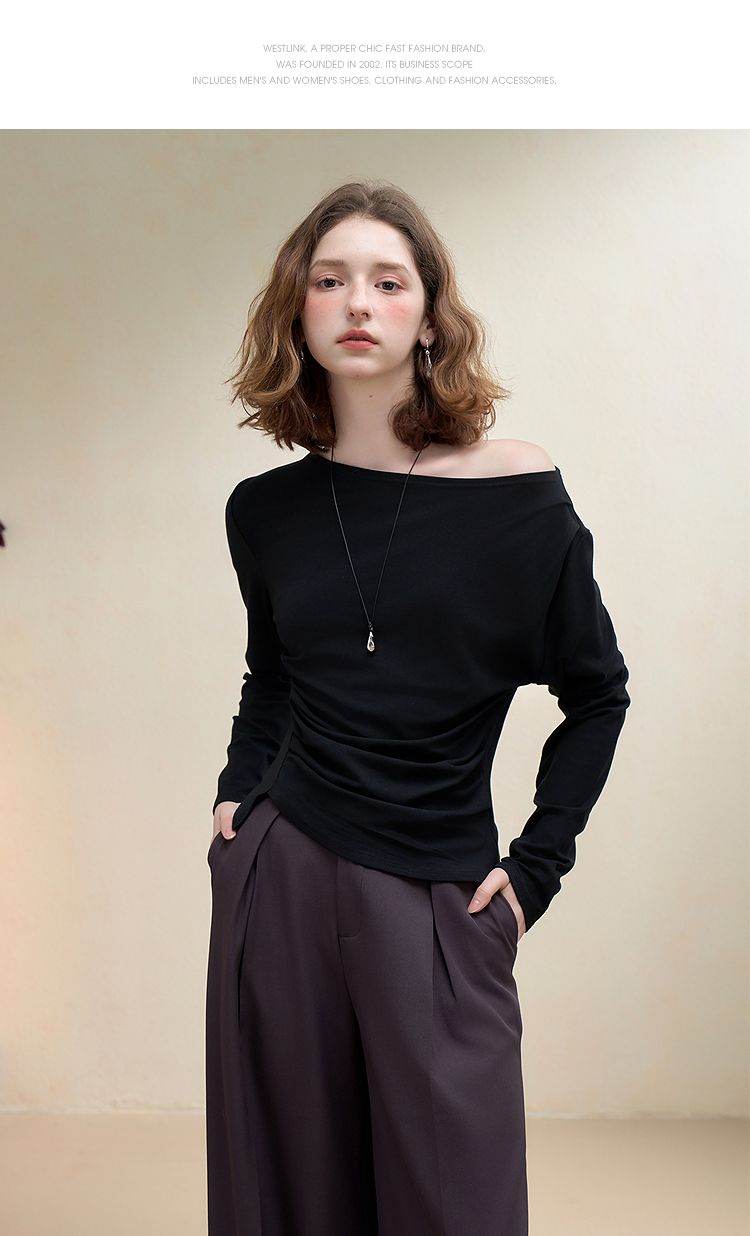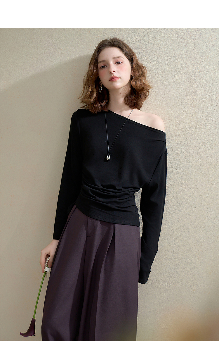 西遇韩系气质斜肩长袖T恤女秋季设计感抽褶收腰显瘦纯色上衣H0055147