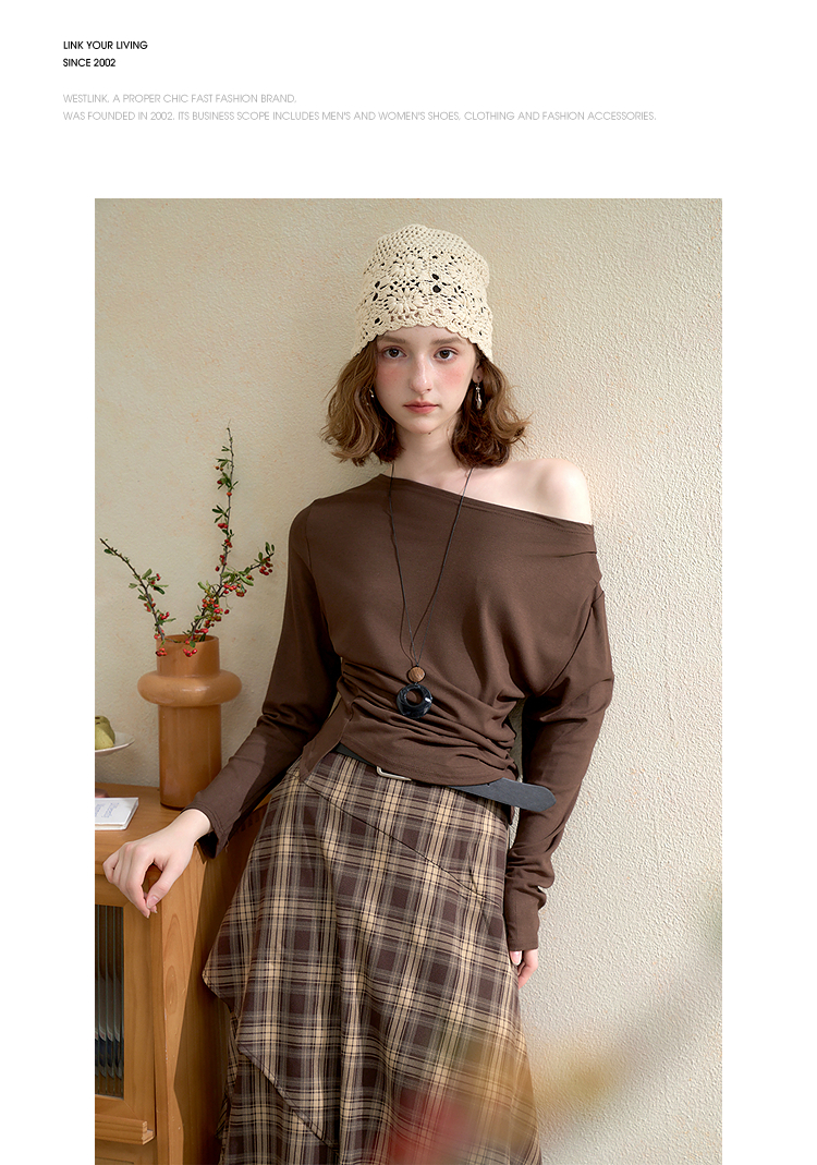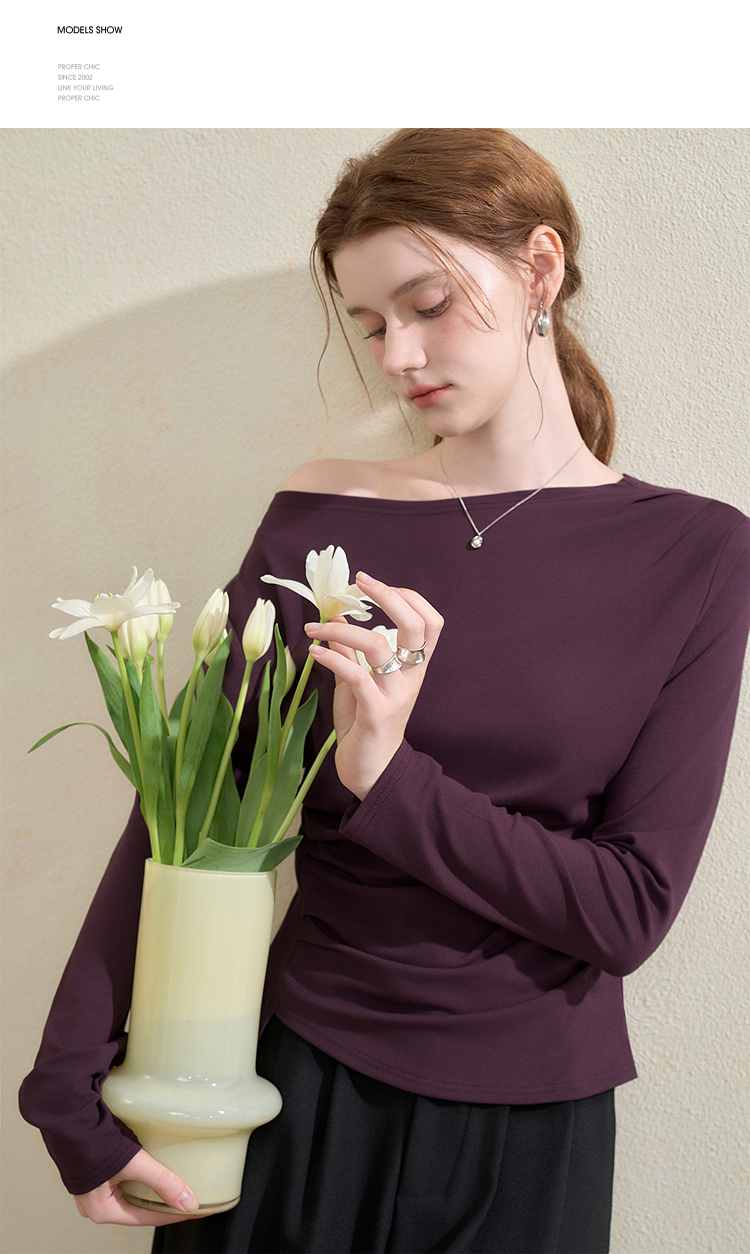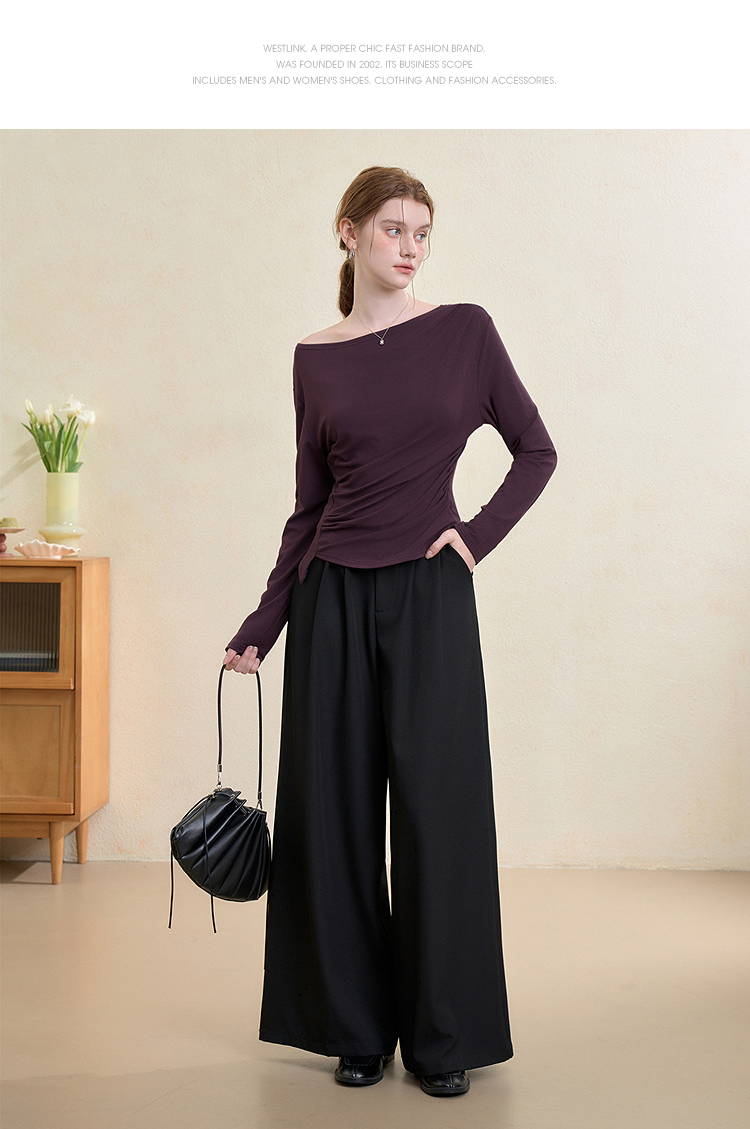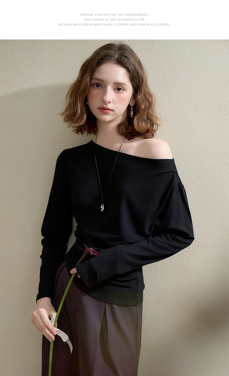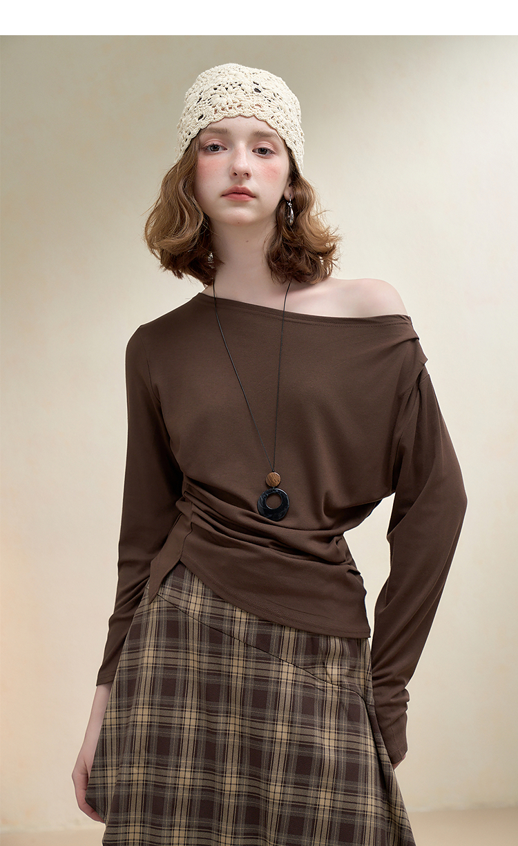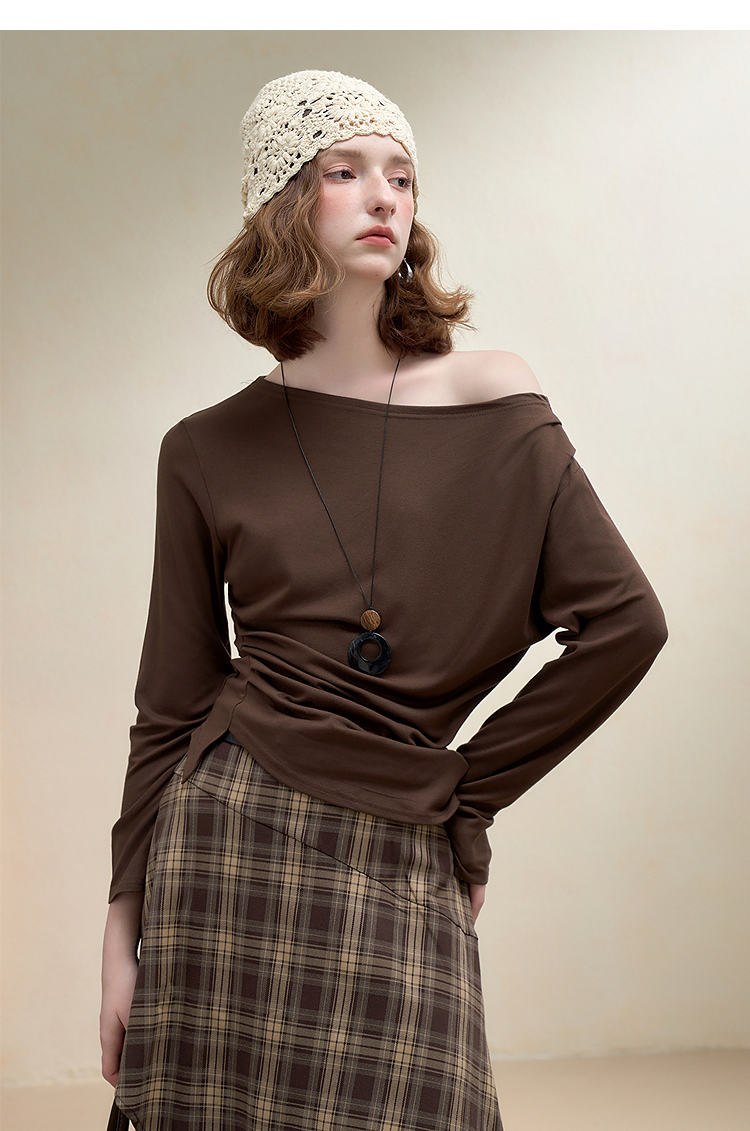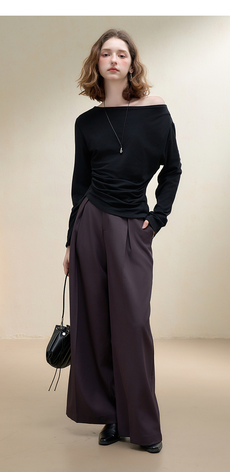 西遇韩系气质斜肩长袖T恤女秋季设计感抽褶收腰显瘦纯色上衣H0055147