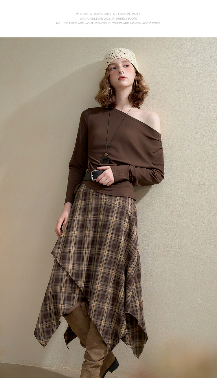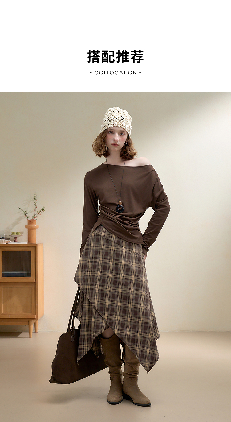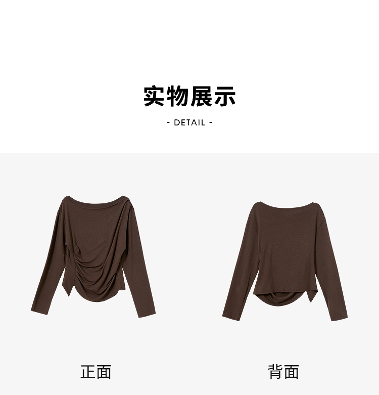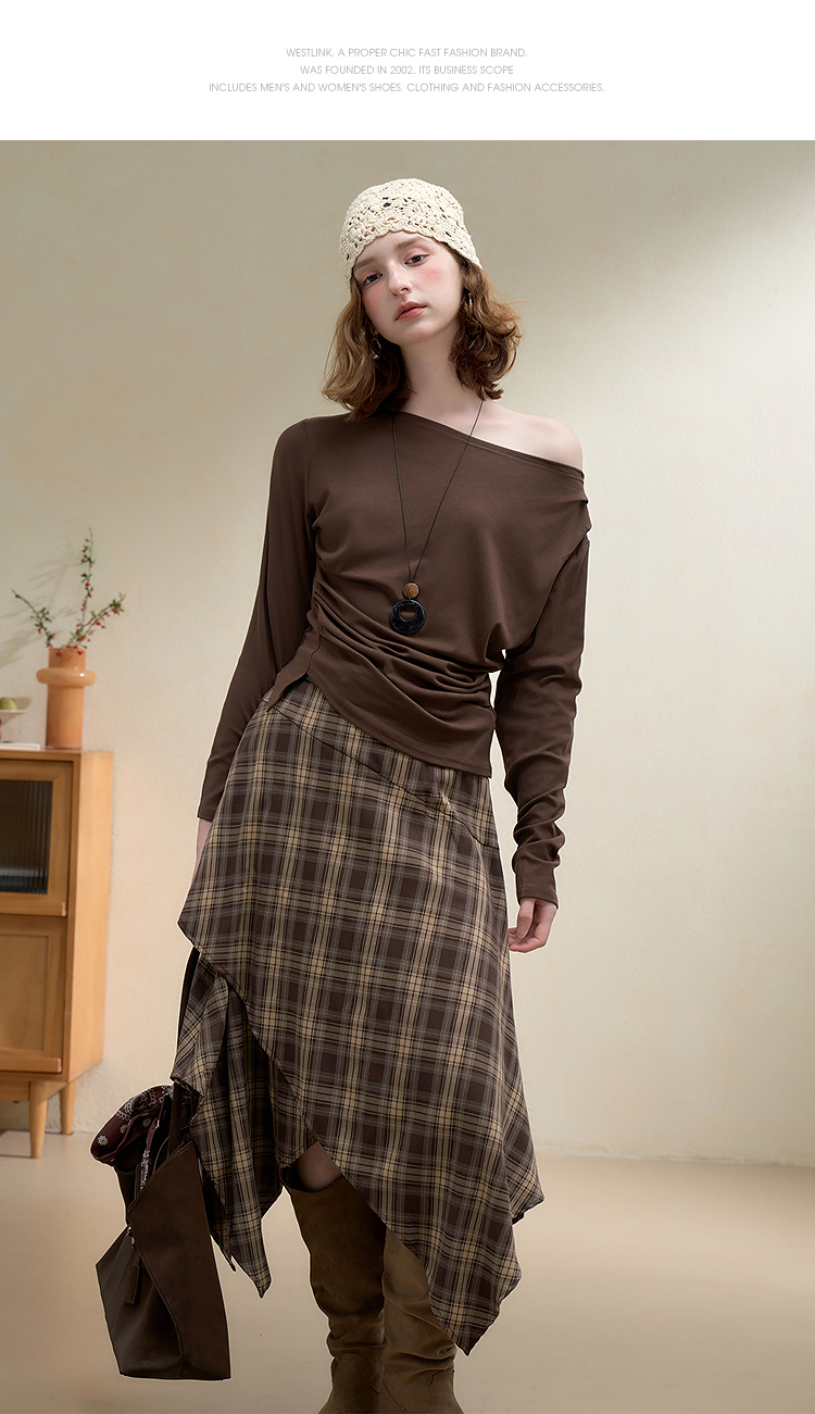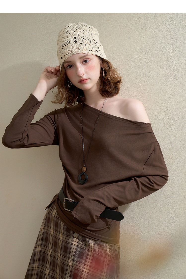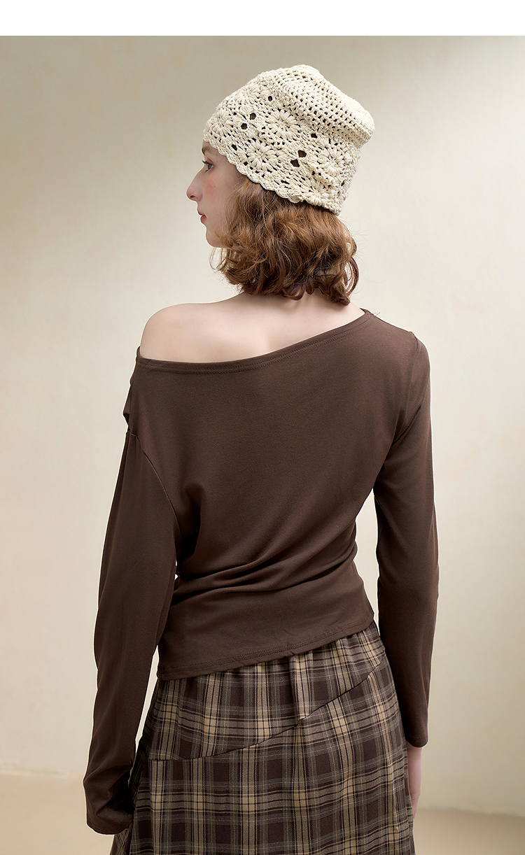 西遇韩系气质斜肩长袖T恤女秋季设计感抽褶收腰显瘦纯色上衣H0055147