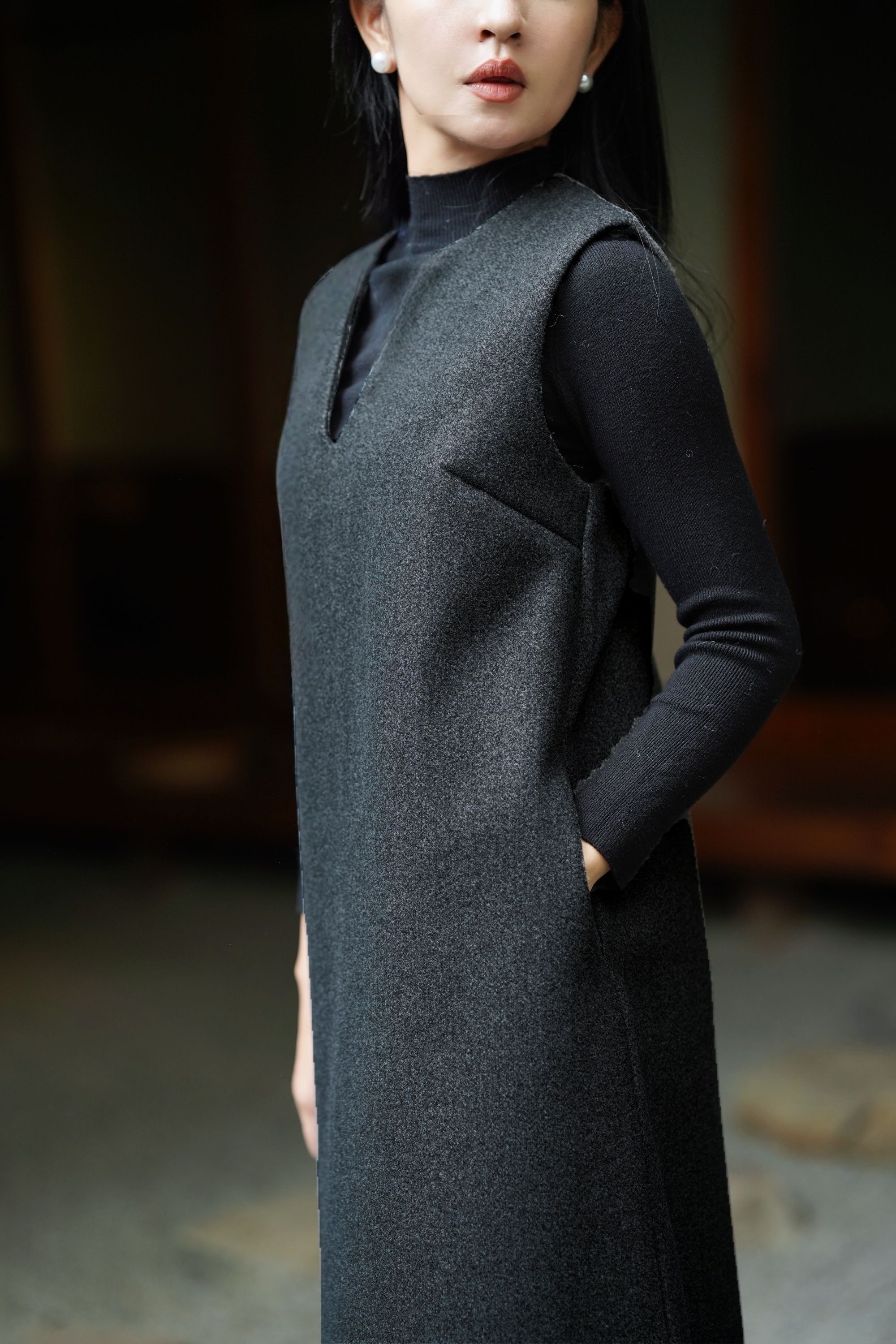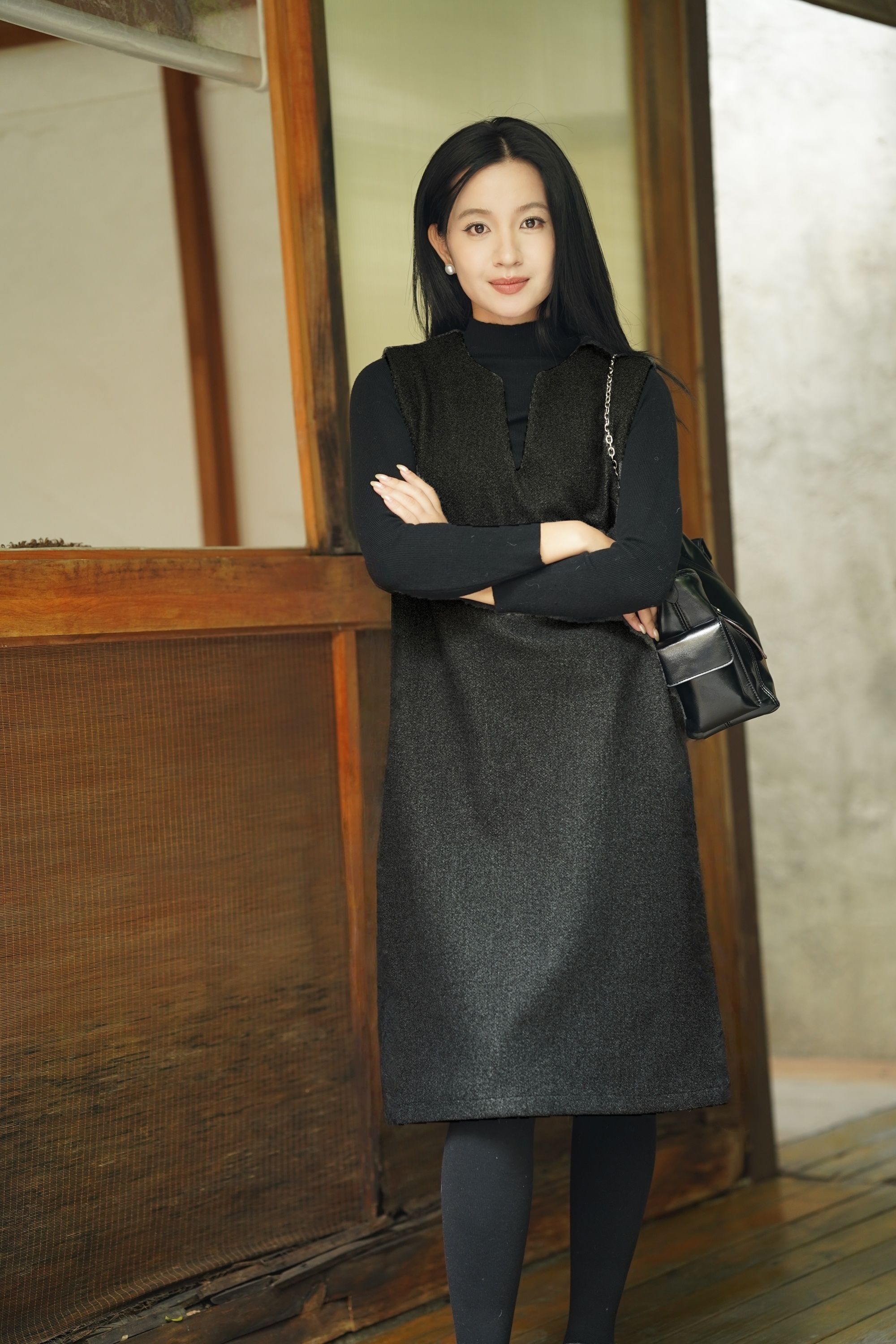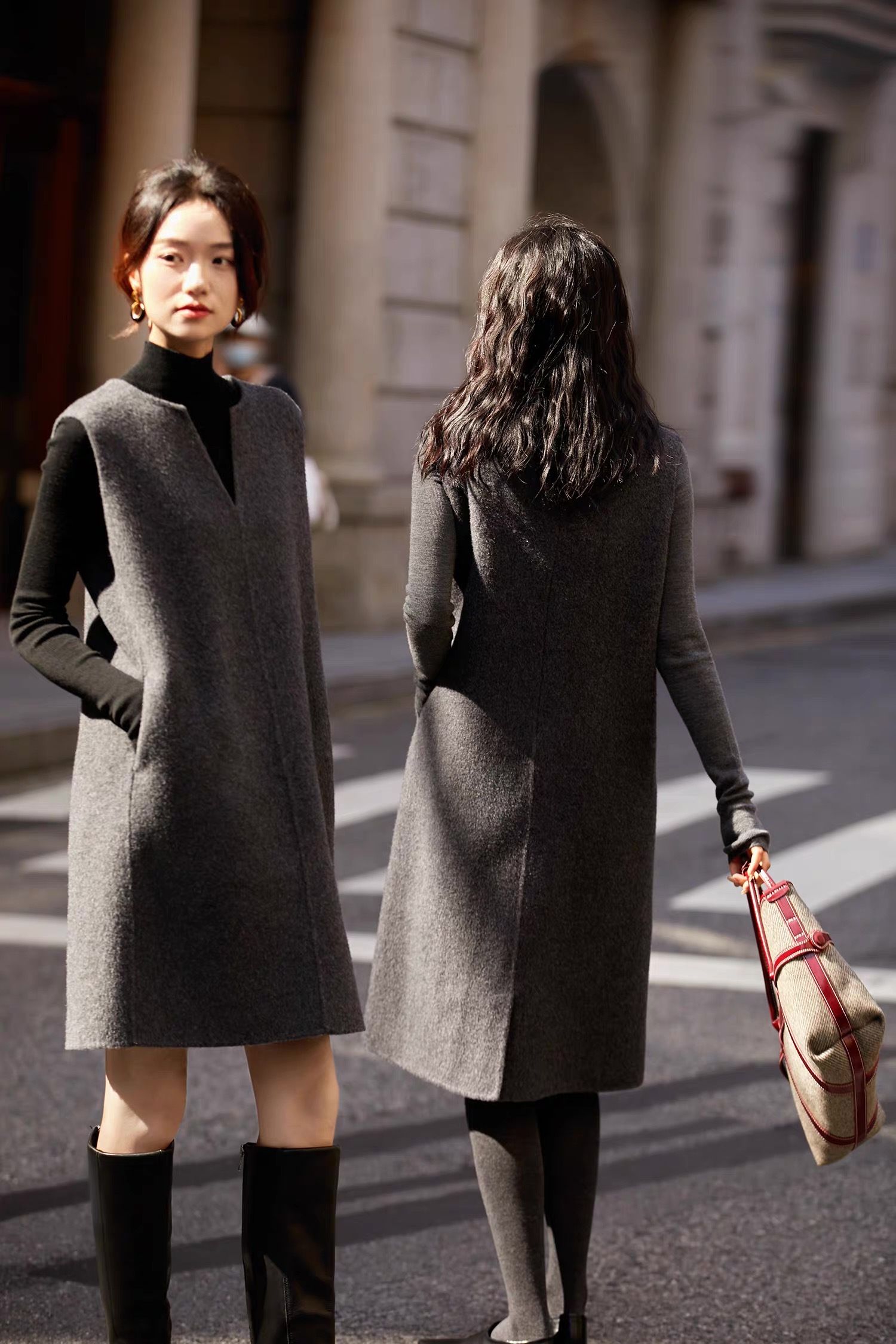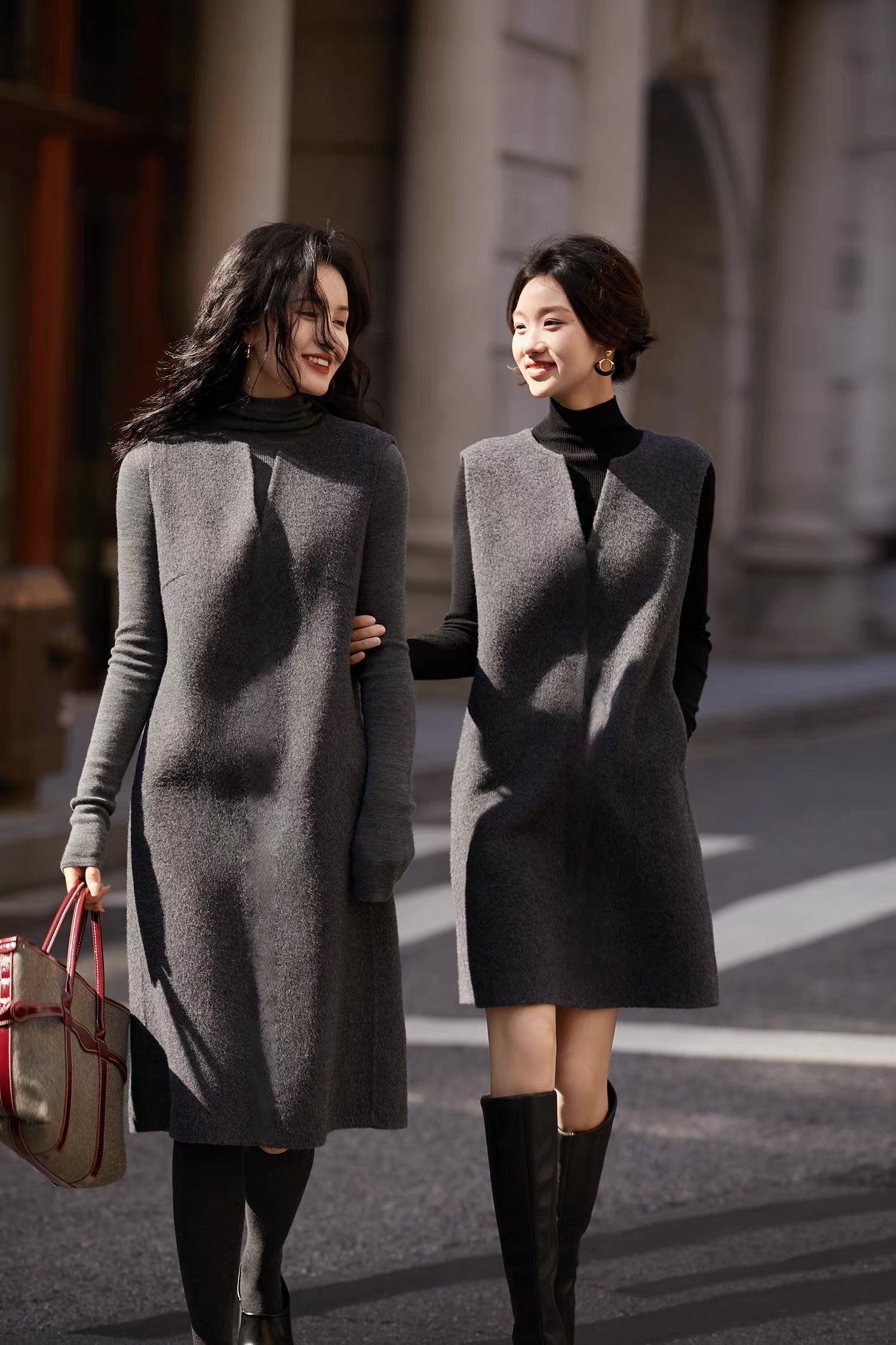 一条V领毛呢背心裙,无论是雾花灰还是安卡拉红款,都是日常wan能百搭单品~,基础搭配很惊喜的,质感和美貌同时在线的大爱款!