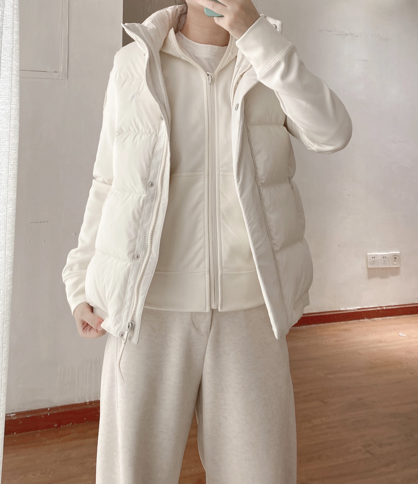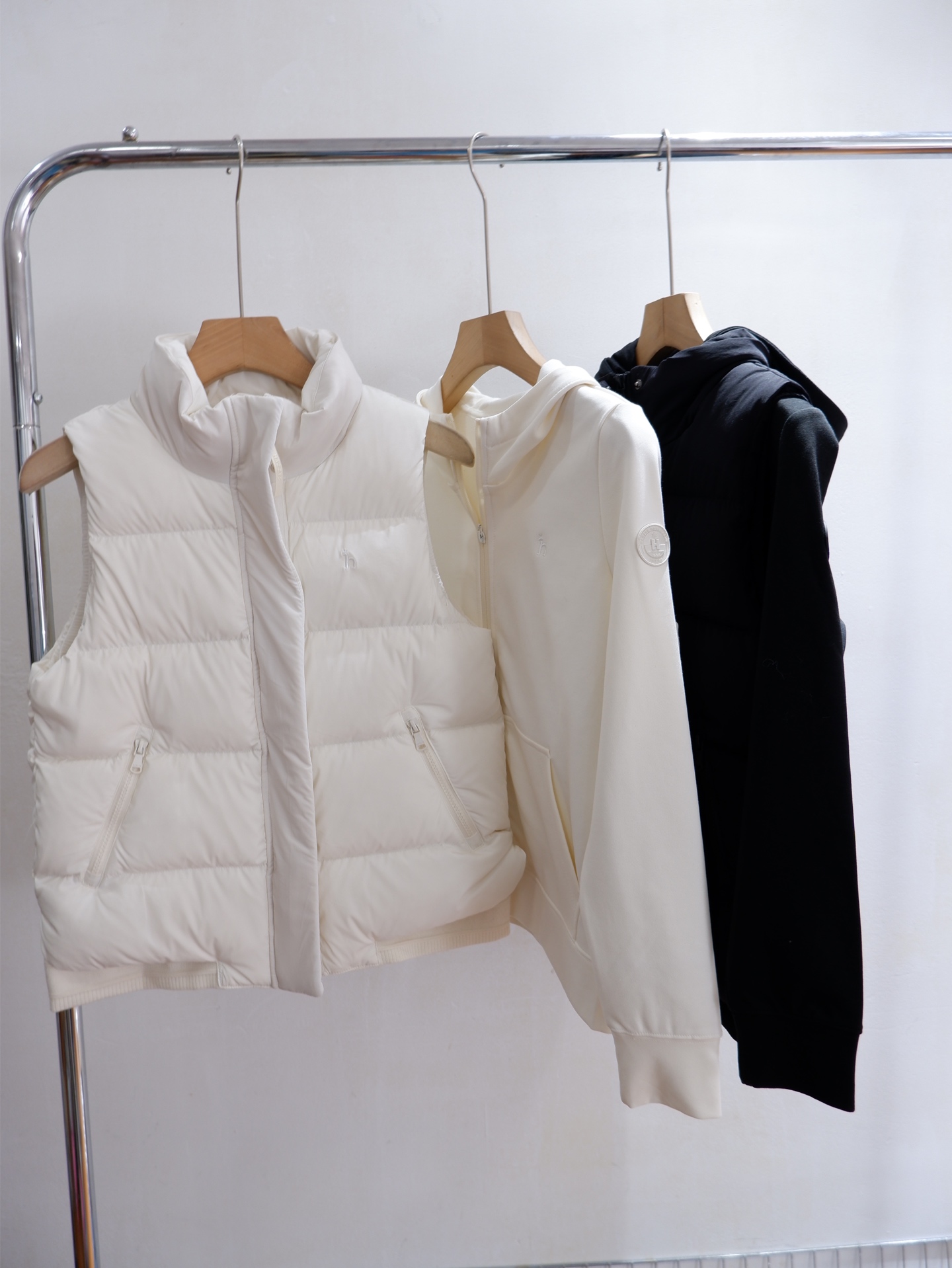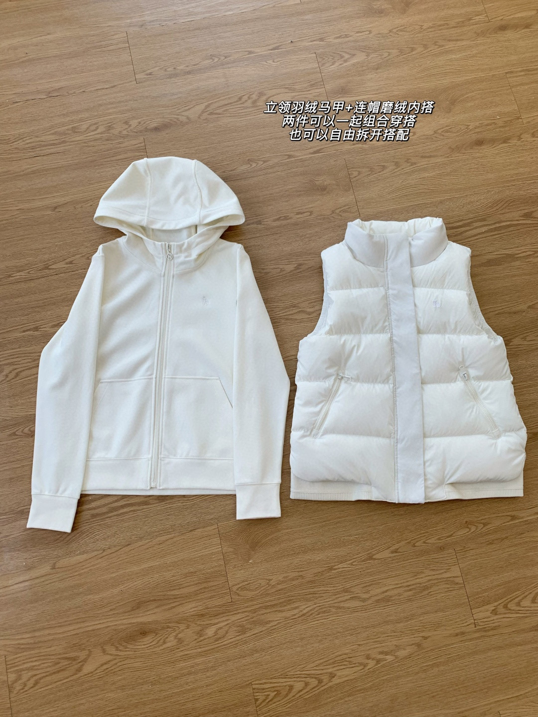 立领羽绒马甲+连帽磨绒内搭,两件可以一起组合穿搭,也可以自由拆开搭配。