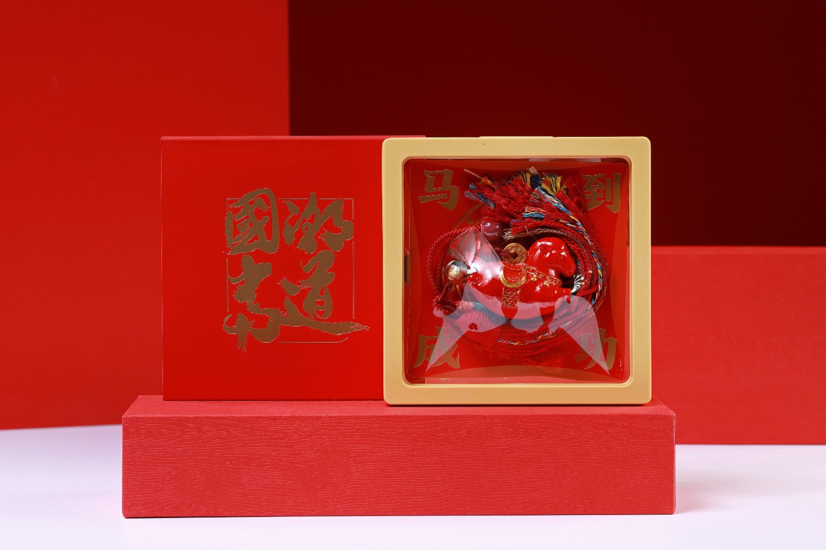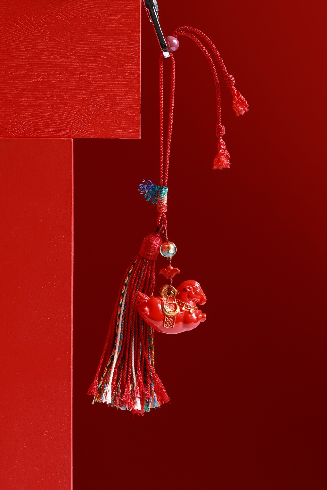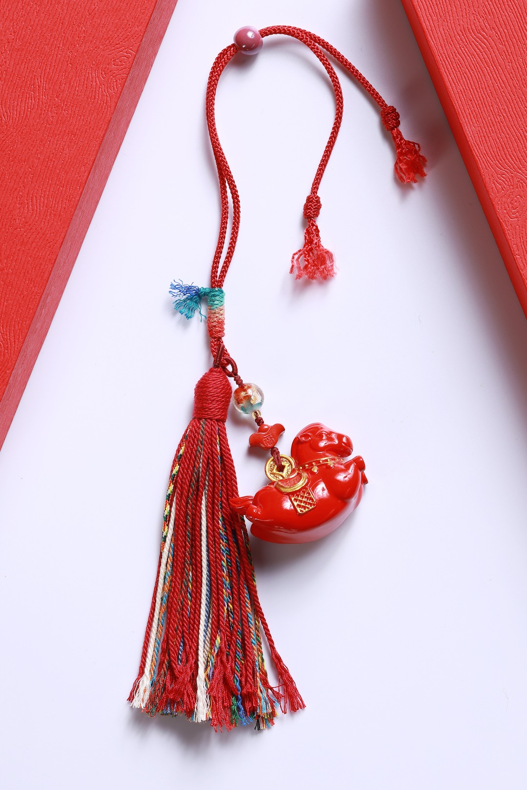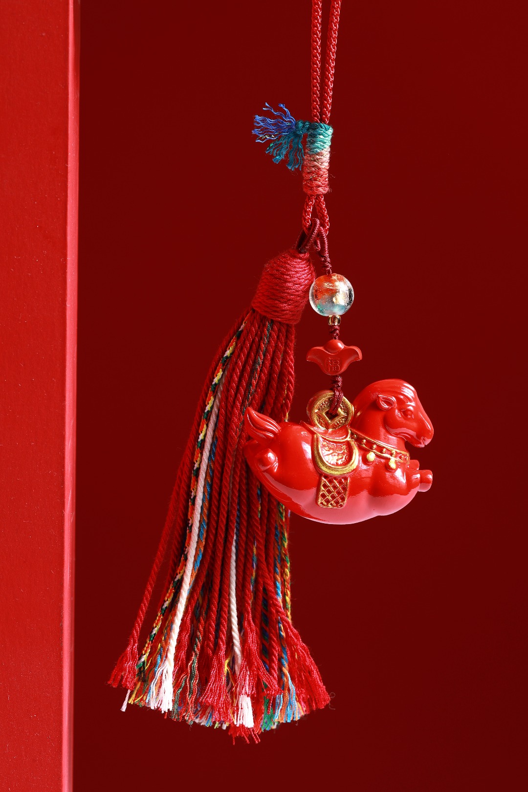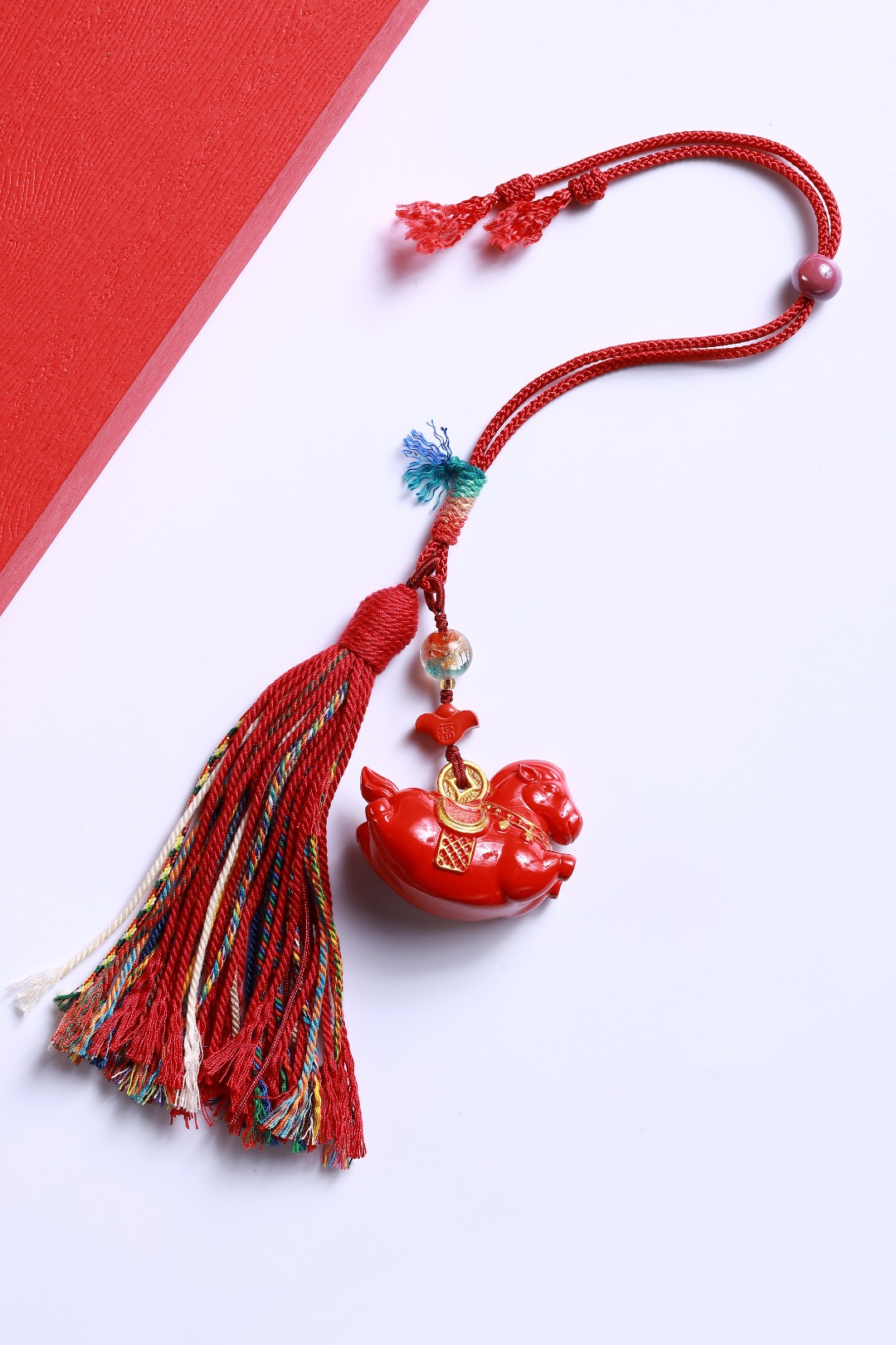 这款马上来财“鸿财款”挂饰。它的核心,是这个采用非遗大漆古法制作的萌马吊坠。这匹小马姿态奔腾,充满活力,马背上稳稳驮着一枚金光灿灿的金钱,寓意着财富与好运正奔腾而来。我们精心为它融入了独特的配饰:一颗寓意“紫气东来、贵人临门”的紫色香灰陶瓷福珠,再结合彩棉流苏与朱砂福字元宝。这意味着它不仅招财,更着重于为您开启人际机缘,吸引贵人扶助。特别推荐给常在商务场合、或希望拓展事业格局的朋友,悬挂于随身包袋或车内,寓意着为您转动人脉,将良机转化为实实在在的财富。