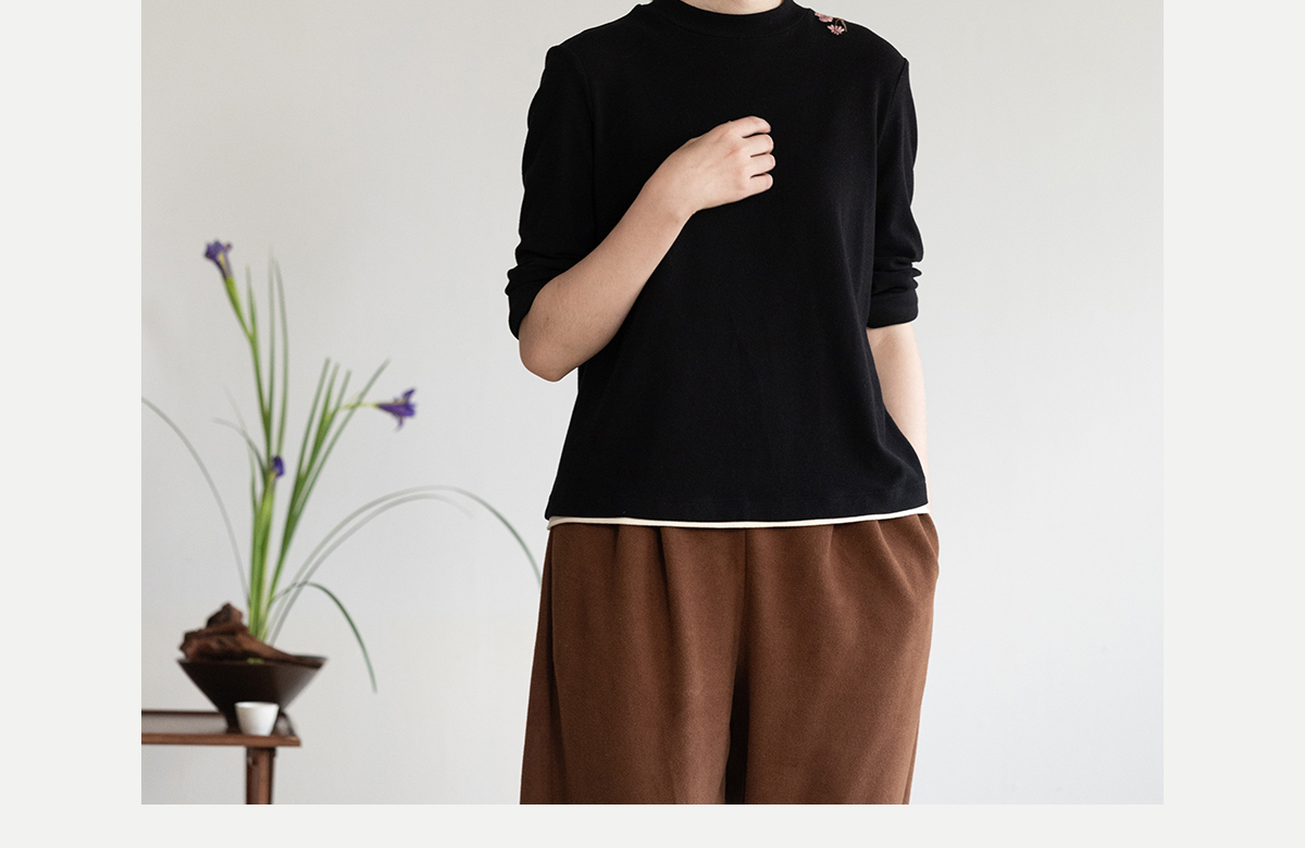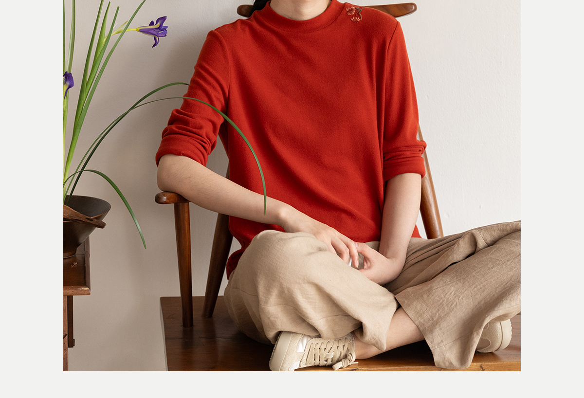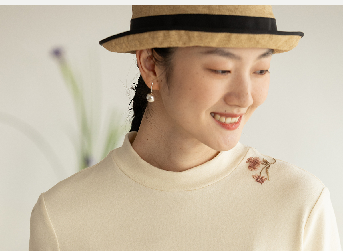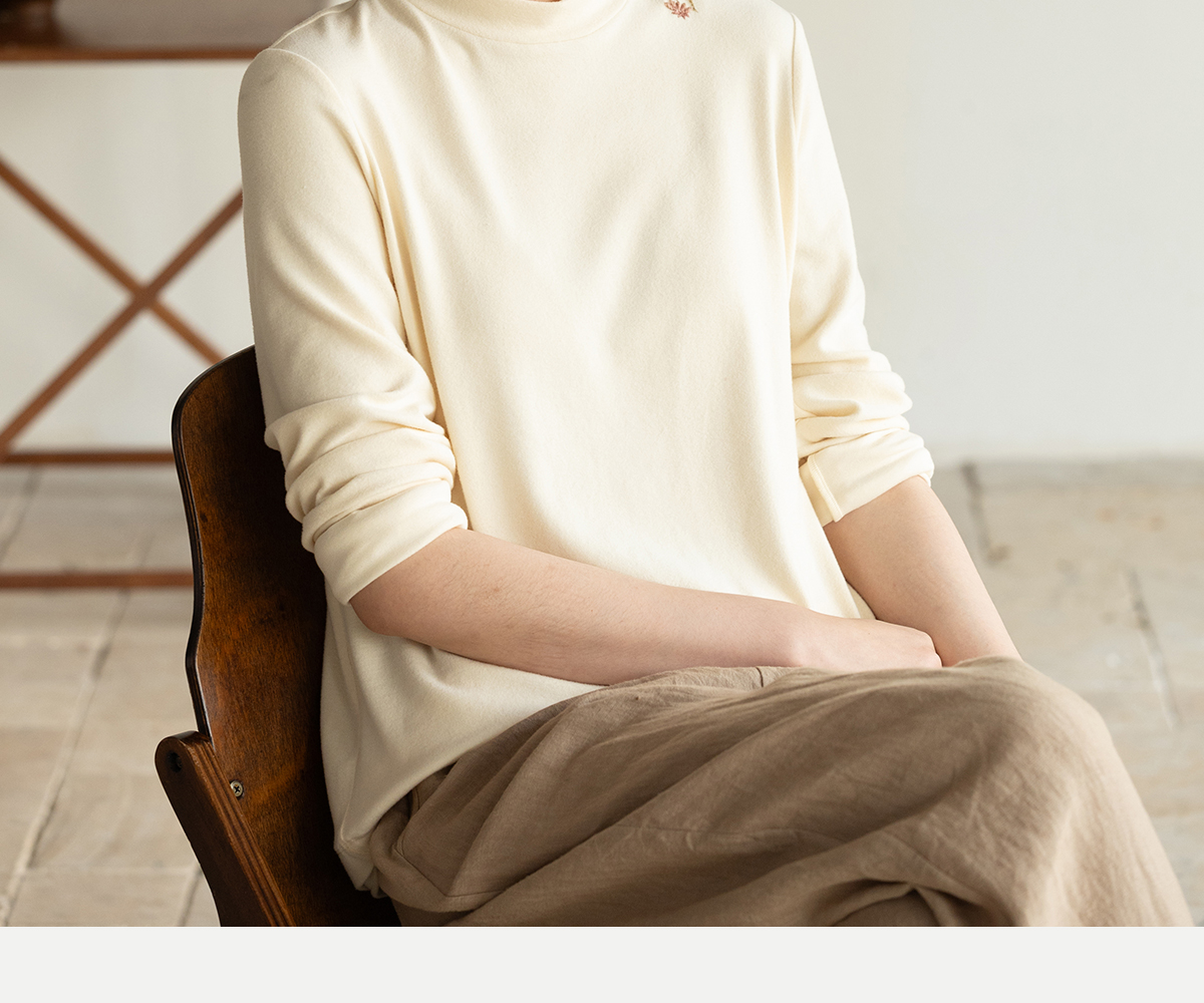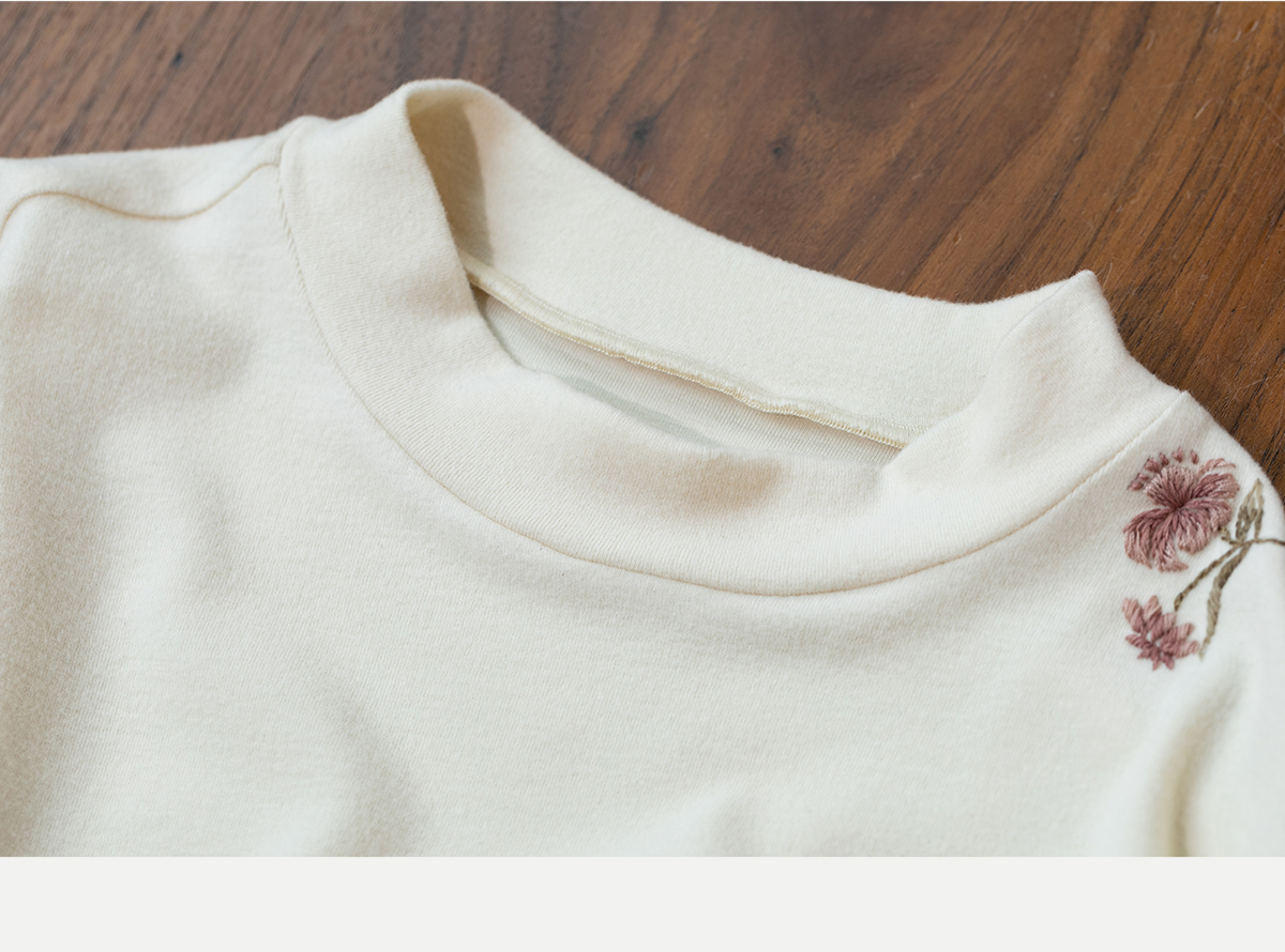 牧衣游原创 棉混纺手工刺绣T恤女秋新款保暖单穿可打底上衣 叁山