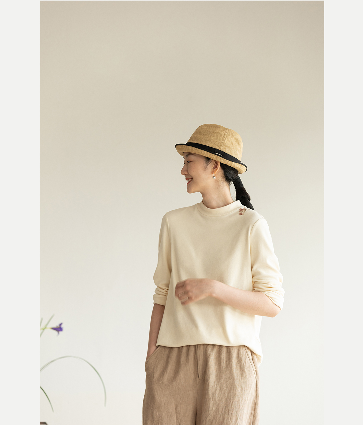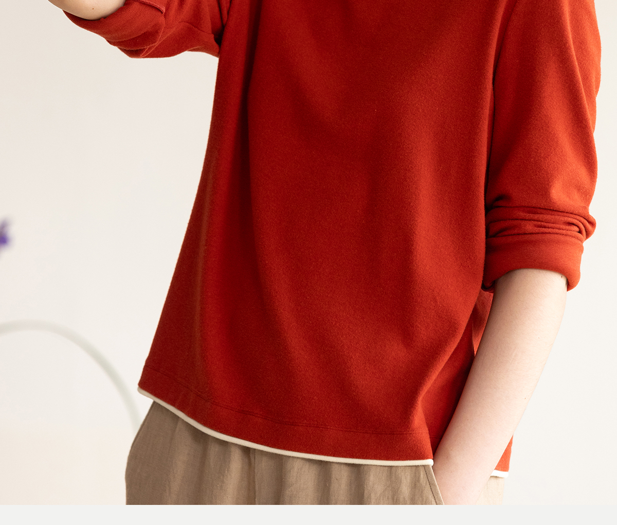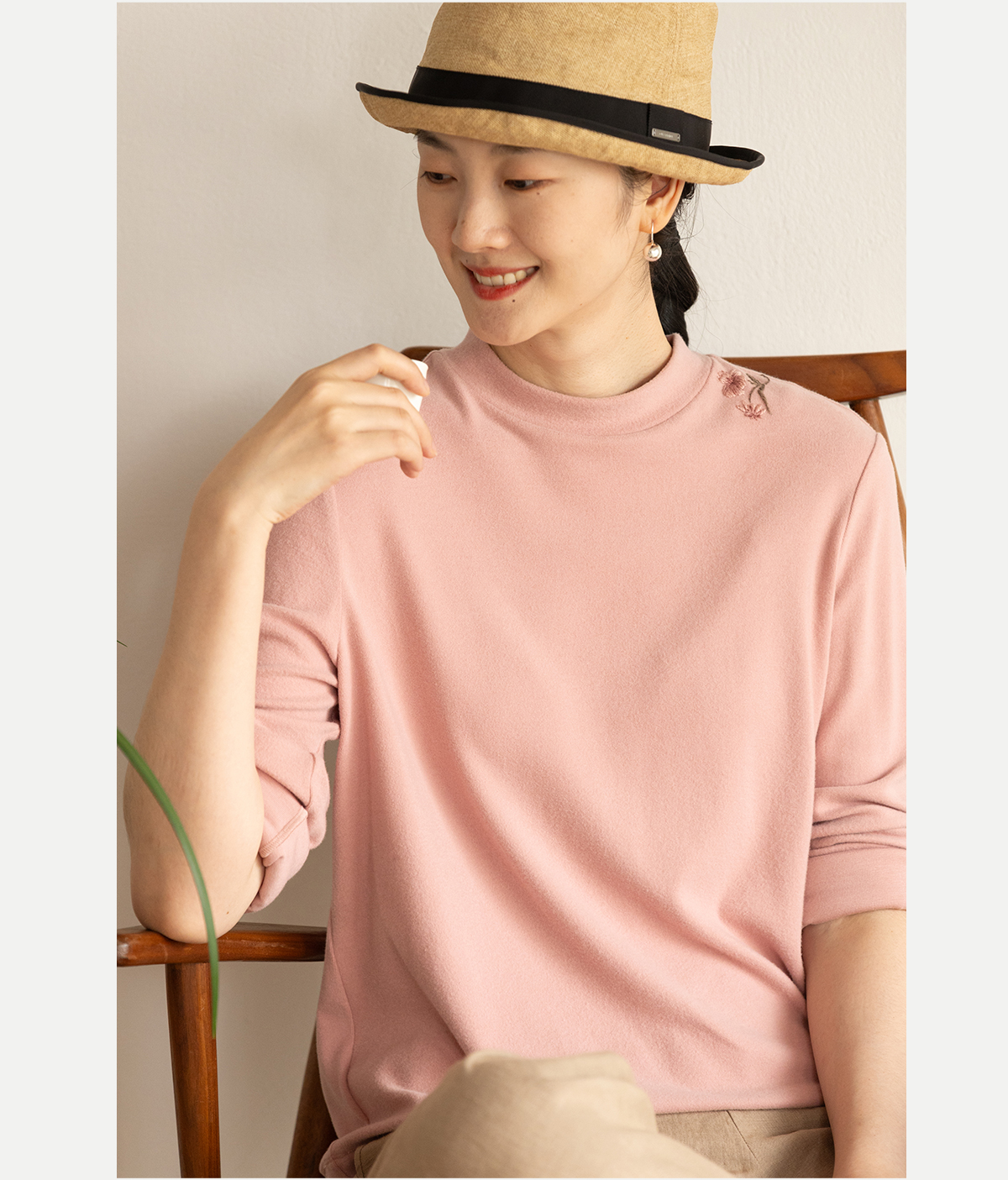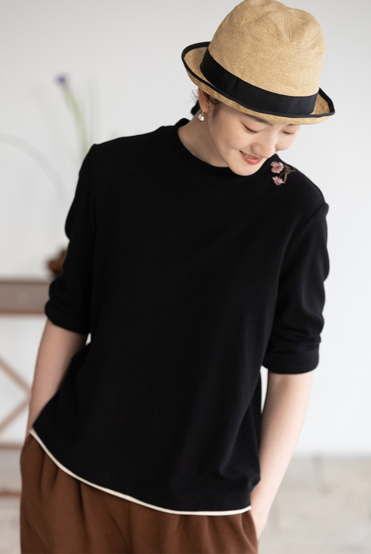 牧衣游原创 棉混纺手工刺绣T恤女秋新款保暖单穿可打底上衣 叁山