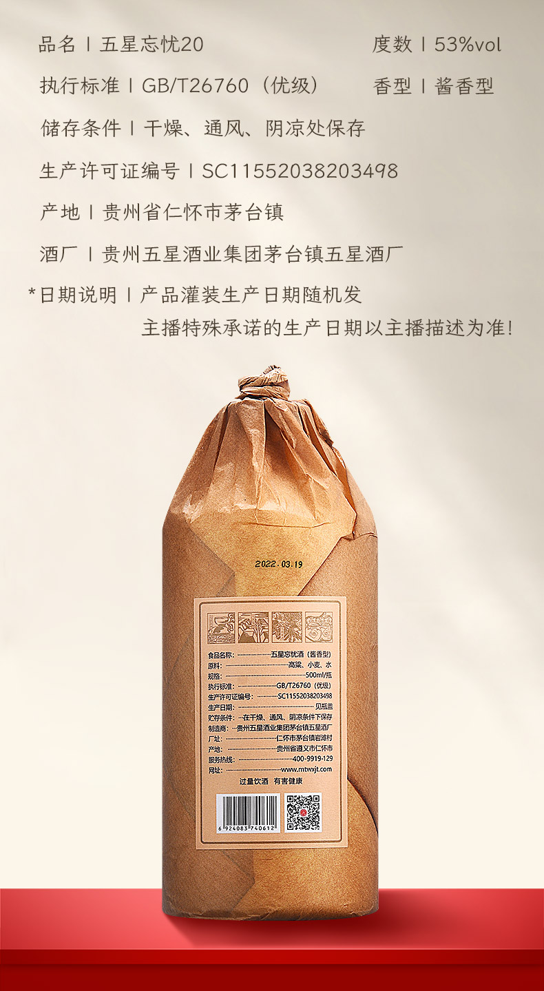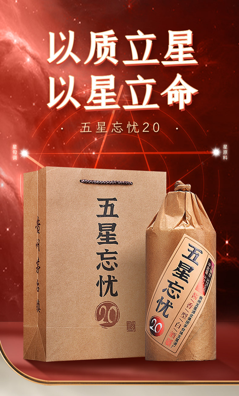 五星忘忧20 500ml 6瓶整箱 53度酱香型白酒 陈年坤沙好酒