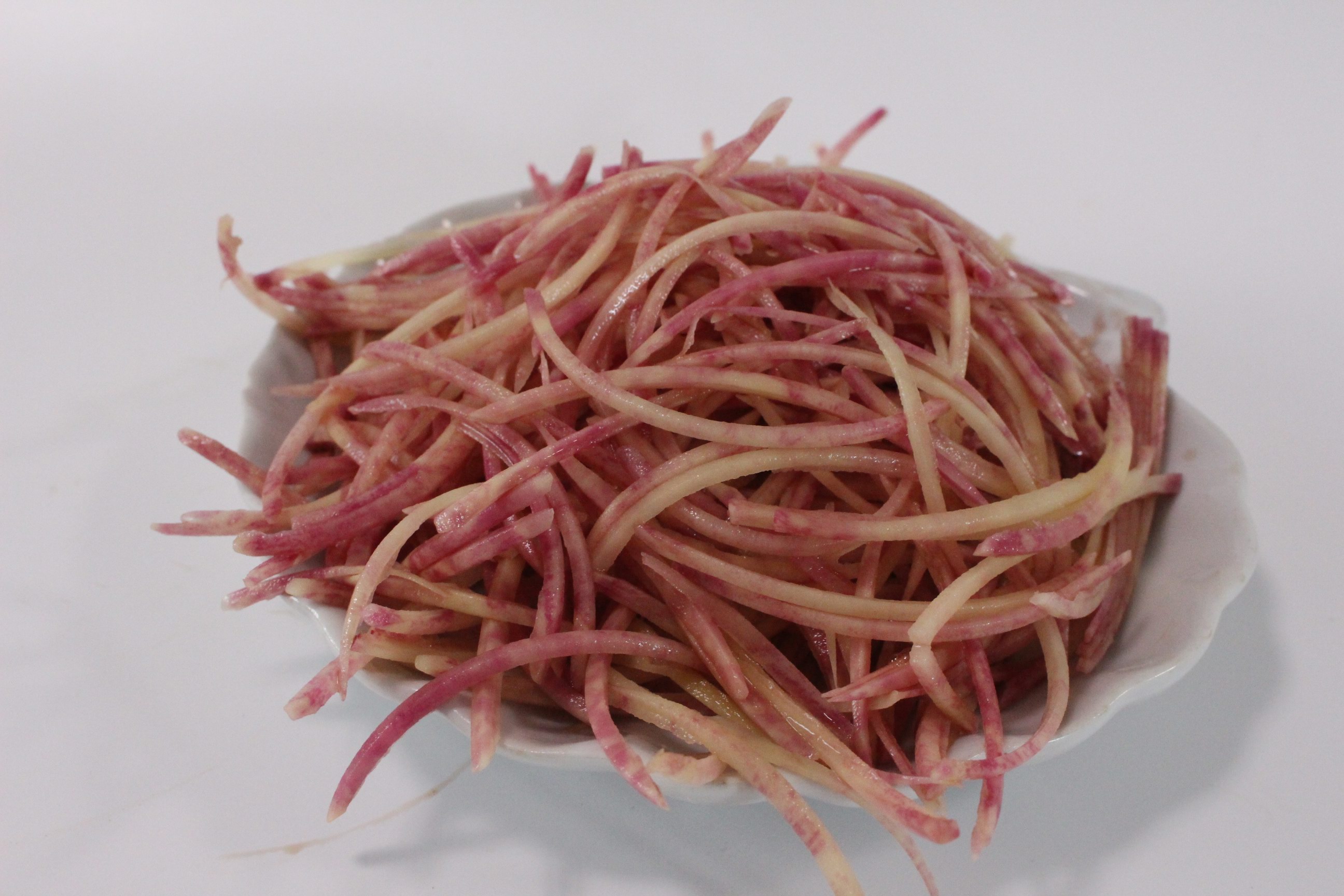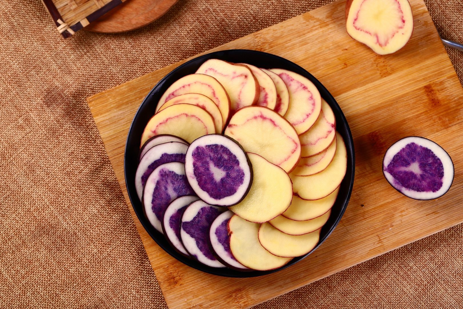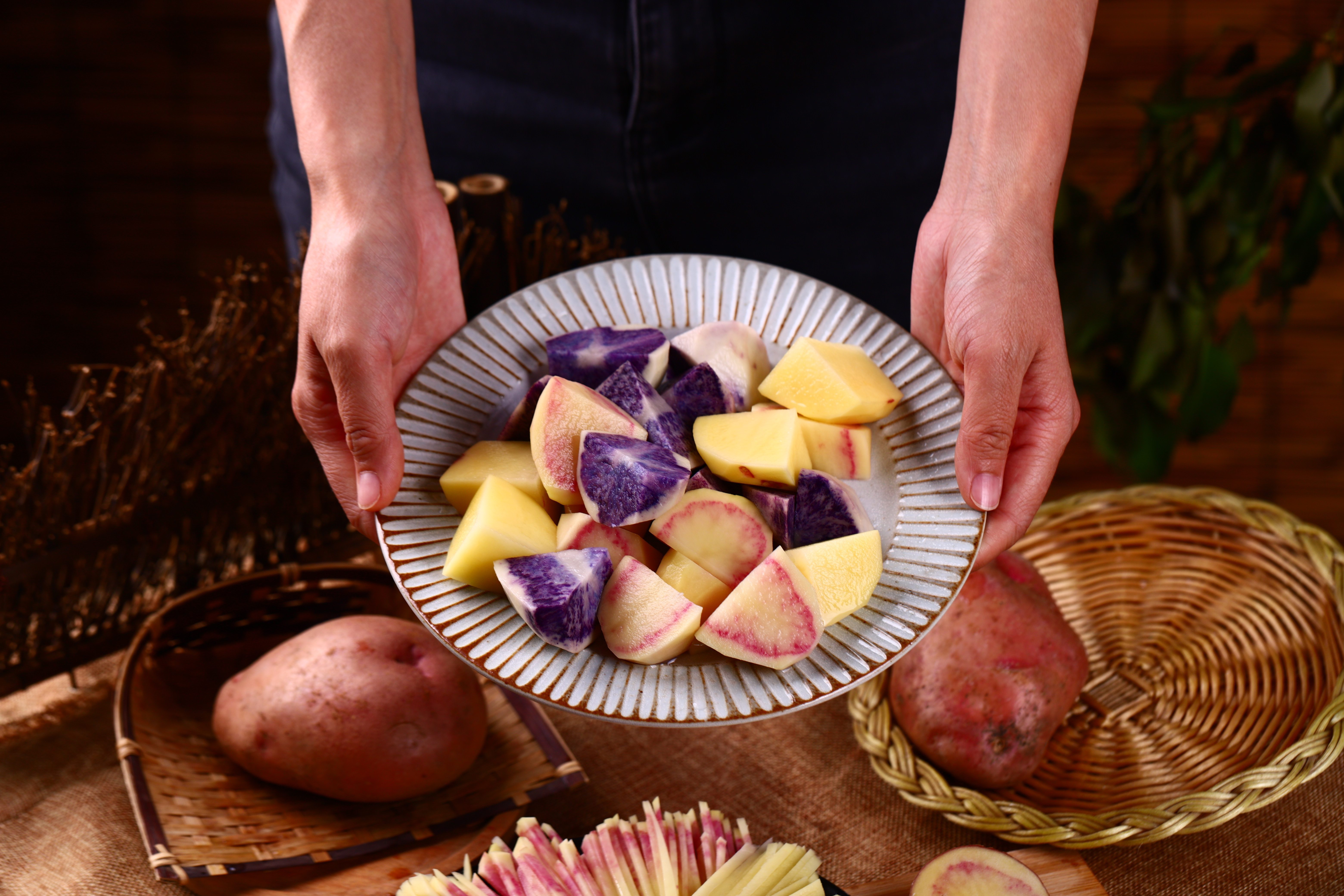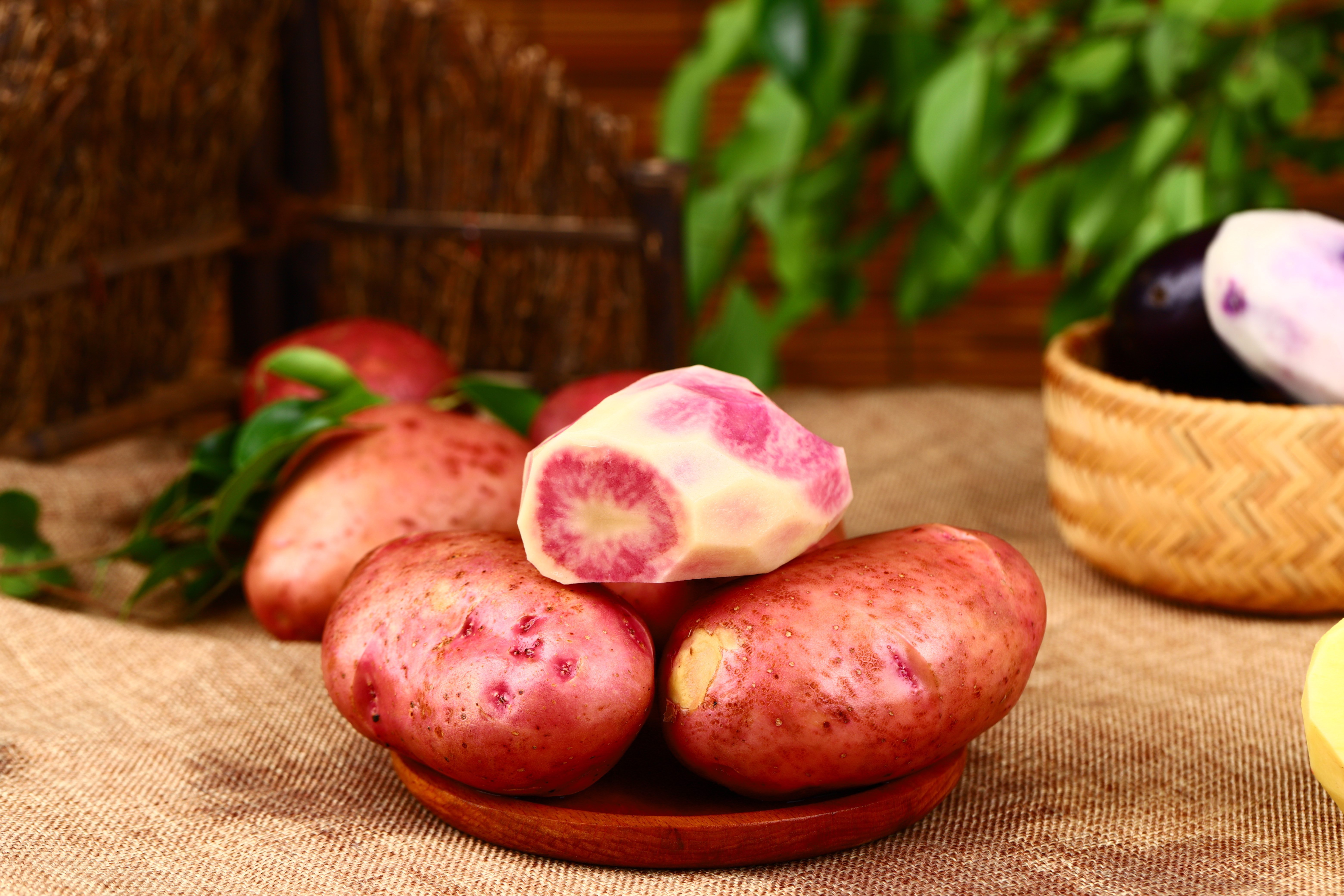 七彩土豆是丽江高海拨地区长期生长的“土著”马铃薯品种,因其切开时里面白里透着紫红的颜色,被戏称其“花心洋芋”