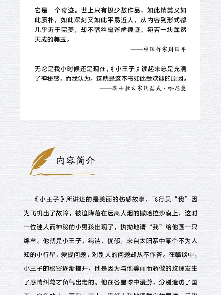 《小王子》所讲述的是美丽的伤感故事,飞行员“我”因为飞机出了故障,被迫降落在远离人烟的撒哈拉沙漠上,这时一位迷人而神秘的小男孩出现了,执拗地请“我”给他画一只绵羊。他就是小王子,纯洁、忧郁,来自太阳系中某个不为人知的小行星,爱提问题,对别人的问题却从不作答。在攀谈中,小王子的秘密逐渐揭开,他是因为与他美丽而骄傲的玫瑰发生了感情纠葛才负气出走的。他在各星球中漫游,分别造访了国王、自负的人、酒鬼、商人、掌灯人和地理学家的星球,后降临到地球上,试图找到疏解孤独和痛苦的良方,小王子结识了狐狸,同狐狸建立了友谊,也从狐狸那里学到了人生的真谛。他决定回到他的玫瑰那里去,但是他的躯壳是难以带走的,于是他决定求助于那条30秒钟内就能致人于死地的毒蛇……