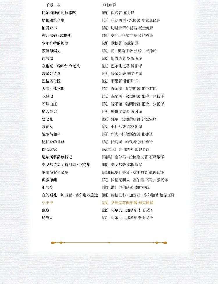 第一辑30种:《伊索寓言》《一千零一夜》《托尔梅斯河的拉撒路》《培根随笔全集》《伯爵家书》《弃儿汤姆•琼斯史》《少年维特的烦恼》《傲慢与偏见》《红与黑》《欧也妮•葛朗台 高老头》《普希金诗选》《巴黎圣母院》《大卫•考坡菲》《双城记》《呼啸山庄》《猎人笔记》《恶之花》《茶花女》《战争与和平》《德伯家的苔丝》《伤心之家》《尼尔斯骑鹅旅行记》《泰戈尔诗集:新月集•飞鸟集》《生命与希望之歌》《孤寂深渊》《泪与笑》《血的婚礼:加西亚•洛尔迦戏剧选》《小王子》《鼠疫》《局外人》。
