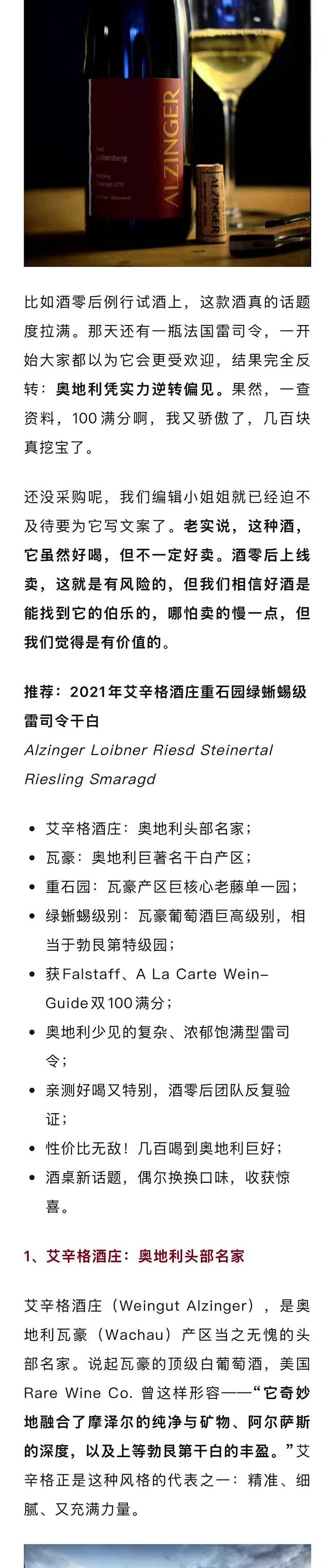 【双100分】奥地利瓦豪2021年艾辛格酒庄重石园绿蜥蜴级雷司令干白