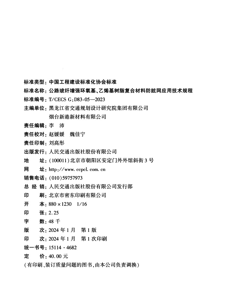 书名:公路玻纤增强环氧基、乙烯基树脂复合材料防眩网应用技术规程(T/CECS G:D83-05—2023)
