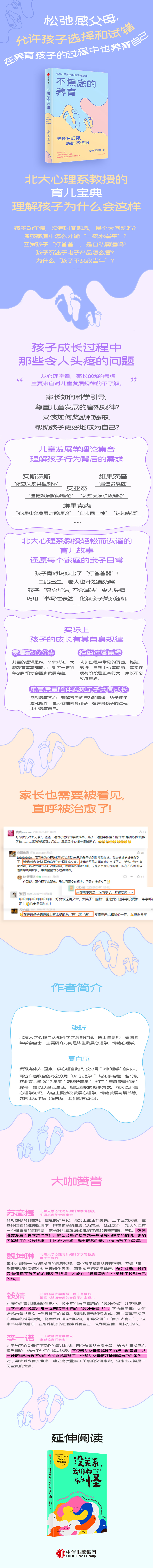 对于当下的父母们正面临的育儿挑战,两位作者从自身出发,结合儿童发展心理学理论,给出了他们的解决路径。《不焦虑的养育》不仅帮助父母理解孩子的行为和需求,以一种更加科学和系统的方式来养育孩子,也帮助父母更好地理解自己的角色。对于寻求减少育儿焦虑、建立高质量亲子关系的父母来说,这本书无疑是一份宝贵的资源。